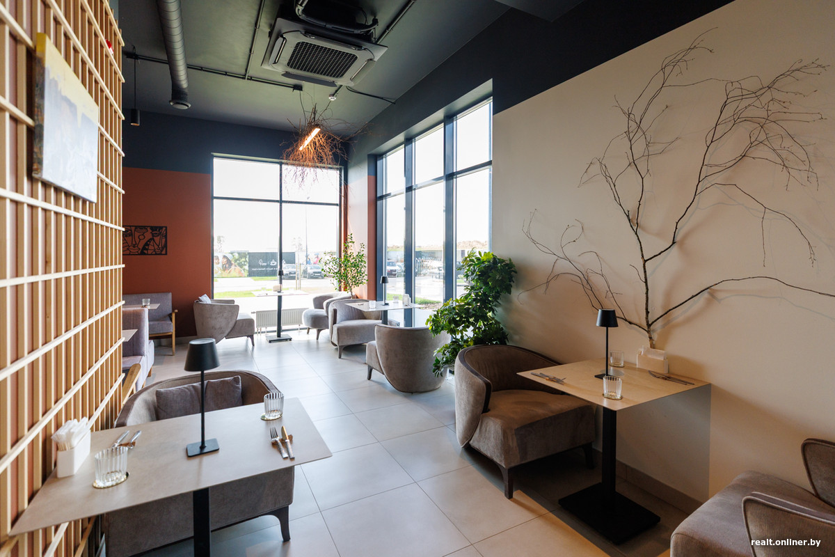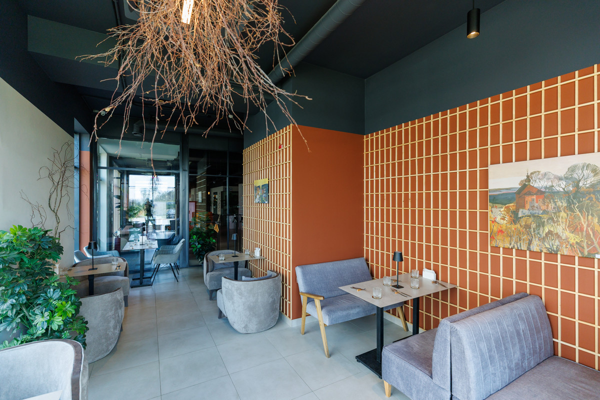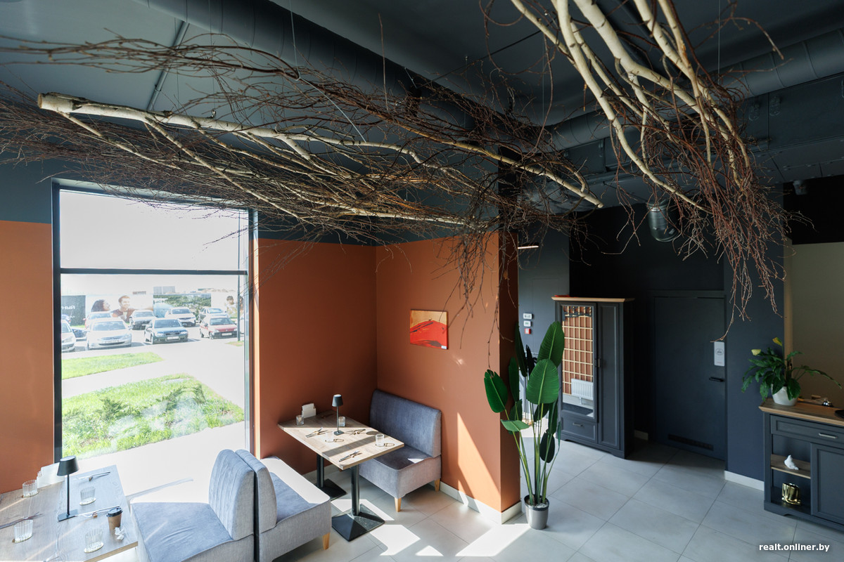 Рядом с кафе находится парк с березами. Эта природная локация также подсказала выбор некоторых деталей интерьера: