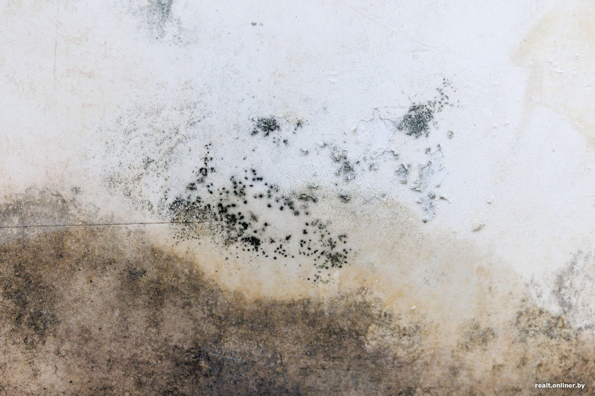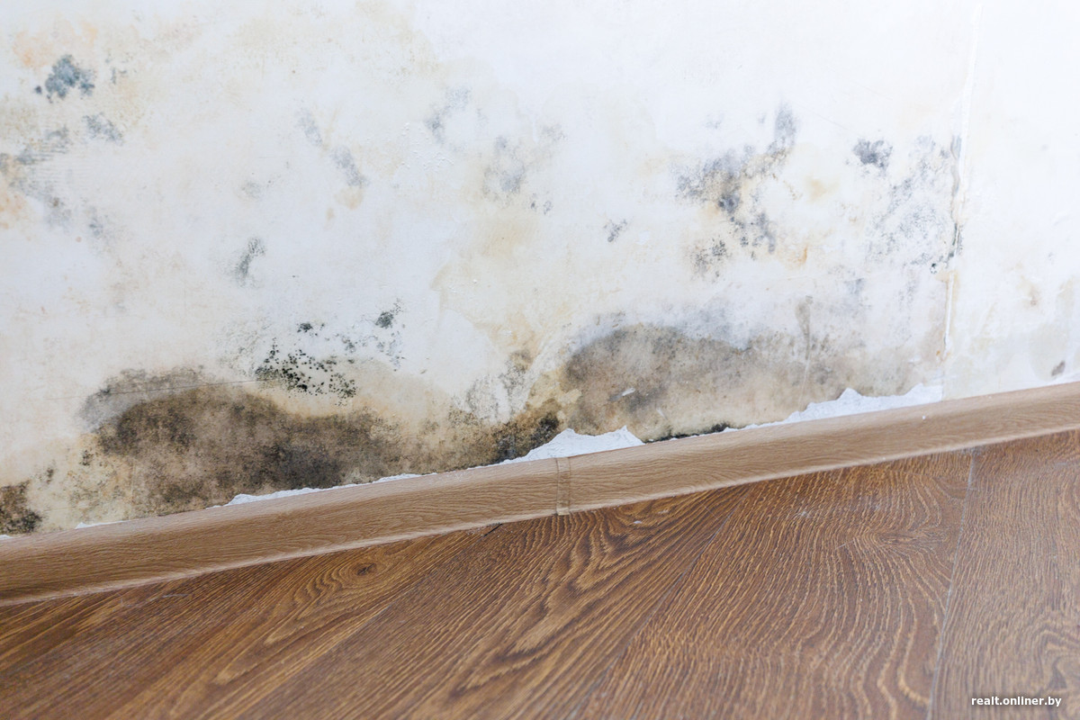 Под обоями, конечно, та еще картина: грибок высыпал по низу всей стены, разделяющей кухню и спальню.