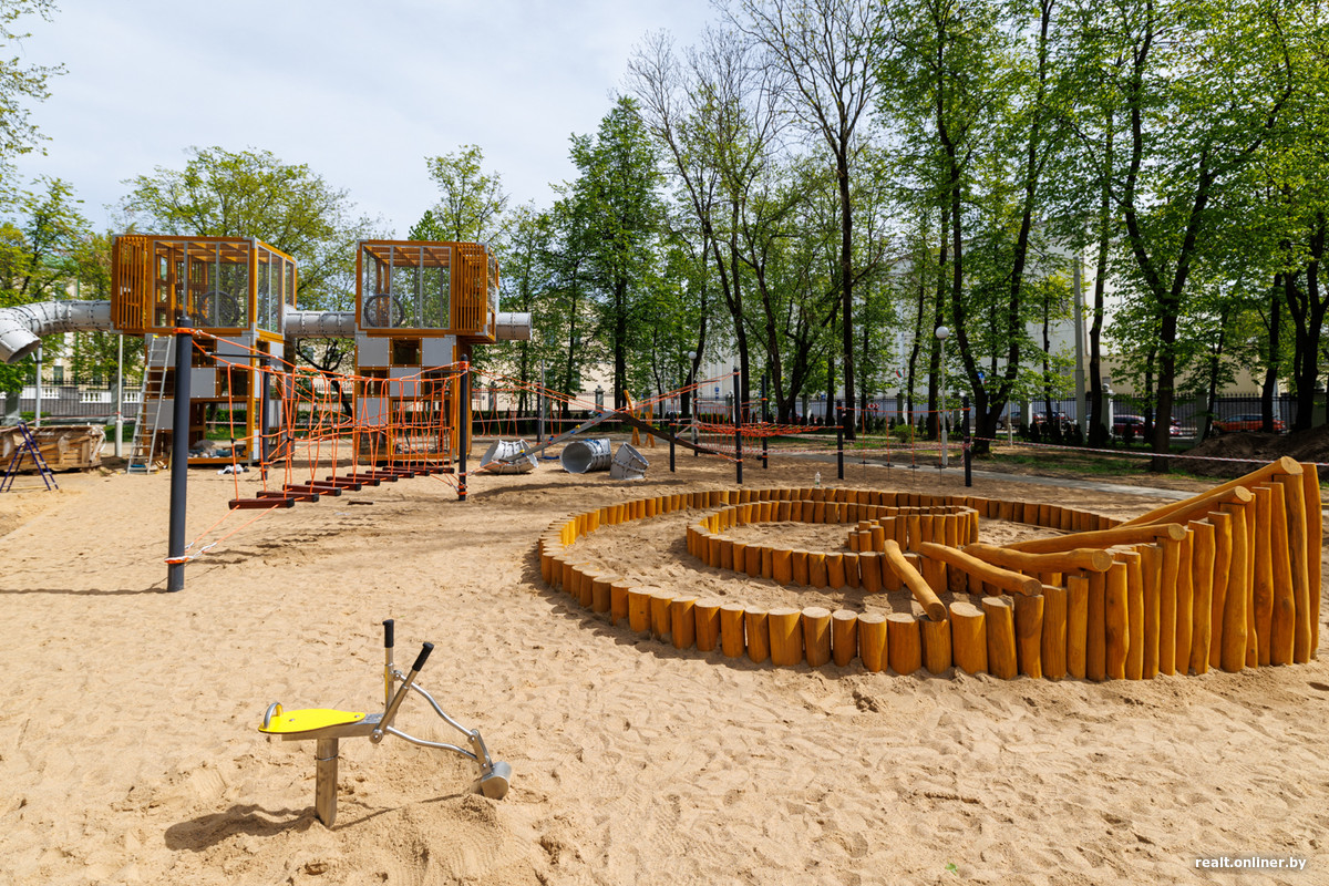 И посмотрите, какая песочница! Тут уж точно места хватит всем. Надоело копаться? Иди к веревочному городку: препятствия на любой вкус.