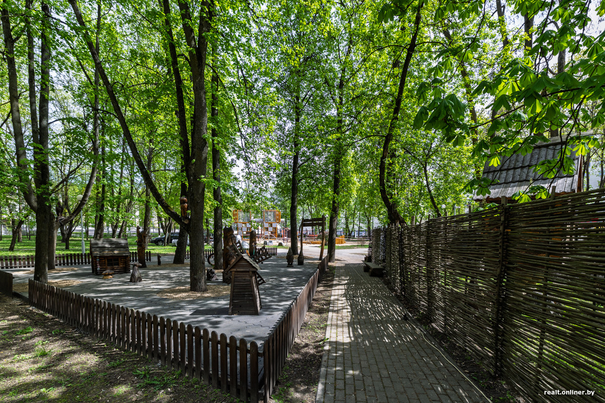 Рядом с современной детской площадкой расположен объект из другой «игровой вселенной»: царство Бабы-яги. Аутентичное, деревянное, нарочито грубое. И... уже облюбованное детьми. Далеко не весь почет достается пластику.