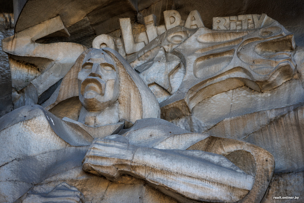 На стыке проспекта Победителей и улицы Немиги есть барельеф, который можно назвать одной из самых узнаваемых скульптур Минска. Решительно идущие вперед люди, слово solidarity над головами. В праздник, который известен еще и как День солидарности трудящихся, Onlíner поднял голову вверх, рассмотрел композицию в деталях, поговорил со скульптором, автором барельефа Анатолием Артимовичем и узнал, о чем и как создавалась эта работа.