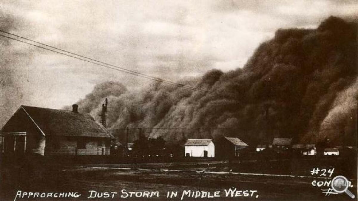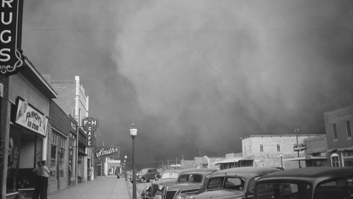 Первая пылевая буря случилась в Оклахоме 14 сентября 1930 года. Она напоминала песчаную бурю, характерную для пустынь, но отличалась цветом. Вместо желто-оранжевых облаков на ошарашенных такой метеорологической аномалией фермеров неслись черные или темно-серые облака. Это был тот самый некогда плодородный слой почвы, задерживать который было уже нечем. Иссушенный жарой, превратившийся в мелкую пыль, он поднимался в воздух ветром и отправлялся в путь на сотни и тысячи километров, оставляя за собой пустыню.