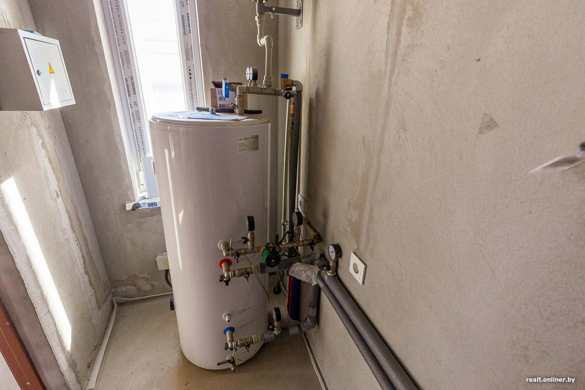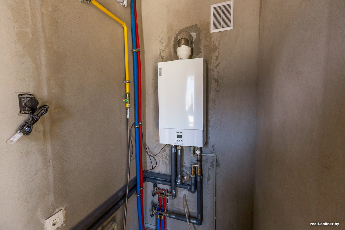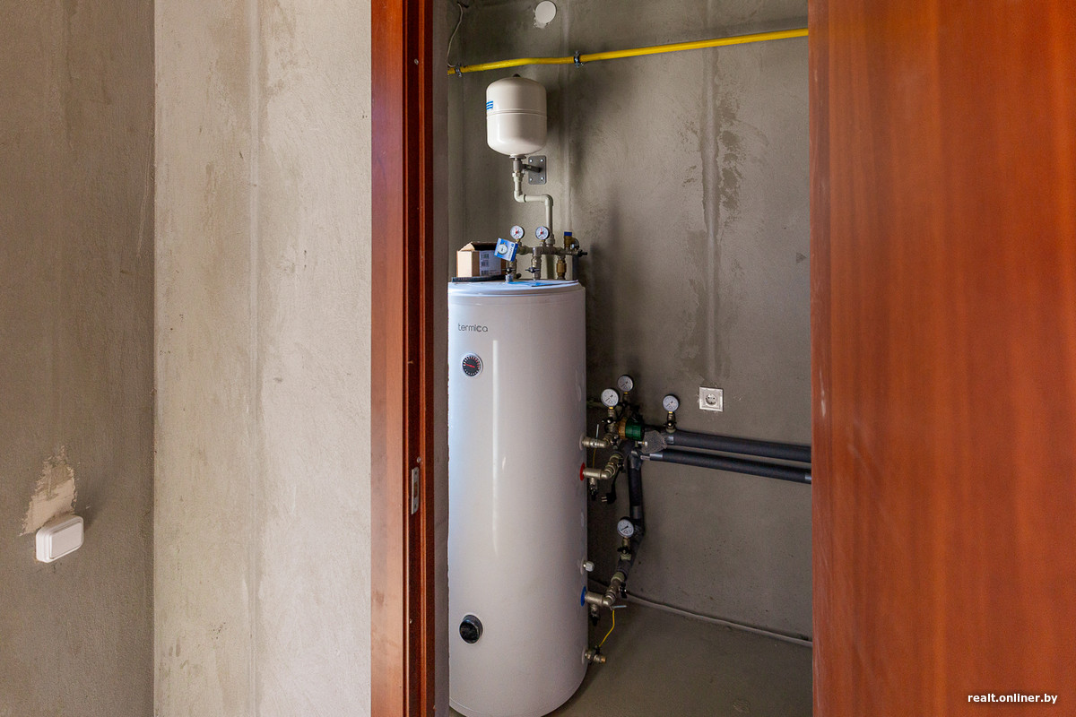 На первом этаже кроме гостиной и кухонной зоны есть топочная — необходимая опция для частных домов. Теплом жильцов будет обеспечивать газовый котел, а горячей водой — бойлер. Объем бойлера — 200 литров, то есть он специально рассчитан на комфортное обслуживание семьи из четырех человек.