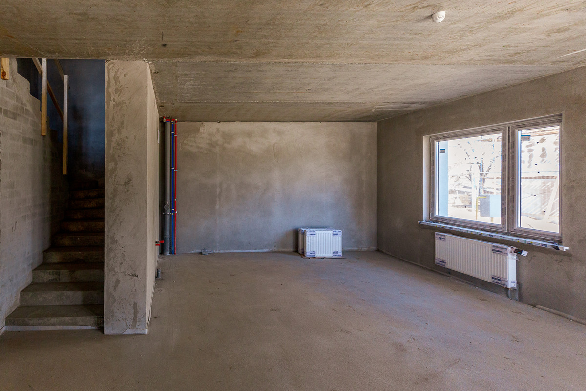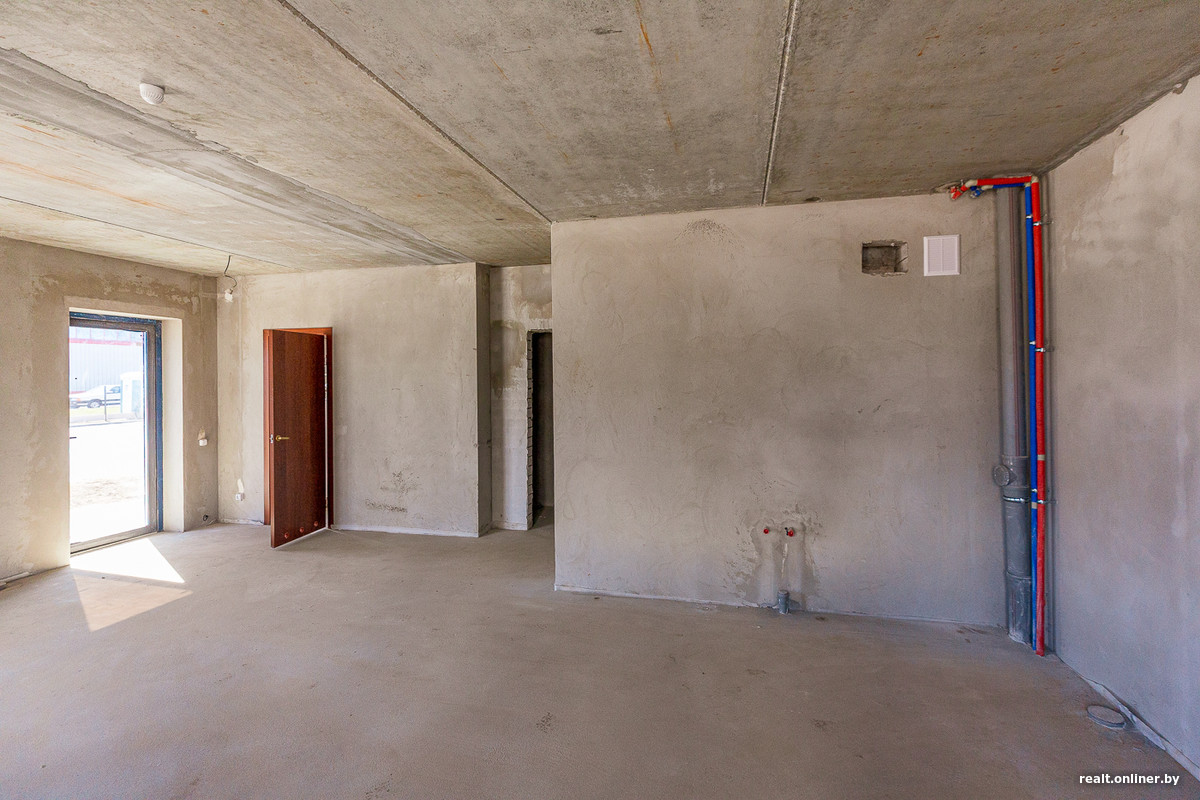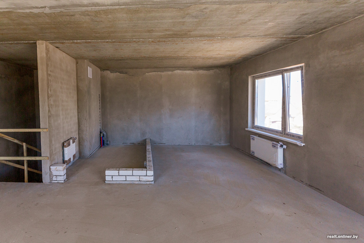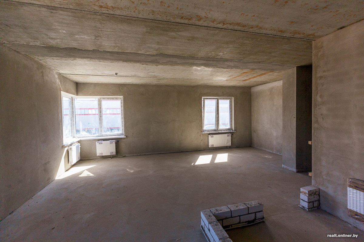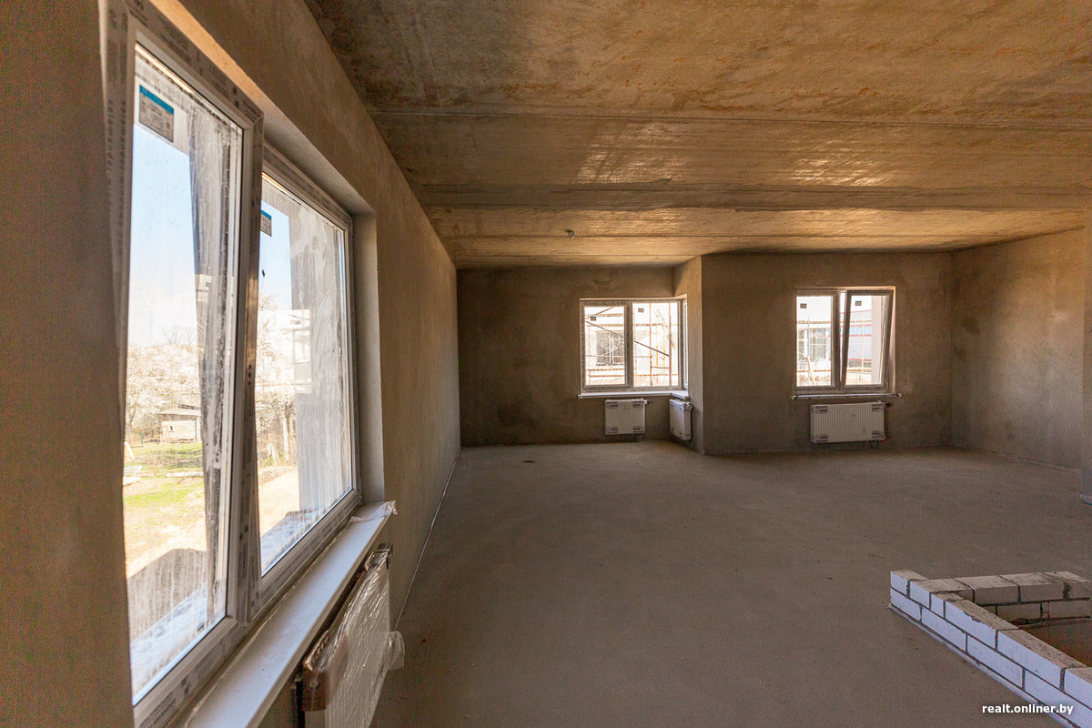 Заходим в жилье площадью 92,11 «квадрата» и сразу попадаем в 35-метровую гостиную зону. Отделка в помещениях черновая, однако коммуникации разведены, установлены пожарные извещатели и смонтированы радиаторы. Разводку электрики будущие жильцы будут делать сами. Окна не панорамные, однако дневного света попадает достаточно. Высота потолков на первом этаже — 2,7 метра.