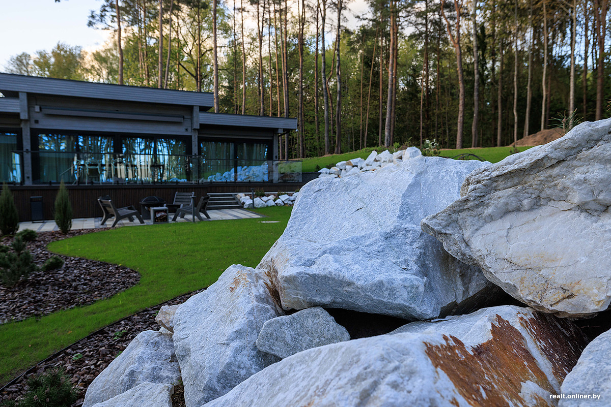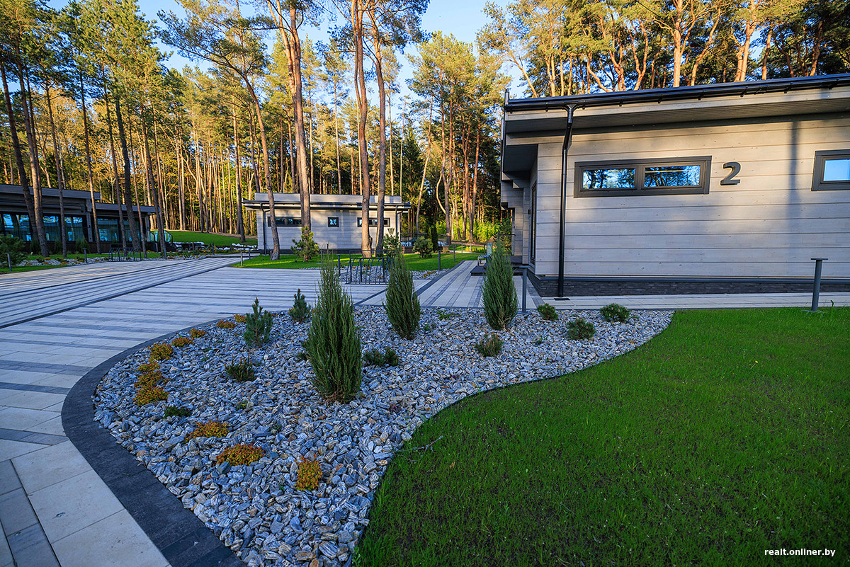 На побережье выстроились пять аккуратных домиков с окнами в пол и террасами. Территорию вокруг уже успели облагородить: появились лужайки с газоном, вымощенные плиткой дорожки, декоративные растения и инсталляции из камней, напоминающие скалистый морской берег. По периметру разбросаны фонарики и другие источники освещения: предполагаем, после заката здесь должно быть красиво и атмосферно.