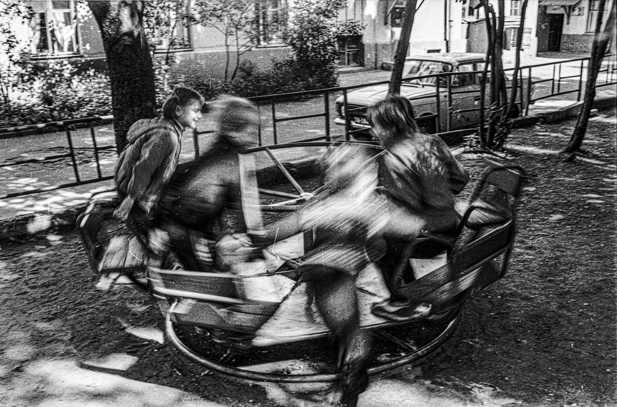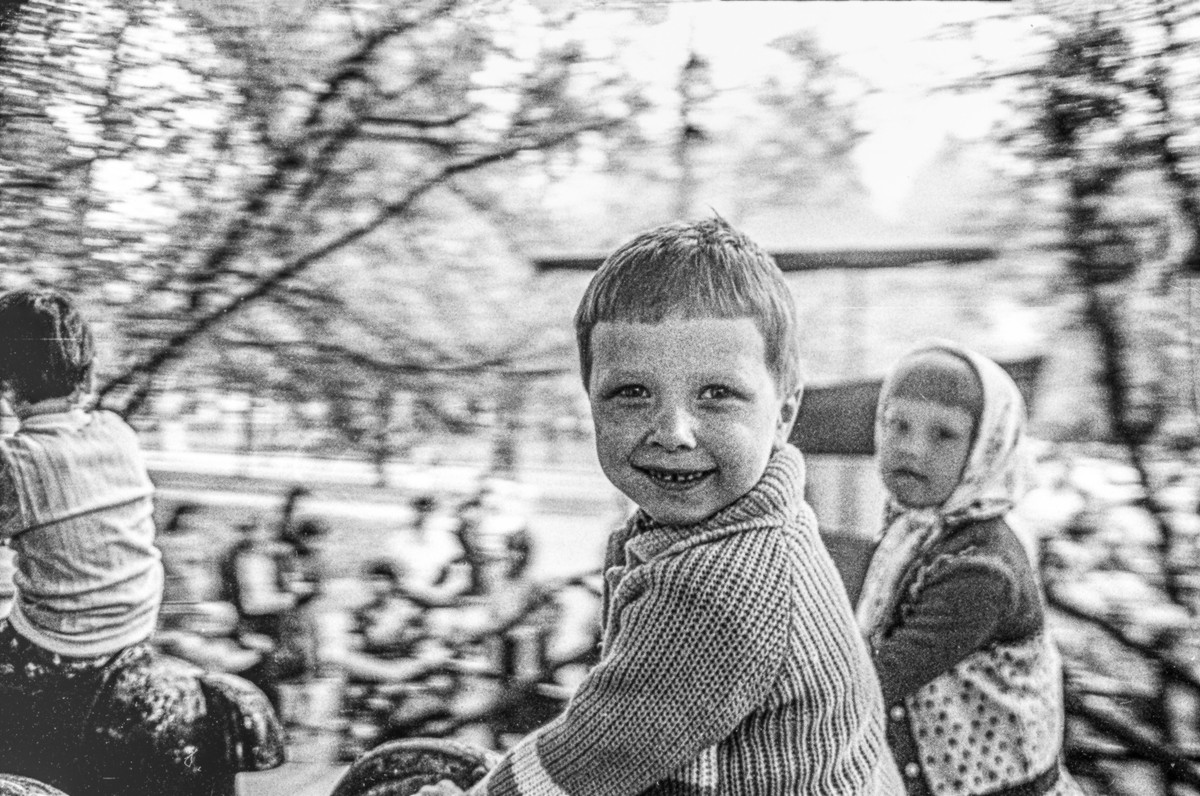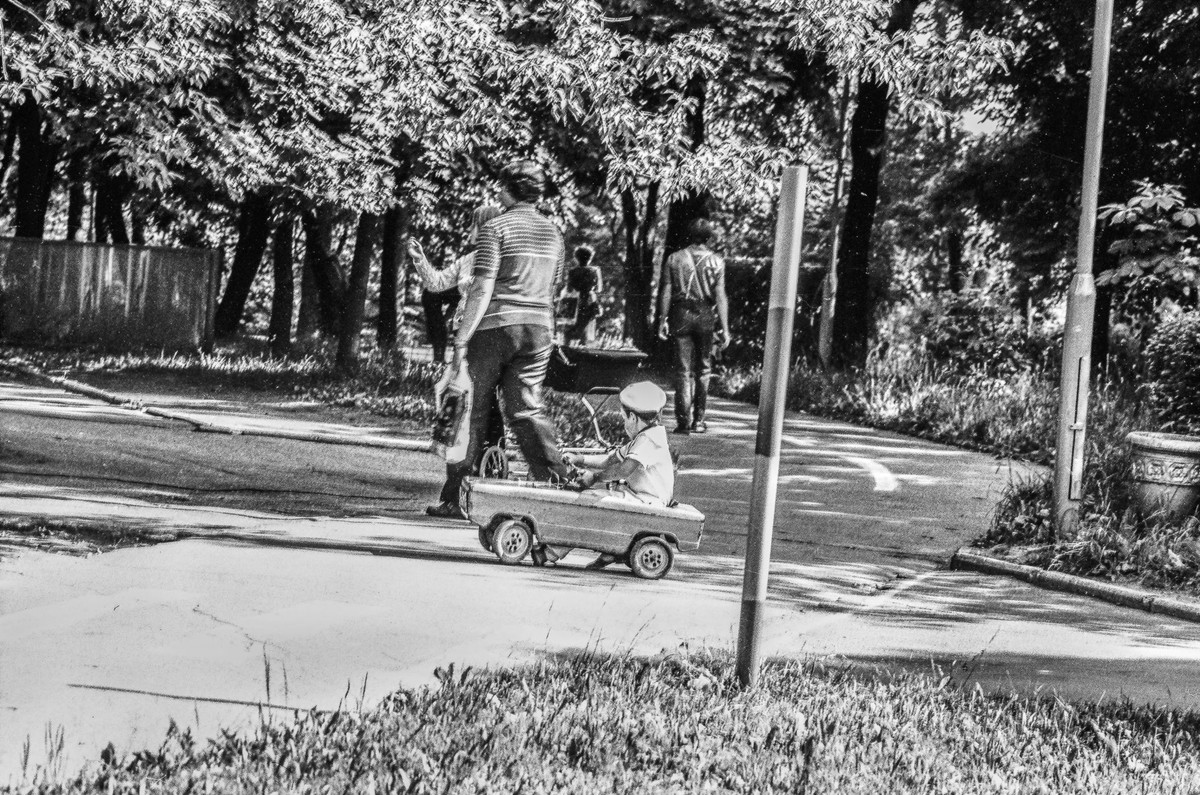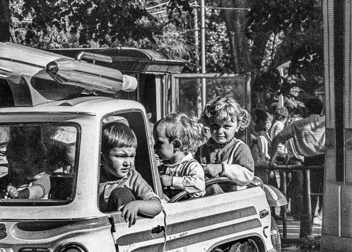 Помимо парка Горького на черно-белую пленку попали парки Челюскинцев и 50-летия Октября. Помните машинки, которые двигались, пока крутишь педали? Встречались экземпляры авто и посовременнее.  На одном из снимков позади довольных детей можно заметить, вероятно, чуть менее довольных родителей — в очереди за билетами на аттракционы.
