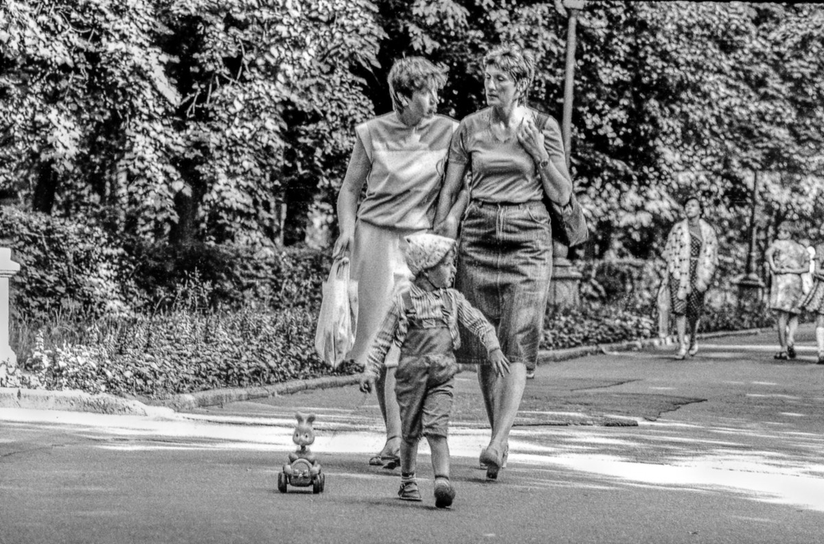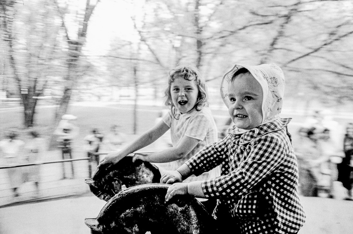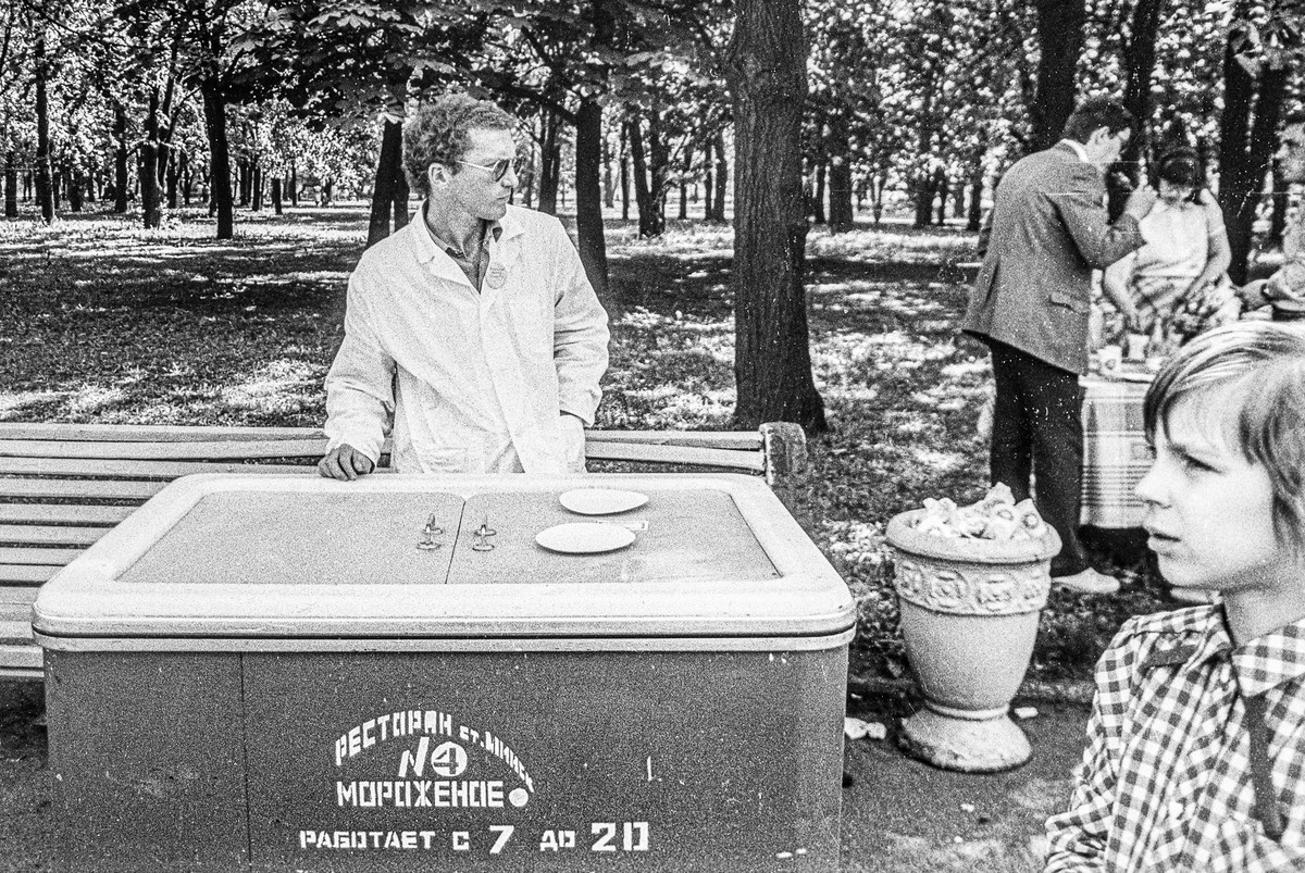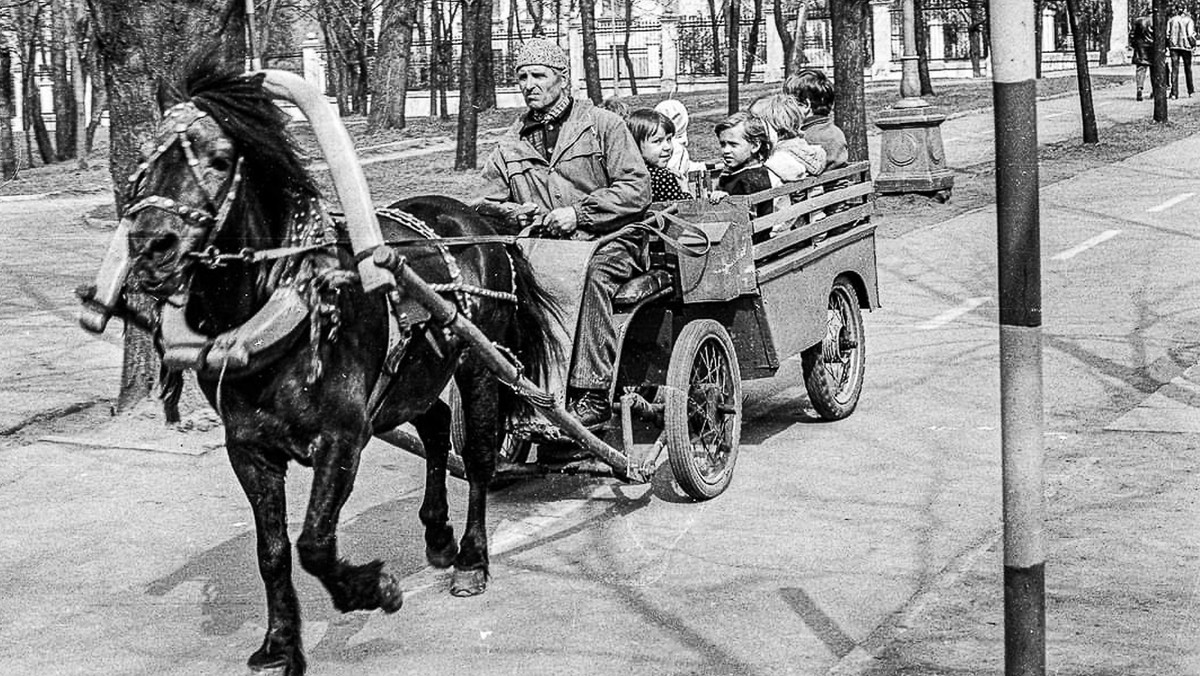Помимо парка Горького на черно-белую пленку попали парки Челюскинцев и 50-летия Октября. Помните машинки, которые двигались, пока крутишь педали? Встречались экземпляры авто и посовременнее.  На одном из снимков позади довольных детей можно заметить, вероятно, чуть менее довольных родителей — в очереди за билетами на аттракционы.