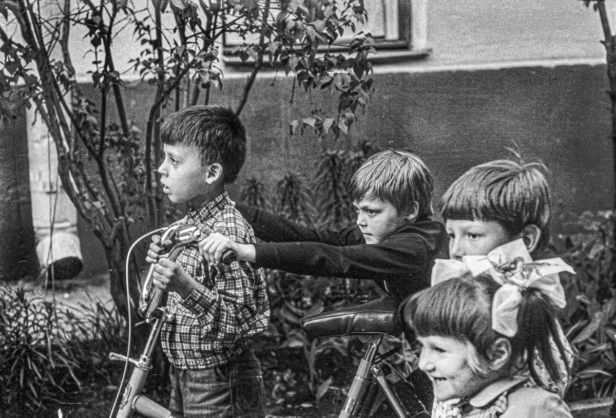 — Это велосипедисты в Боровой, под Минском, — говорит Вадим Качан про некоторые снимки. — Велосипедистов я фотографировал часто, прямо у нас во дворе был велоклуб спортивного общества «Буревестник». Он был студенческим, но там занимались и школьники. Домоуправление выделило ребятам подвал для «базы». За город дети выезжали на соревнования.