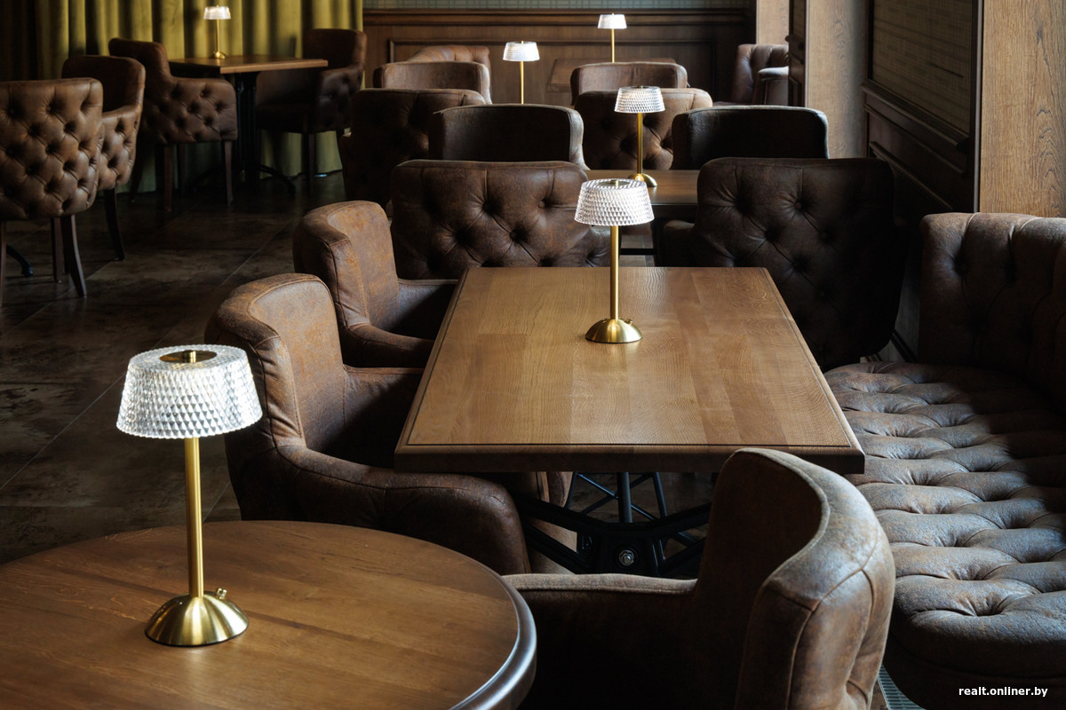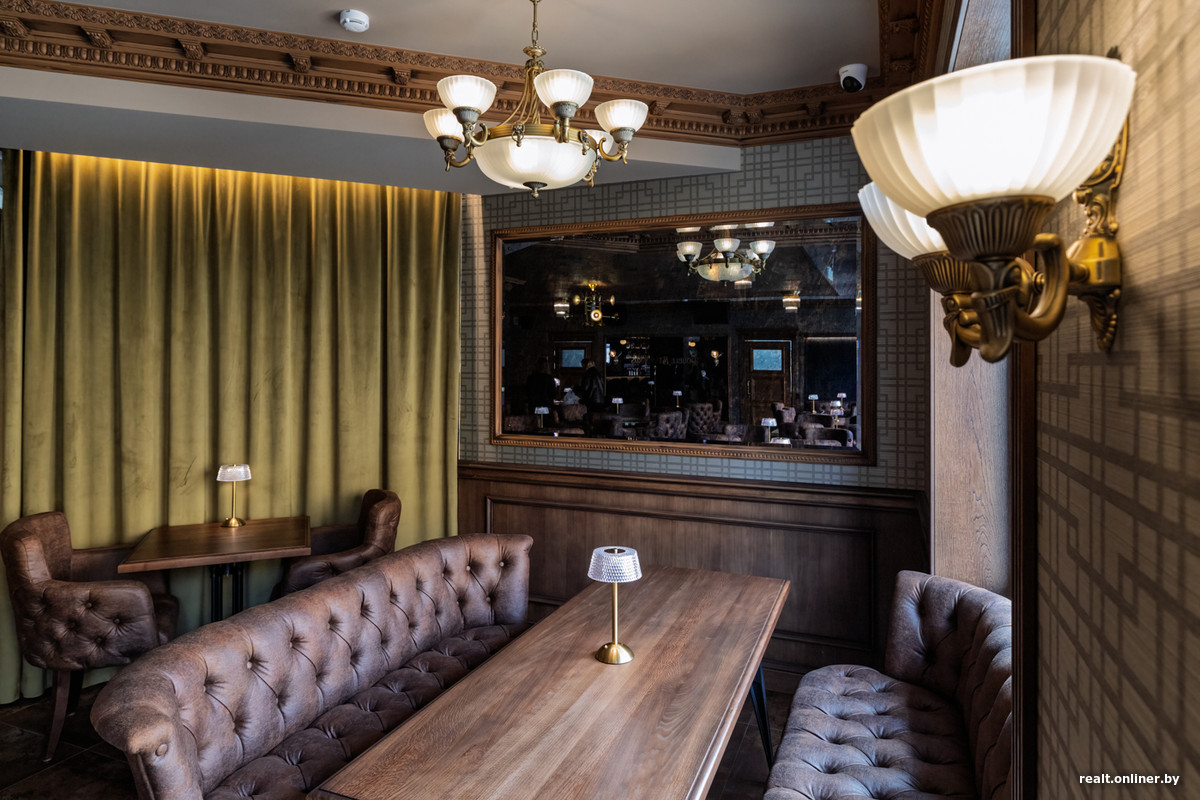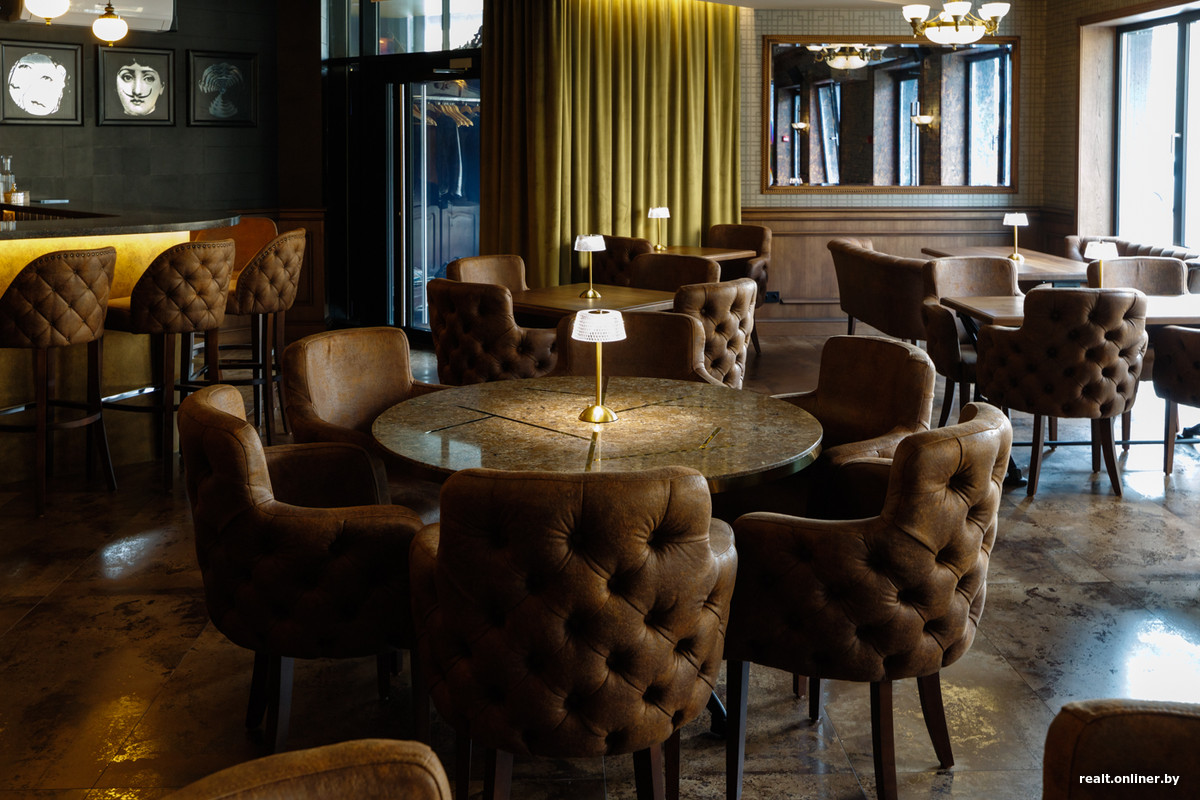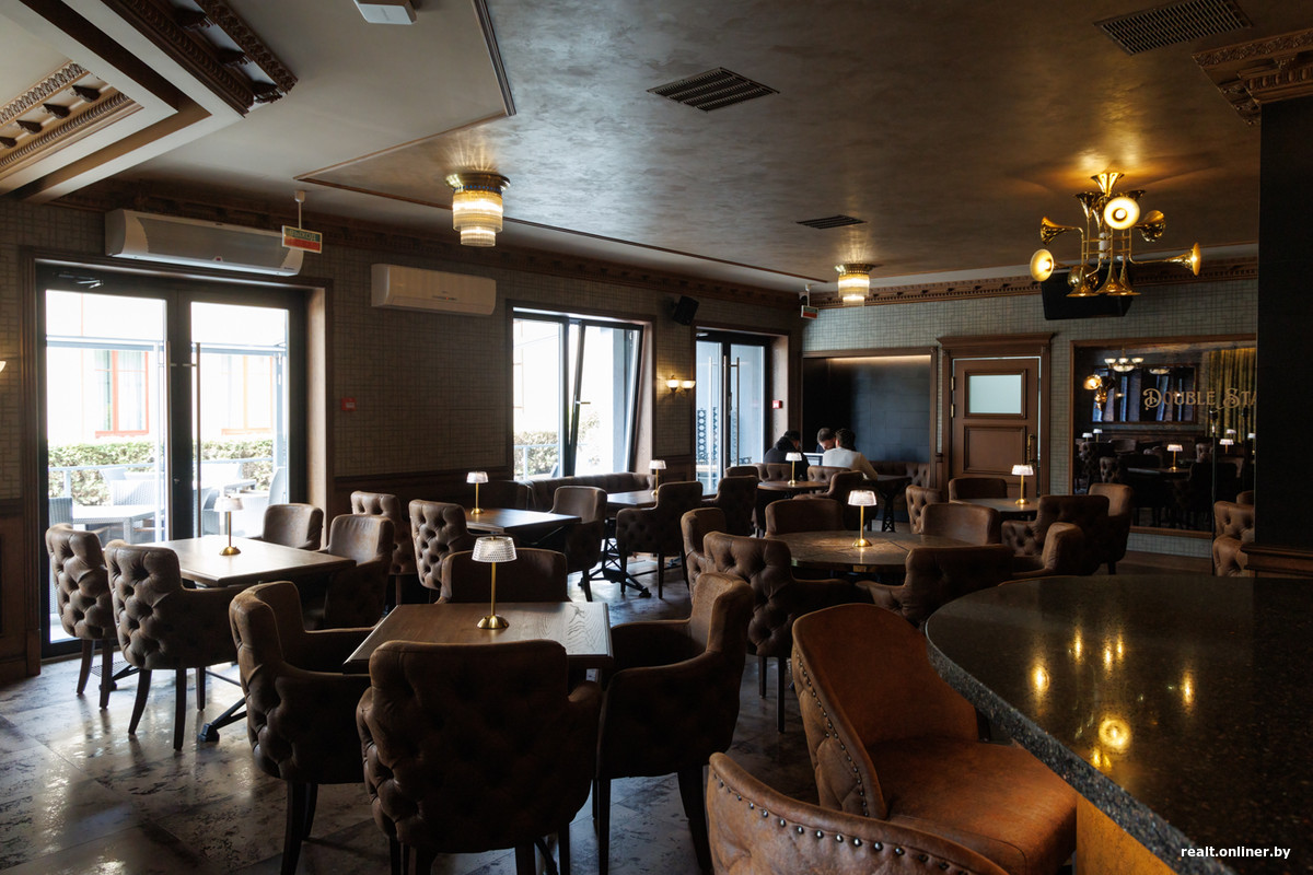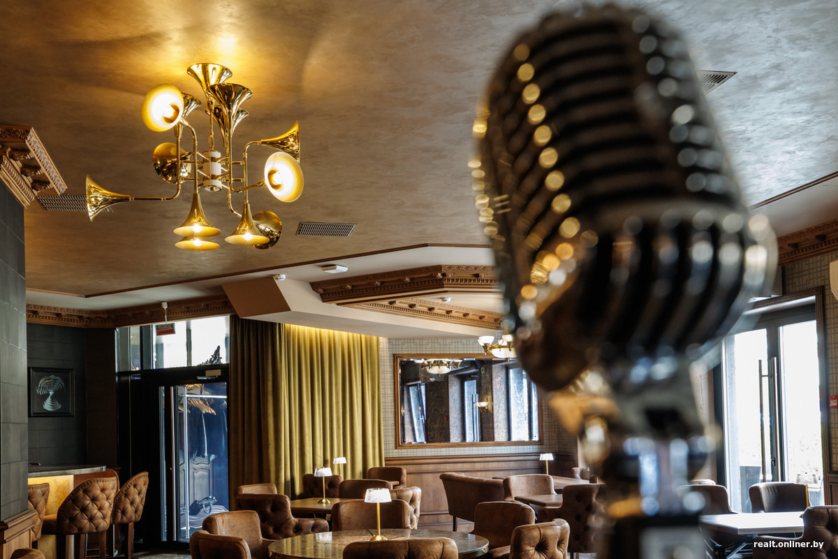 — Интерьер получился также классически нью-йоркским: много дерева, резной дуб, барная стойка, бутылки, мебель с каретной стяжкой, кожа. Темно, приватно, светильники на столах. Очень долго подбирались люстры, которые должны были быть в таком джазовом стиле.