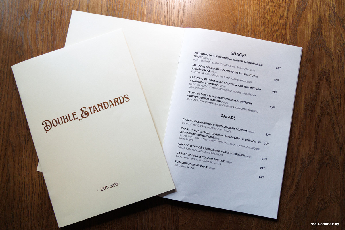 На данный момент рестобар Double Standards в будние работает с 16:00 до 02:00, в выходные — с 16:00 до 04:00. Возможно, со временем добавится и дневной формат работы с обедами и ланчами. С пятницы по воскресенье здесь будет живая музыка.
