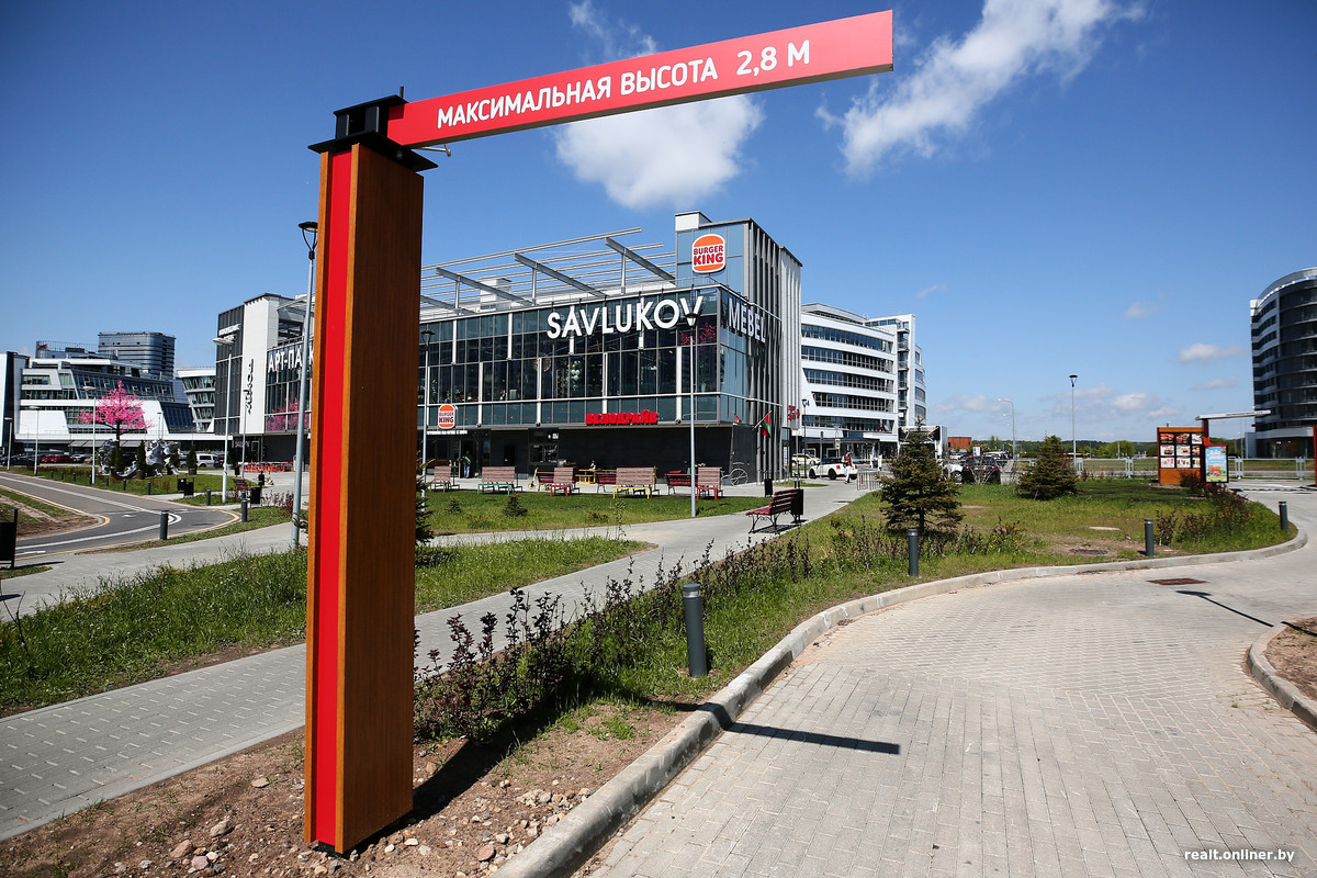 Территория для велолюбителей располагается со стороны проспекта Победителей, а на обратной стороне здания сделали автодрайв. Заехать сюда можно с улицы Тихой, а выехать — непосредственно в сторону МКАД или обратно в центр города.
