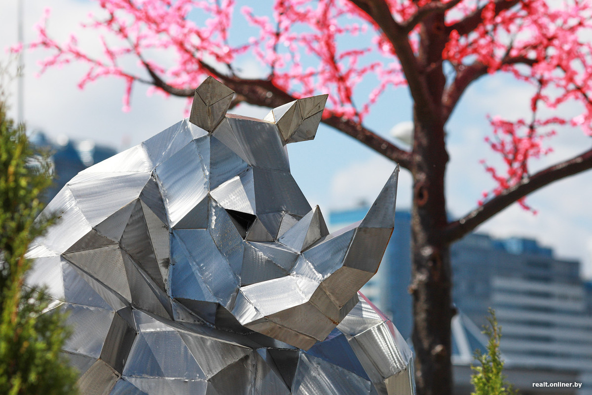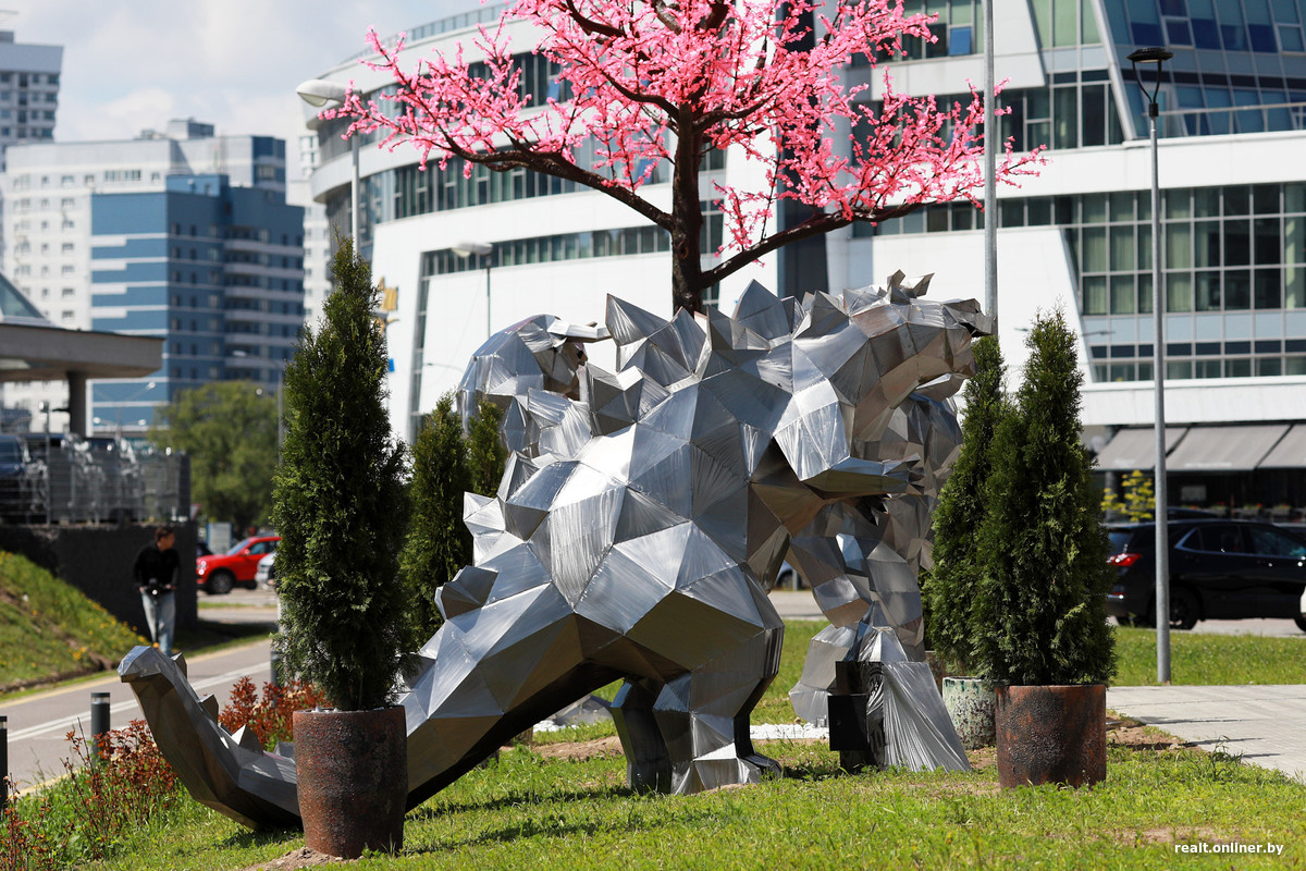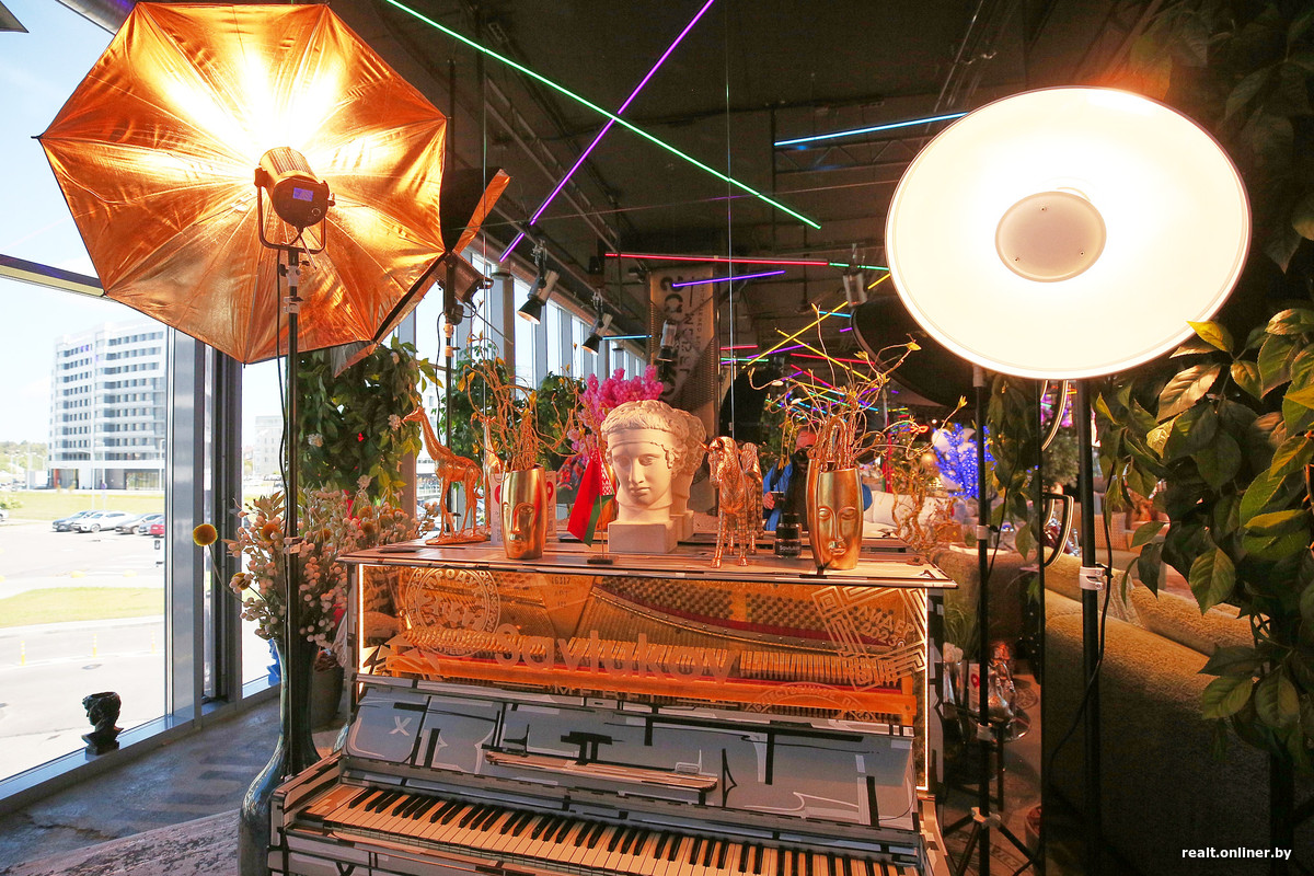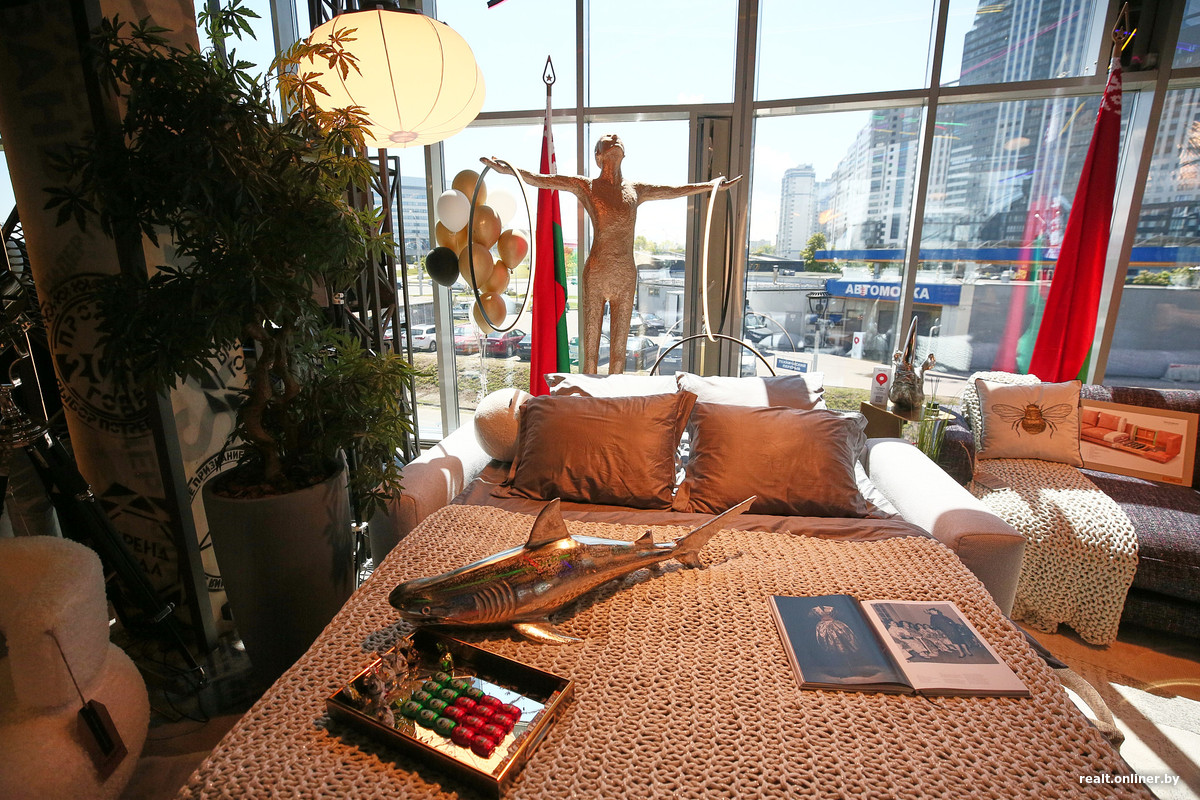 На зеленой зоне можно заметить арт-композицию в виде серебряных скульптур. Это завлекаловка, созданная третьим арендатором здания: почти весь второй этаж занят шоурумом белорусского производителя диванов Savlukov. Застройщик в свою очередь отмечает, что претендентов на арендные площади второго этажа с панорамным остеклением и видом на Дрозды было немало, в их числе — общепит и даже медцентр.