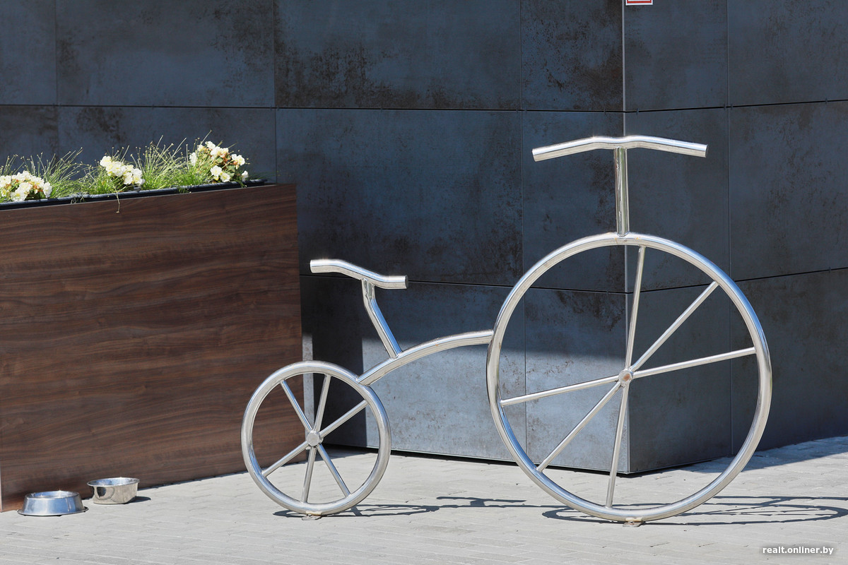 Ну а после этого есть возможность перекусить на террасе со столиками. Застройщик разместил здесь новую для столицы придумку — так называемые «велостолы»: поесть можно даже не слезая с велосипеда. Если такой формат не подходит, то присаживайтесь на лавочку с видом на проспект.