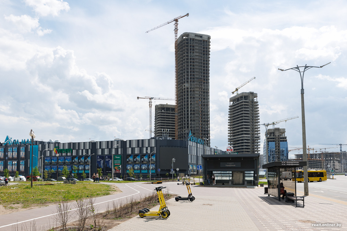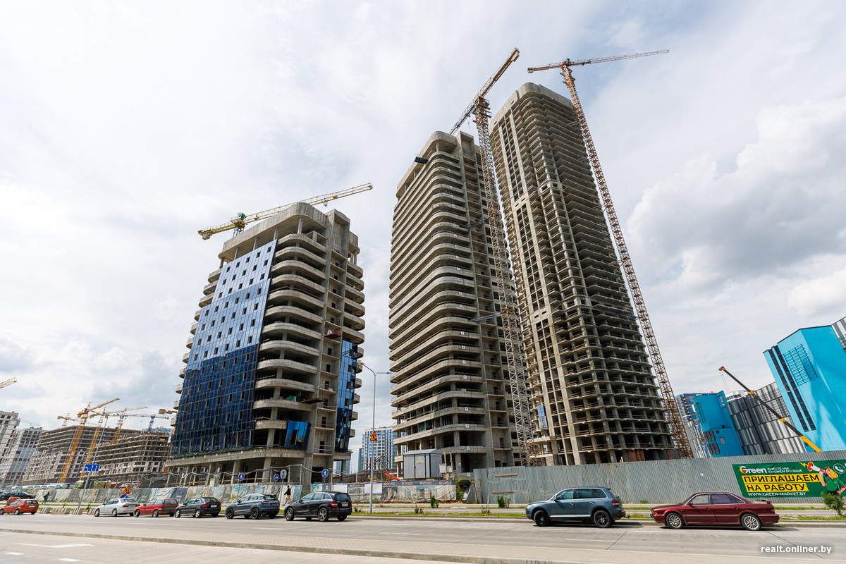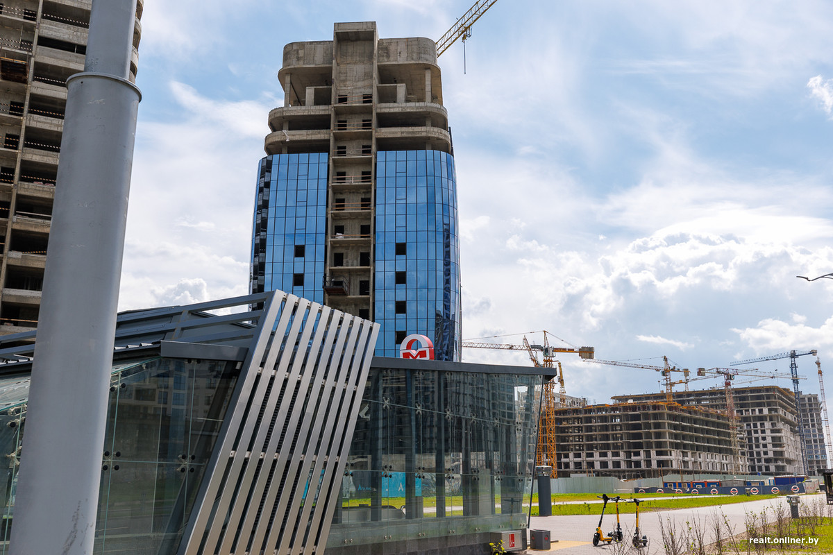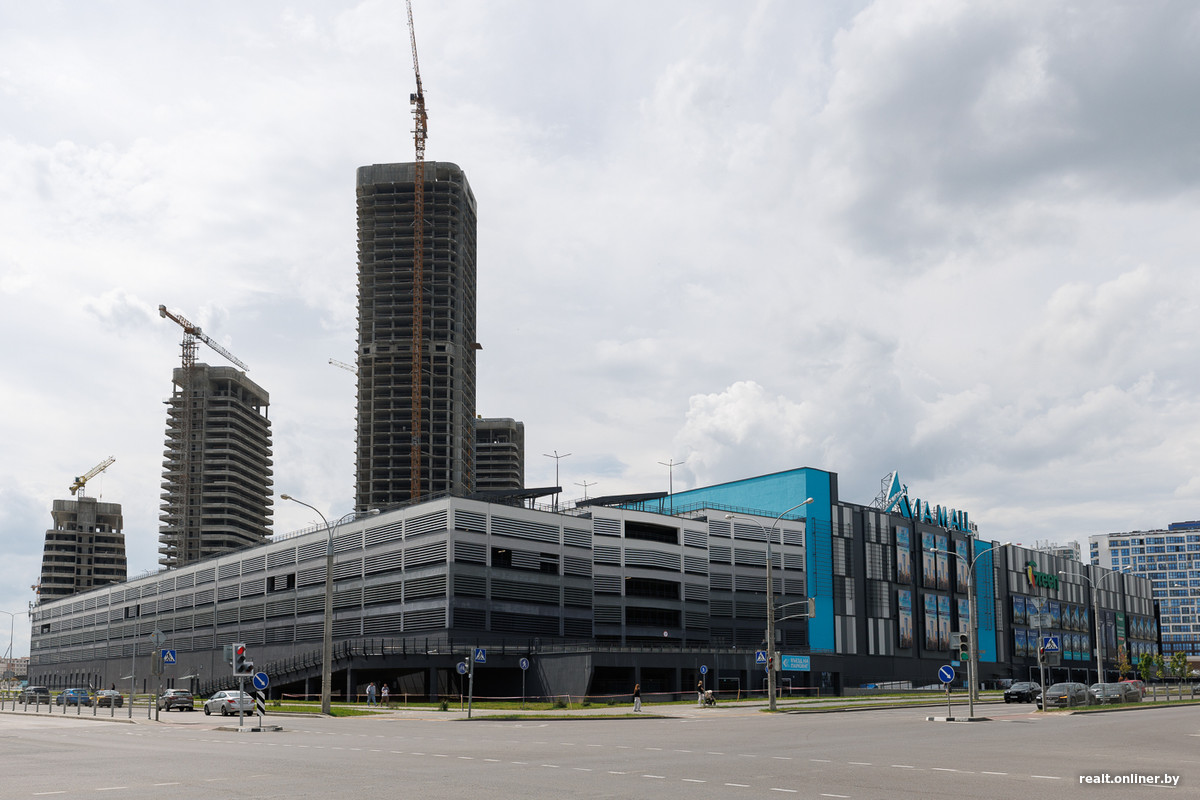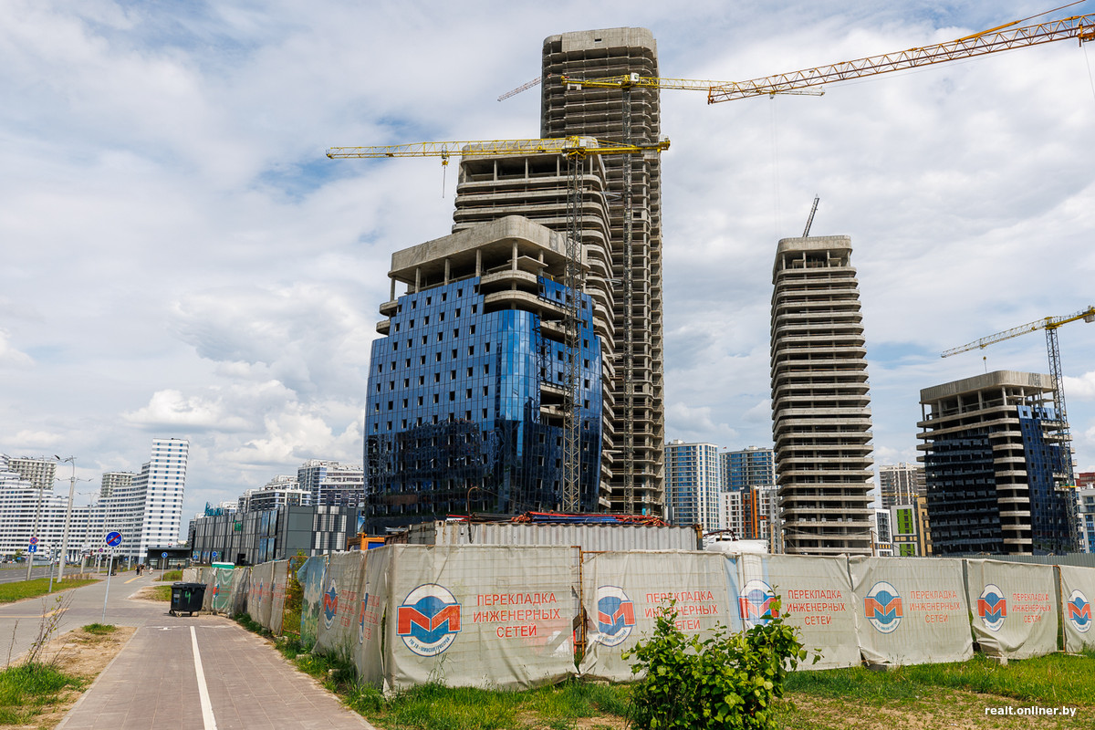 Возле метро и торгового центра застройщик выделил территорию для важных объектов — пяти стекляшек Международного финансового центра, в которых разместятся офисы, административные помещения и апартаменты. Главный небоскреб возвышается над землей на 42 этажа — он станет самым высоким в Минске. Сейчас башни находятся в процессе остекления. Но еще в 2023 году они лишь только начинали набирать высоту.