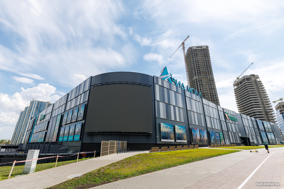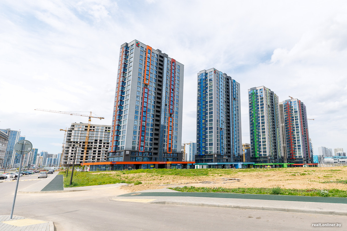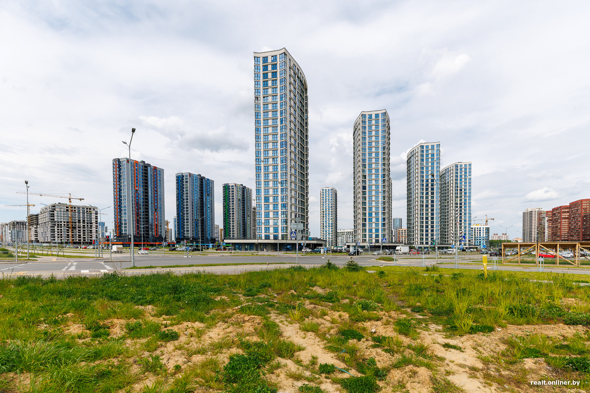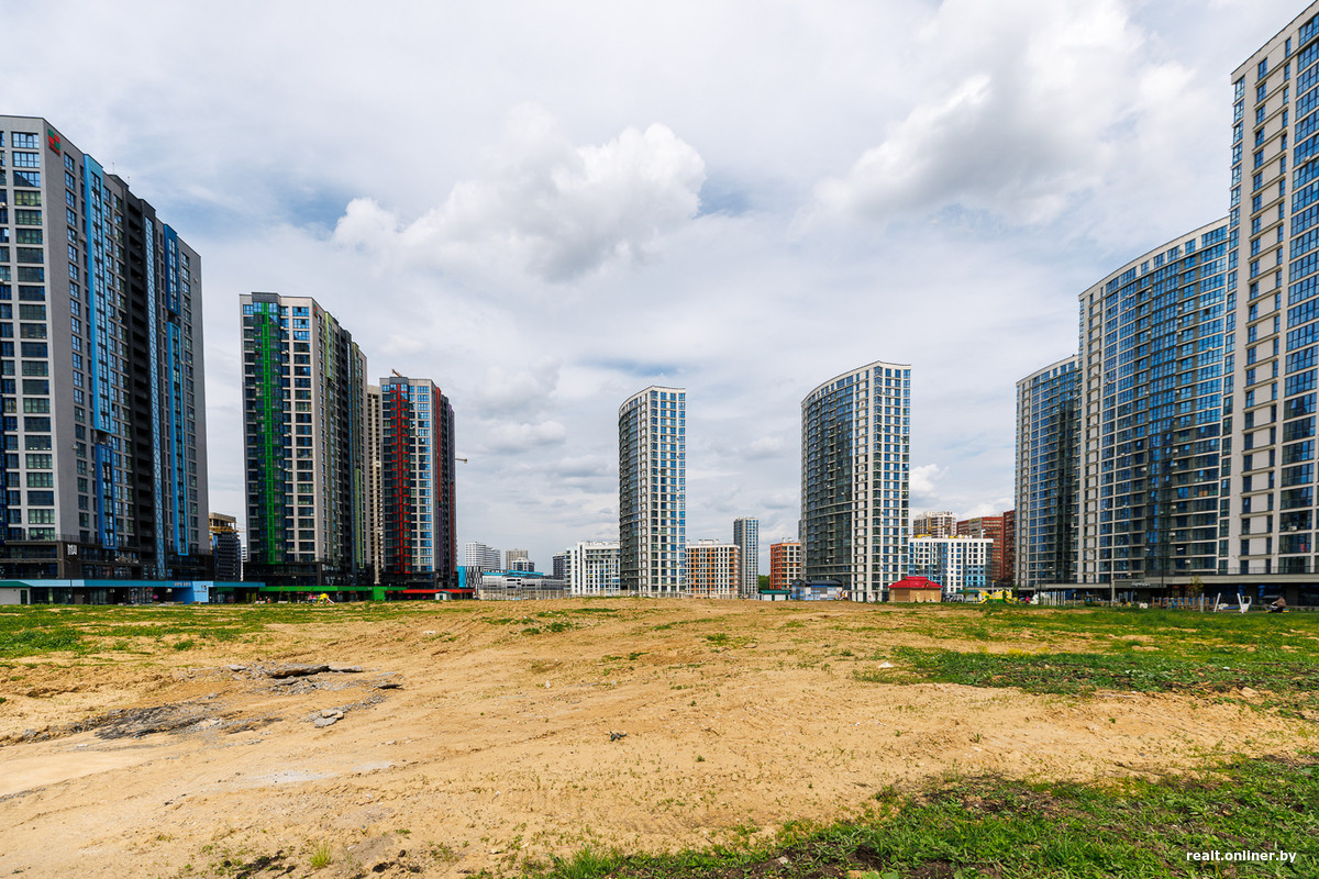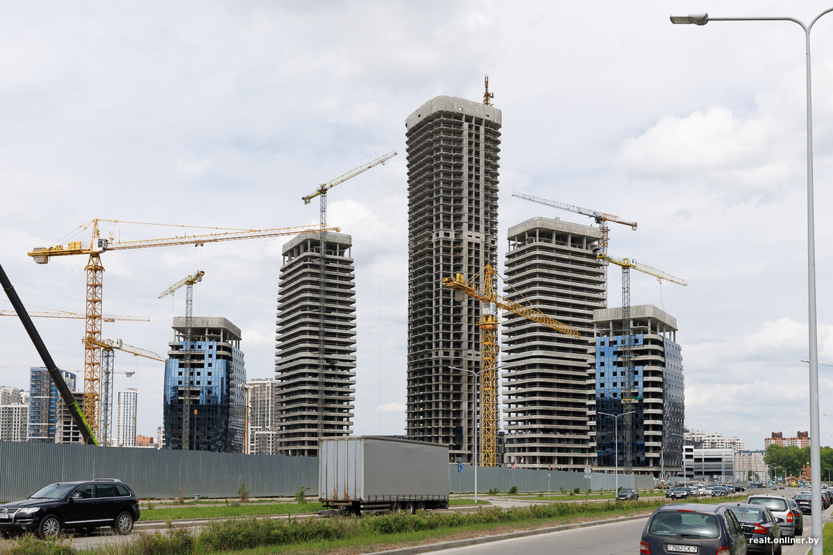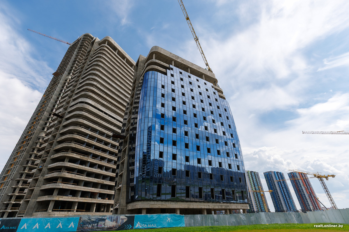 Возле метро и торгового центра застройщик выделил территорию для важных объектов — пяти стекляшек Международного финансового центра, в которых разместятся офисы, административные помещения и апартаменты. Главный небоскреб возвышается над землей на 42 этажа — он станет самым высоким в Минске. Сейчас башни находятся в процессе остекления. Но еще в 2023 году они лишь только начинали набирать высоту.