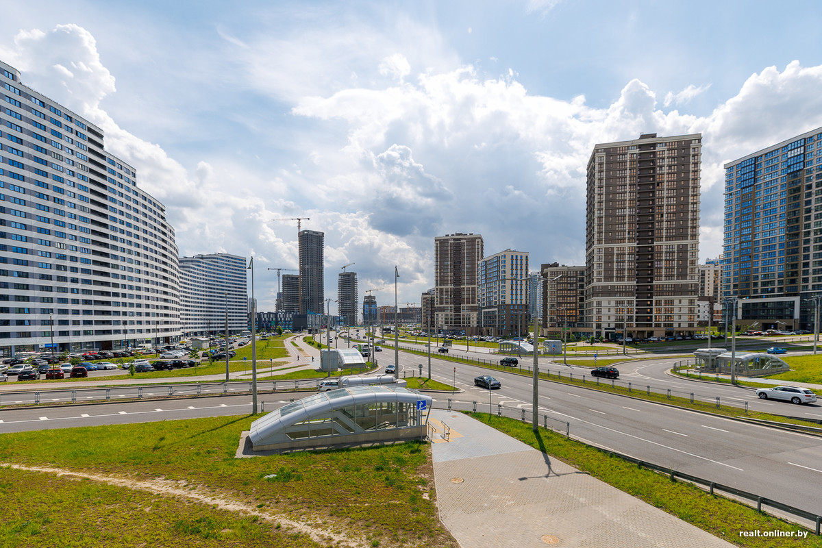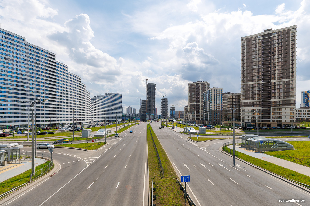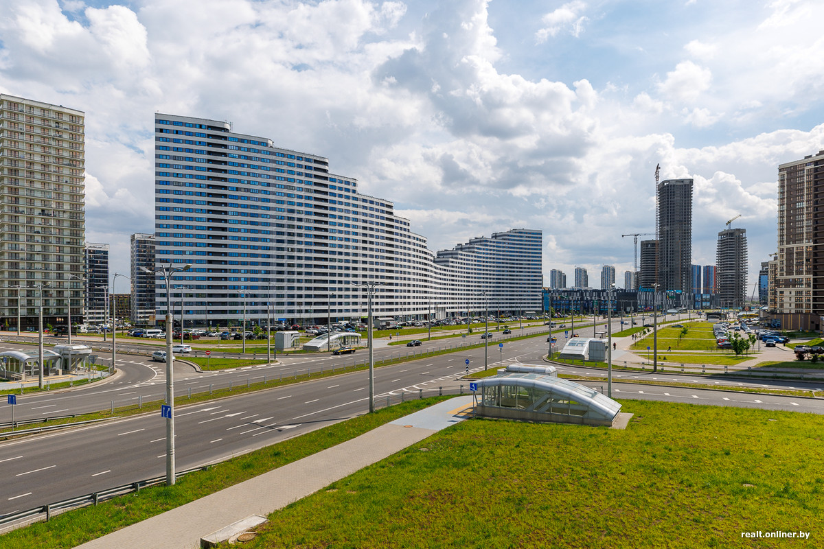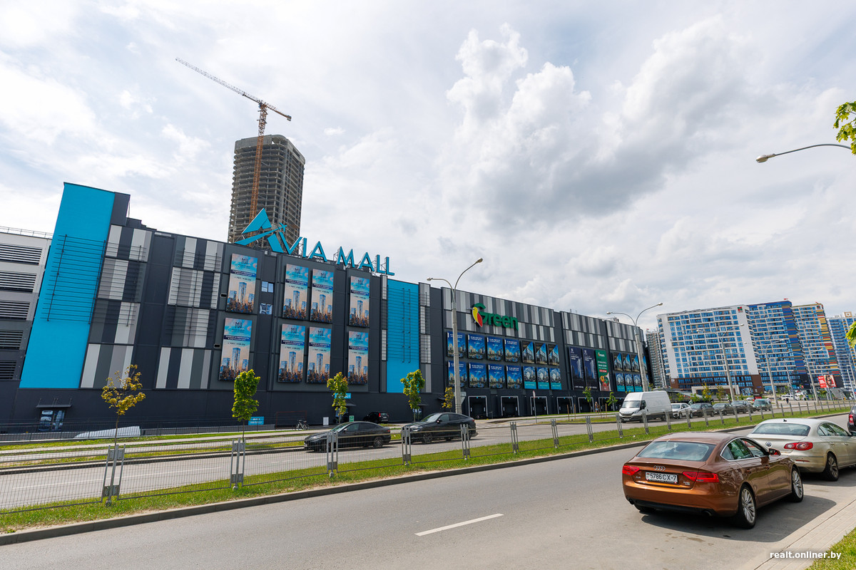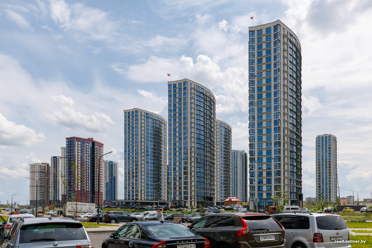 Возле метро и торгового центра застройщик выделил территорию для важных объектов — пяти стекляшек Международного финансового центра, в которых разместятся офисы, административные помещения и апартаменты. Главный небоскреб возвышается над землей на 42 этажа — он станет самым высоким в Минске. Сейчас башни находятся в процессе остекления. Но еще в 2023 году они лишь только начинали набирать высоту.