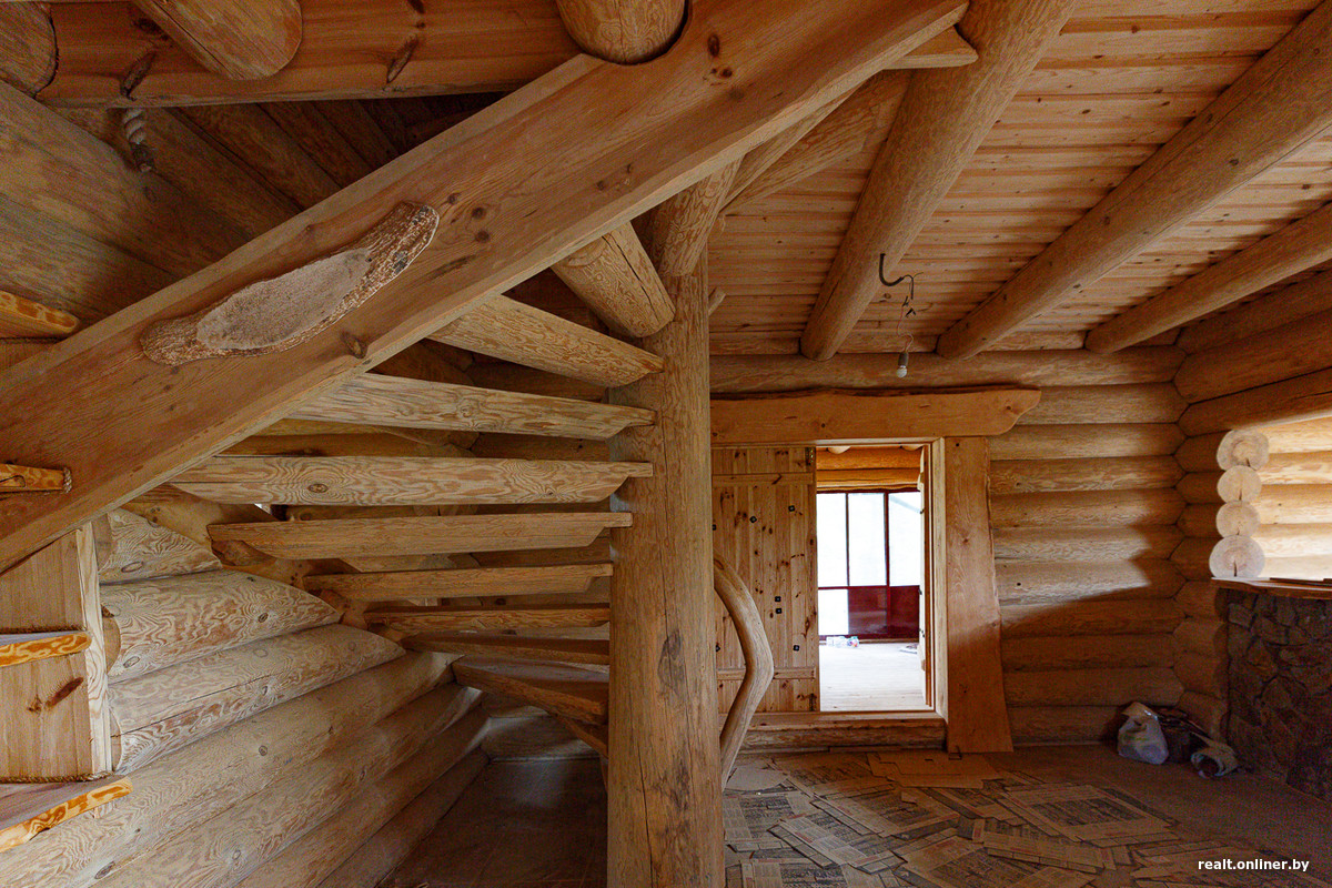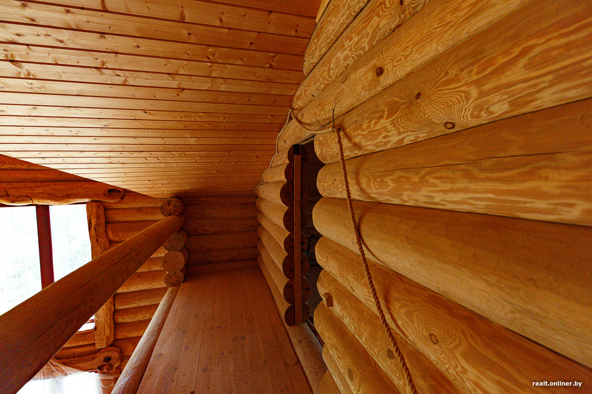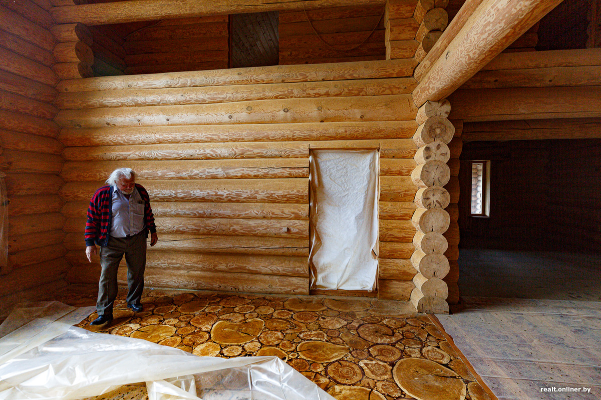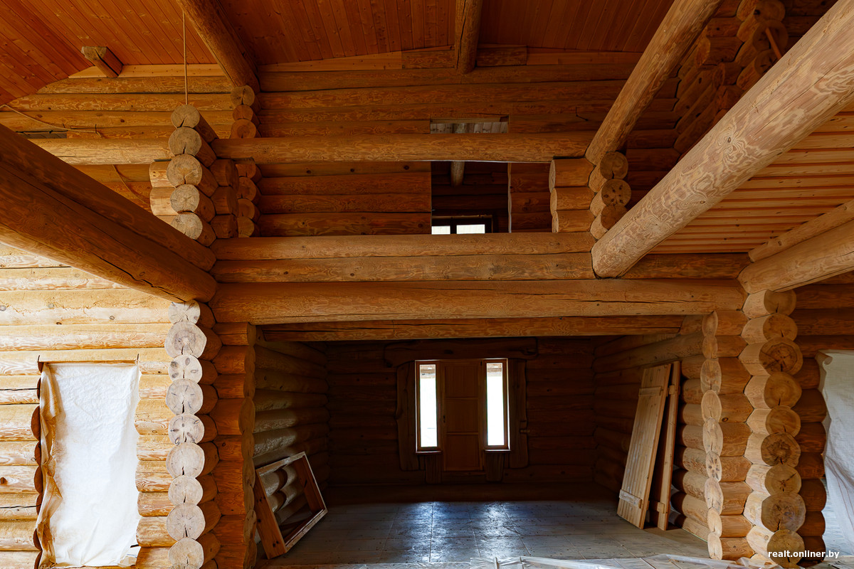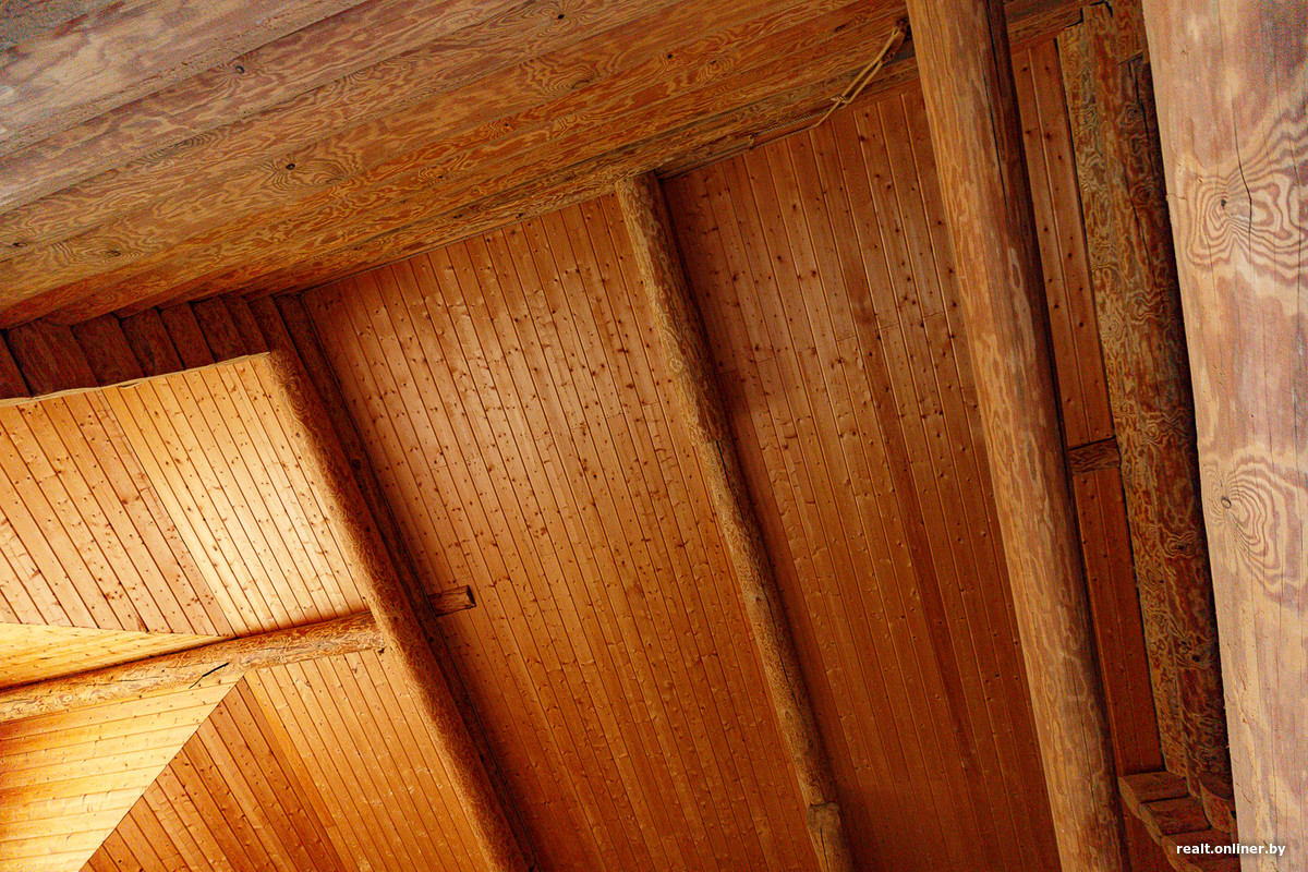 Деревянная часть дома собрана из цельных бревен сосны диаметром 26—28 сантиметров. Дмитрий подчеркивает: это очень большой диаметр, редкость для Беларуси.