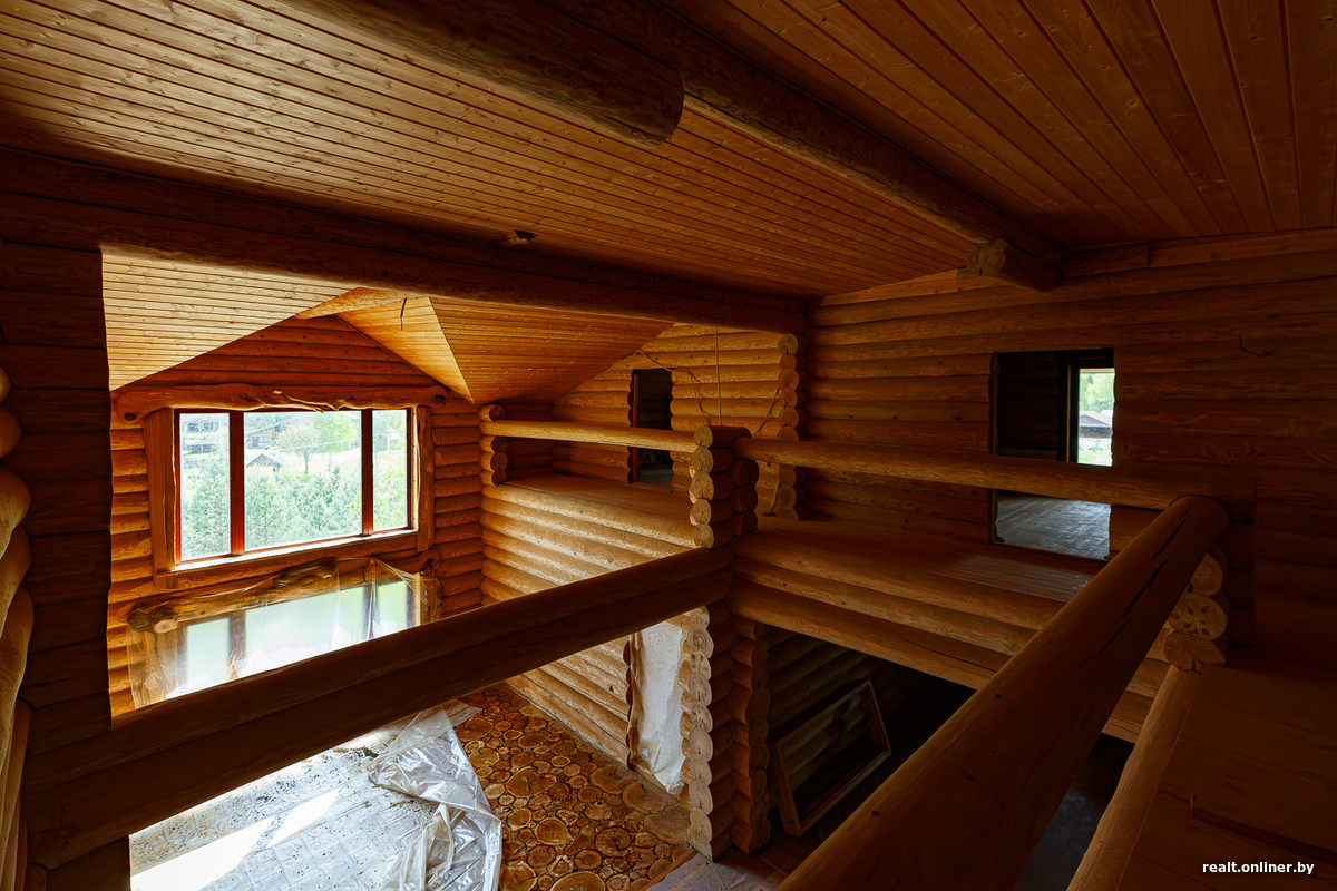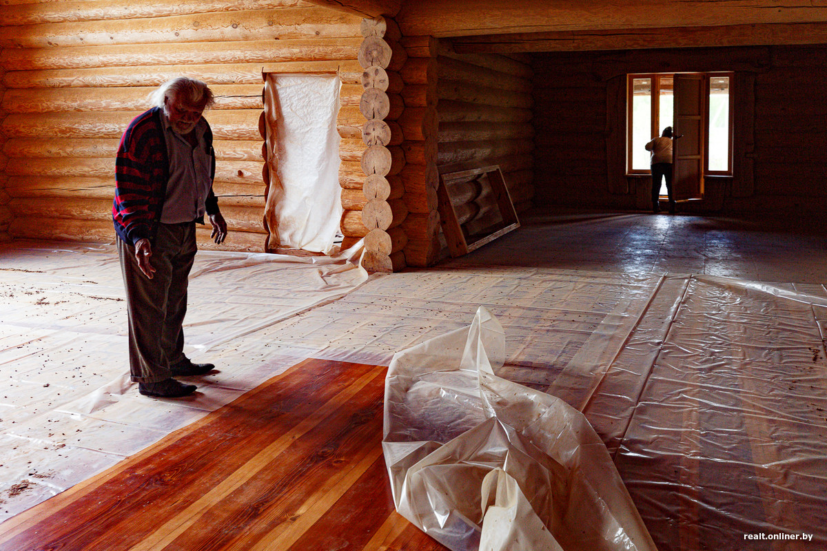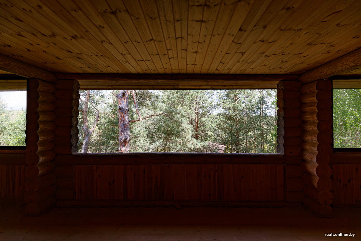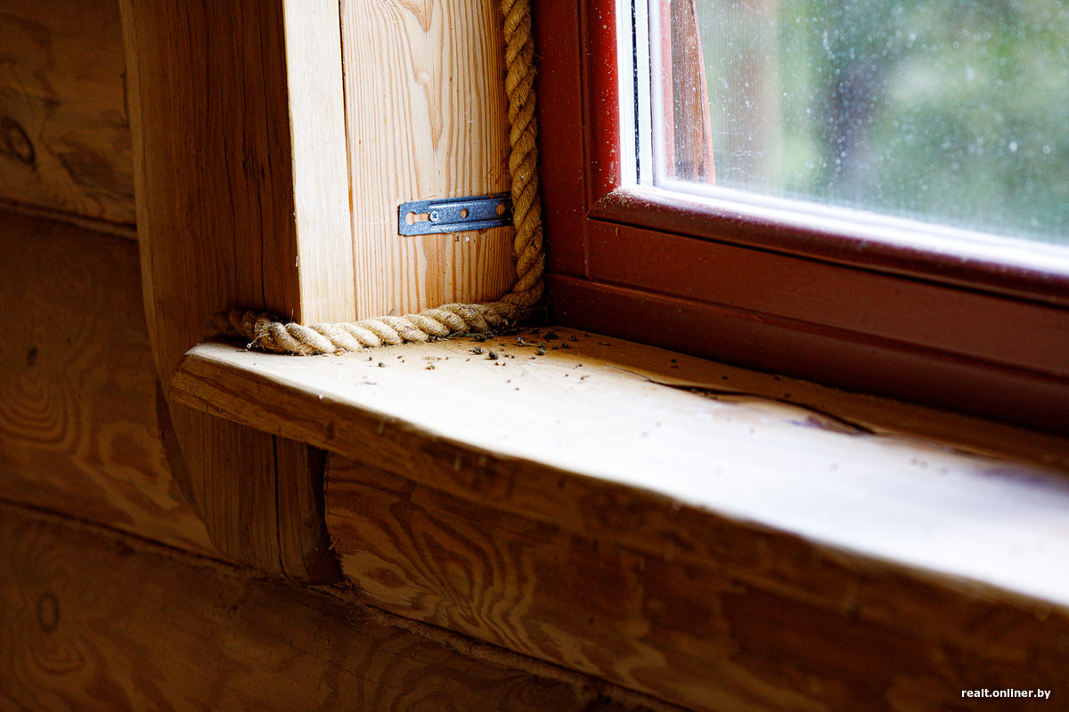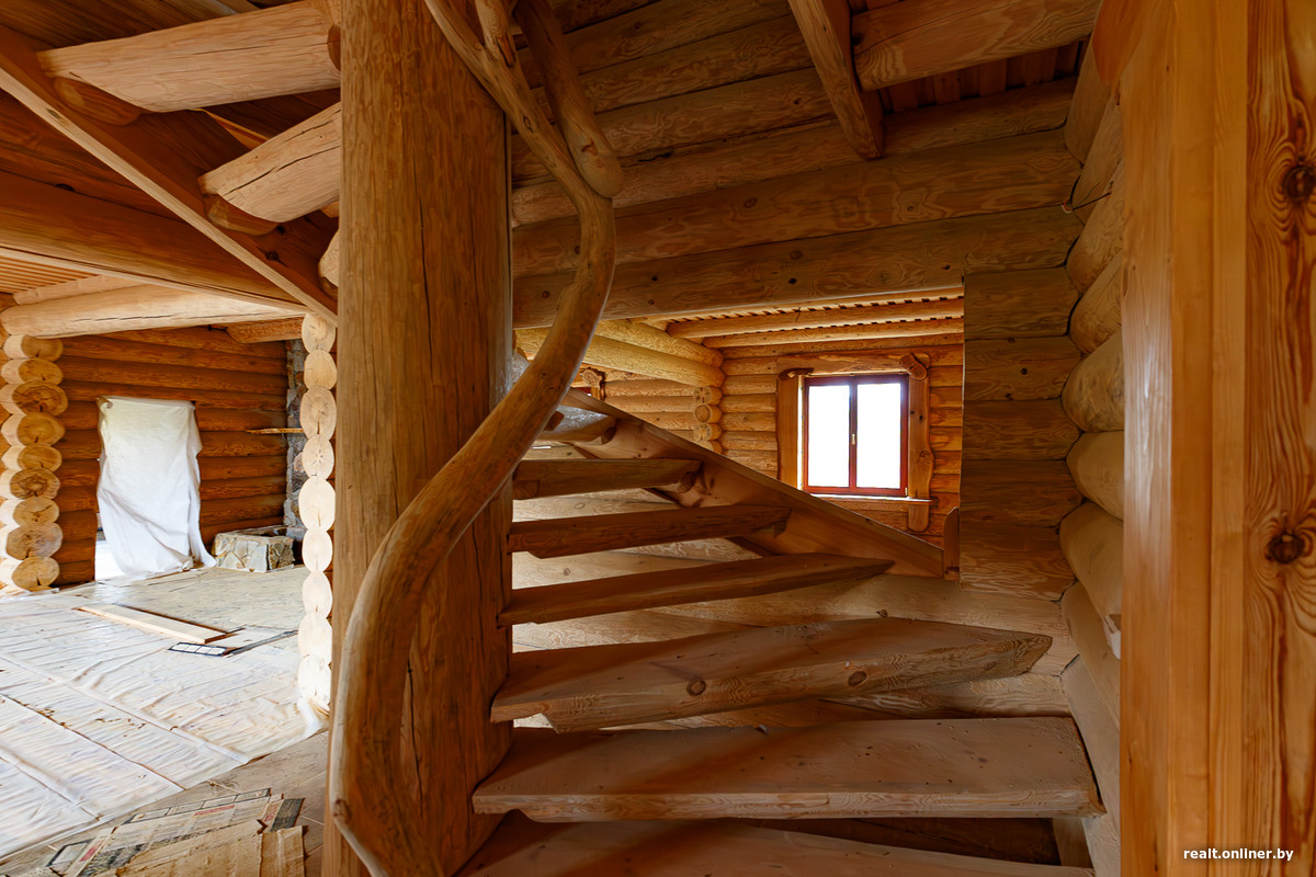 Деревянная часть дома собрана из цельных бревен сосны диаметром 26—28 сантиметров. Дмитрий подчеркивает: это очень большой диаметр, редкость для Беларуси.