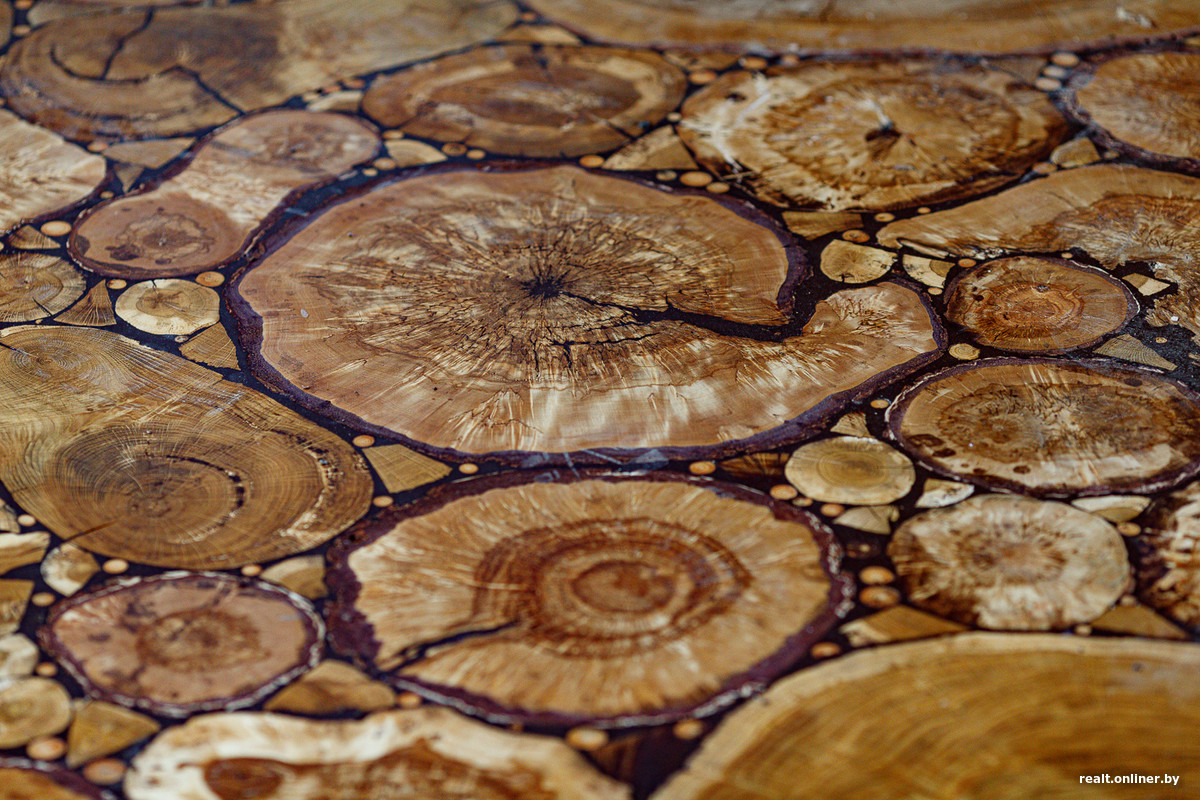 Пол в гостиной выполнен в разных стилистиках: одна часть покрыта широкими сосновыми досками, другие — торцевыми спилами дуба, березы, ясеня.