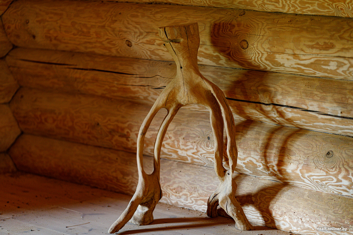 Помещения пока пустые. Лишь некоторые частично обставлены мебелью, сделанной руками Дмитрия. Ведь целью было не только построить дом, но и обставить его предметами, созданными методом корнепластики.