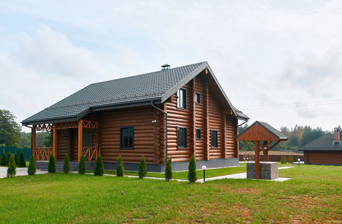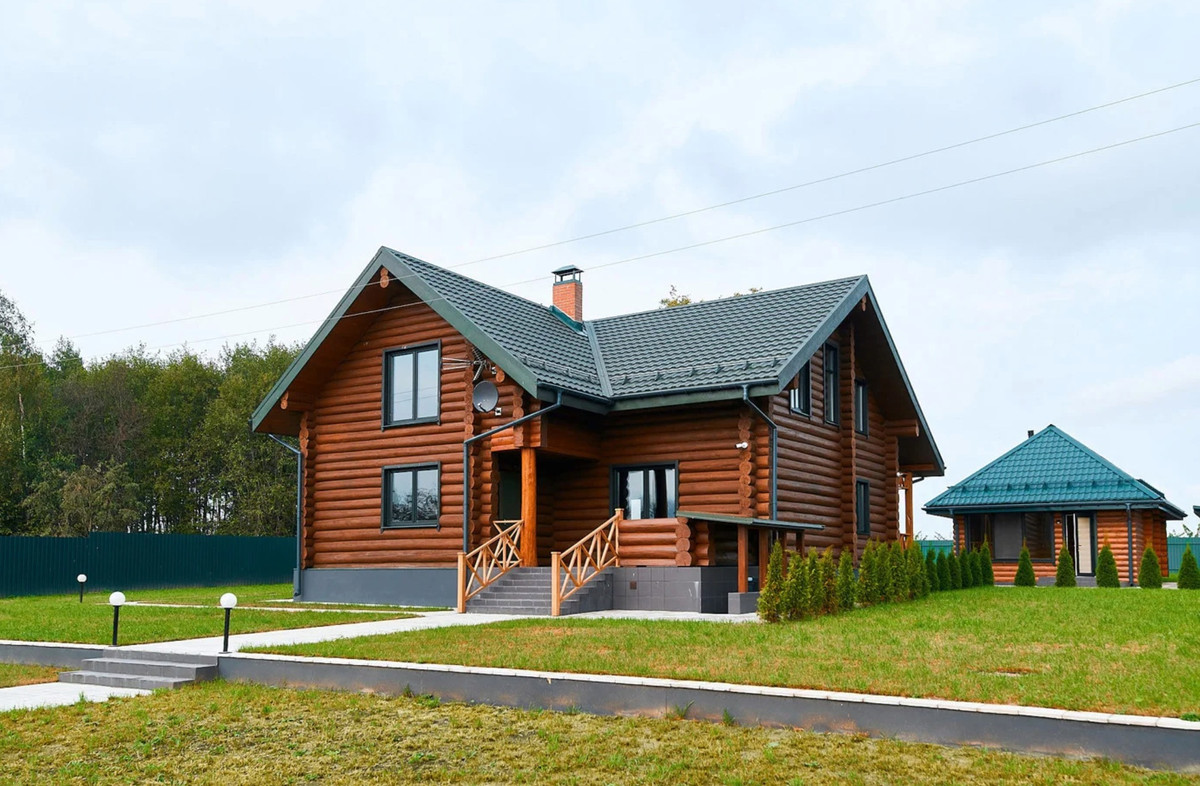 Главный дом — двухуровневый, 193 м², построен из сруба с заполнением швов американской мастикой, окрашен финской краской. Крыша — гибкая черепица с утеплением каменной ватой.