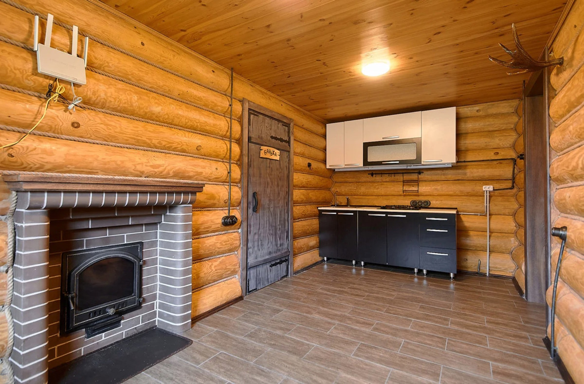 Отделка следующая: напольное покрытие из тиса, потолки — сосна, двери — из массива. Вся мебель тоже изготовлена из благородных пород дерева, уверяют владельцы. Сантехника — итальянская, камин — тоже. Интерьер явно тяготеет к стилю 2000-х.