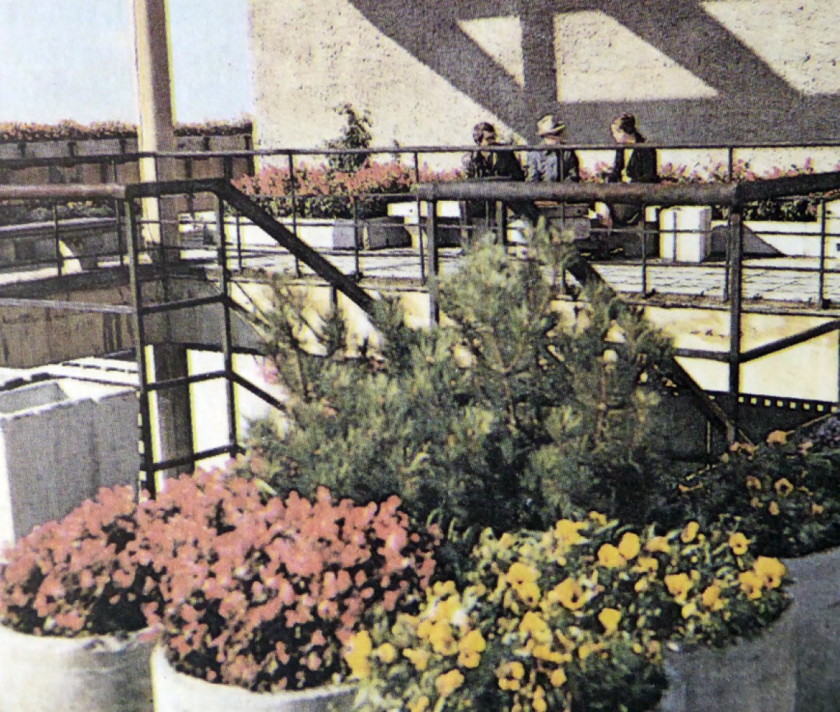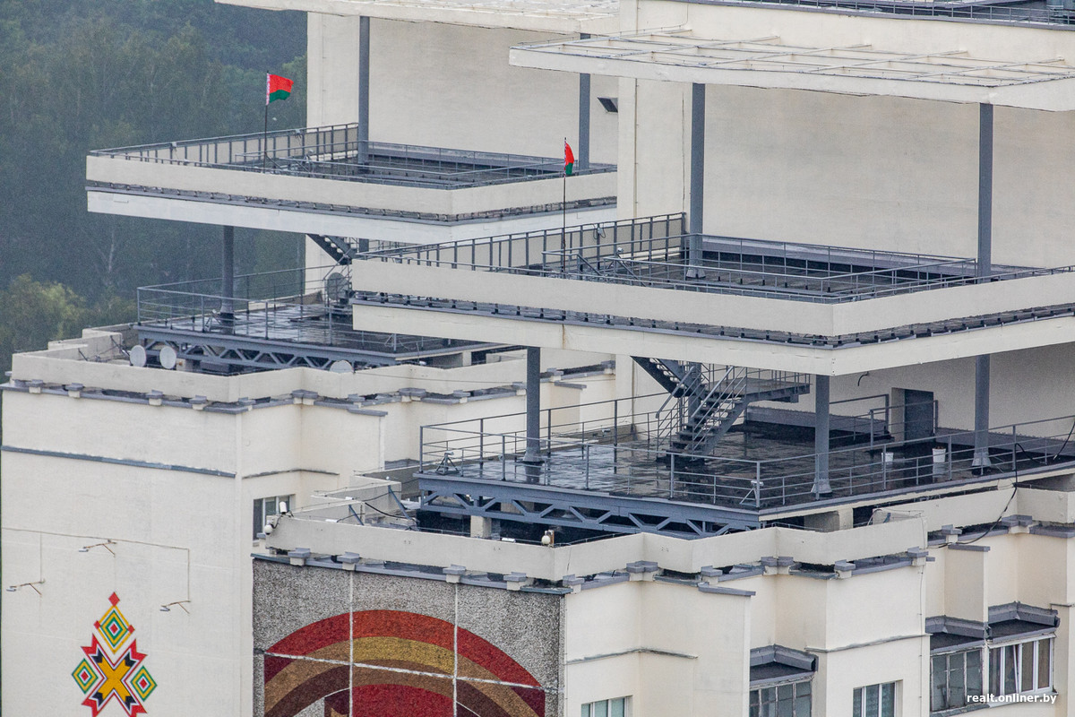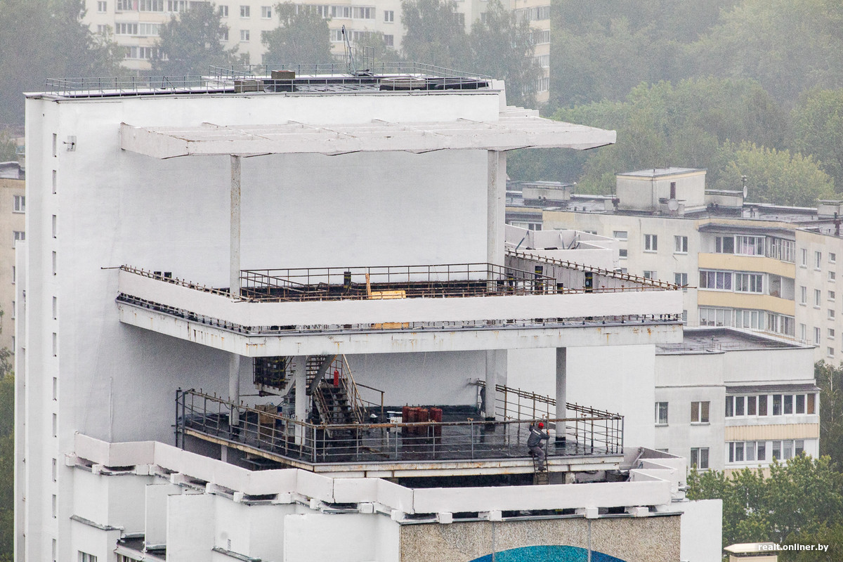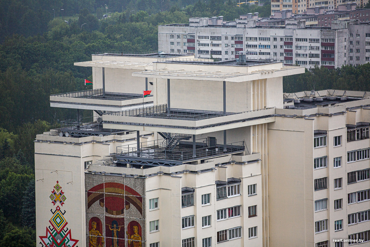 Чтобы максимально подчеркнуть тему въезда в город, блоки 16-этажек, обращенные к проспекту, были запроектированы 14-этажными. На сэкономленном таким образом пространстве предполагалось создать «крышу-сад» с огромным козырьком-консолью, куда можно было бы попасть через холл 15 этажа дальнего от проспекта блока. Кроме отдыха трудящихся после рабочего дня и в выходные, предполагалось использовать крыши и в качестве смотровых площадок. Какое-то время они даже эксплуатировались.