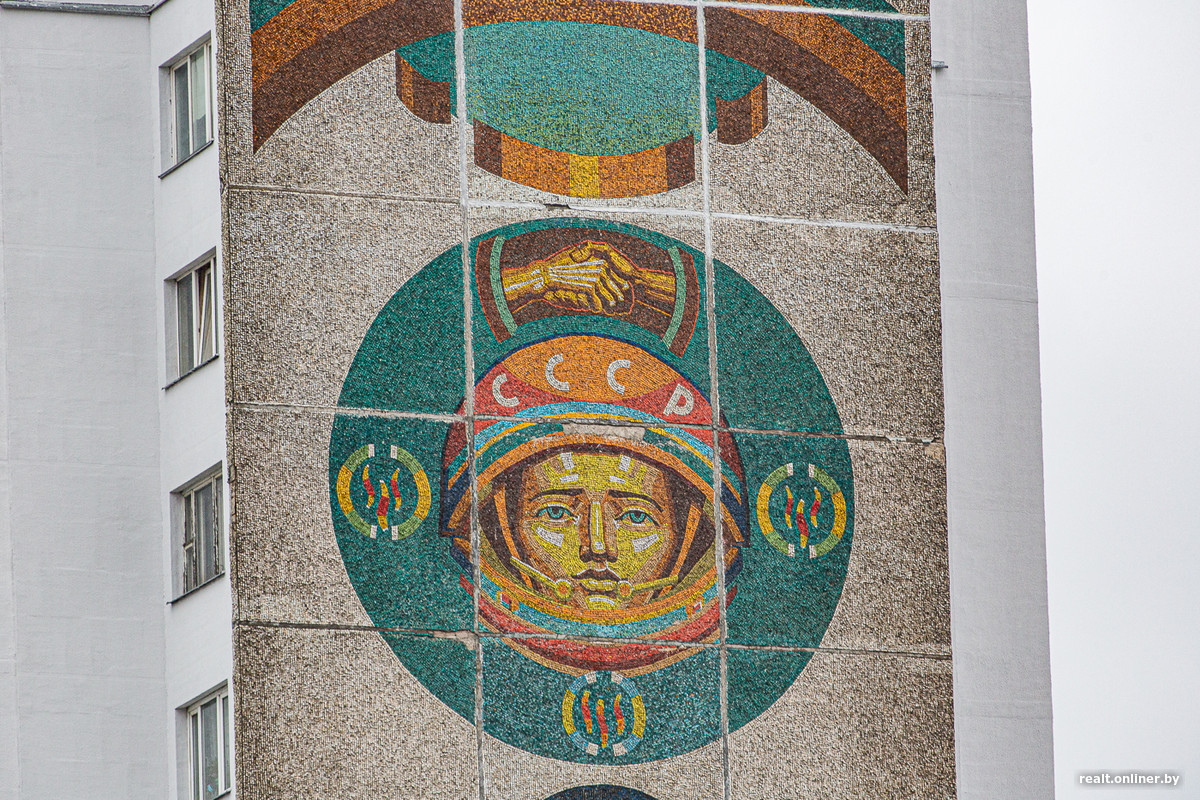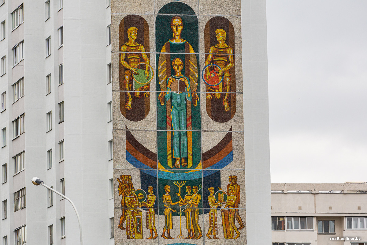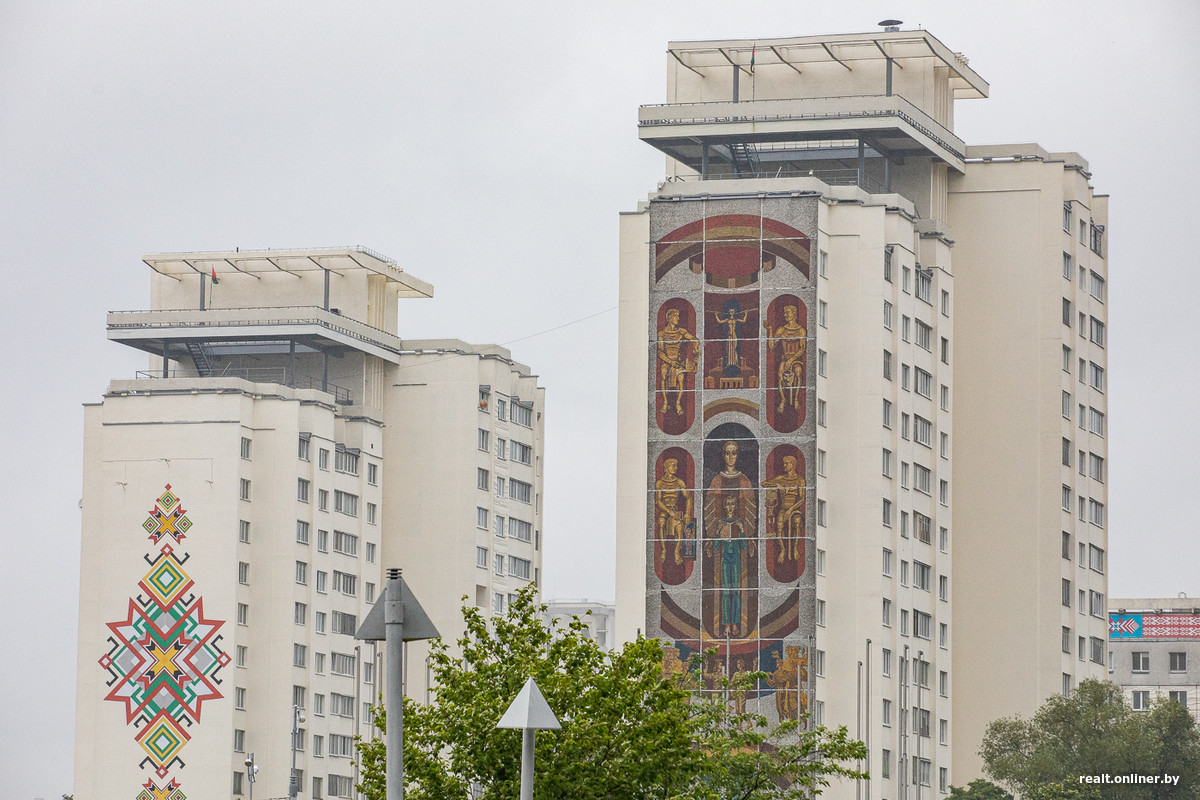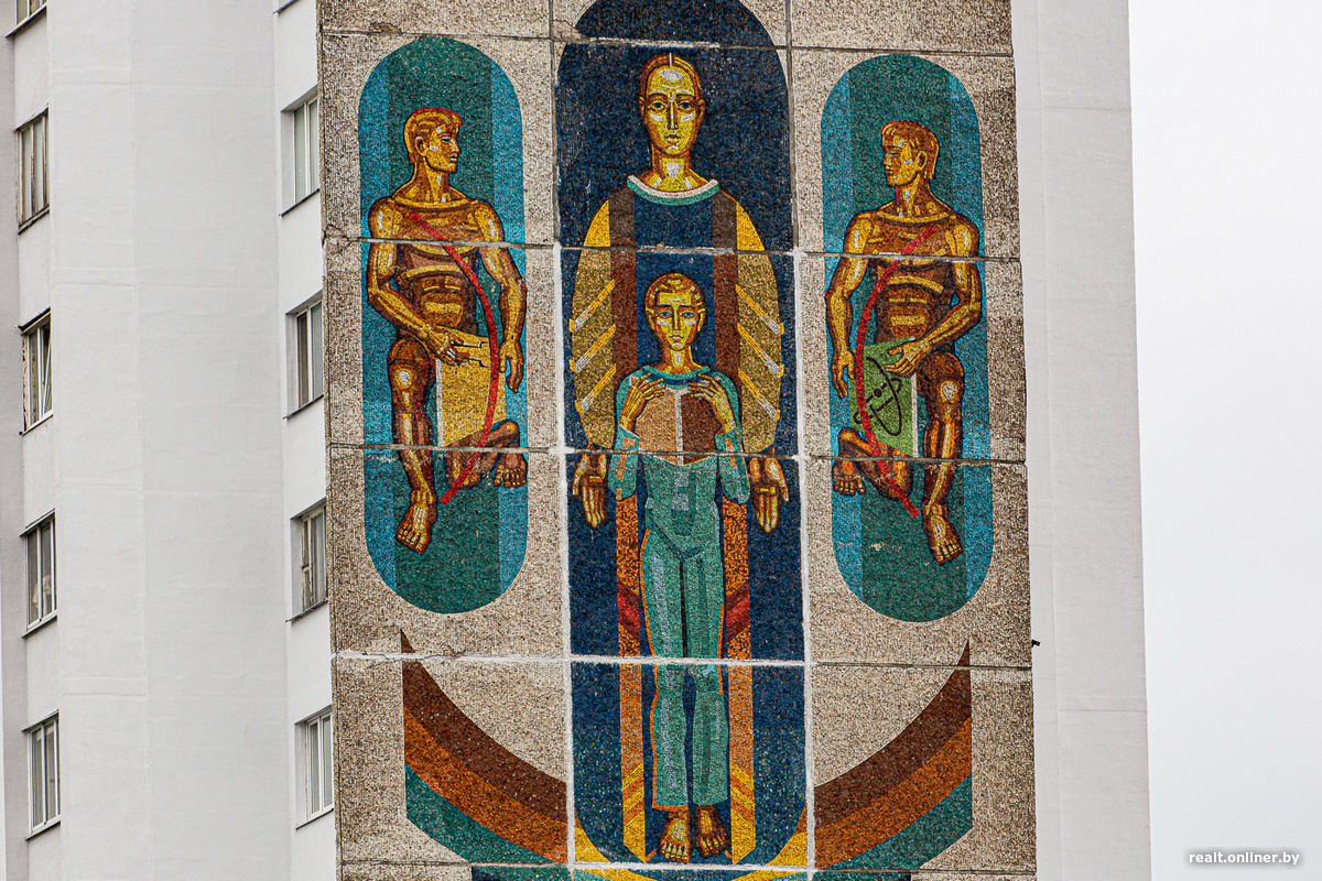 Глухие торцы 16-этажек первой линии декорированы огромными красочными мозаиками, созданными Александром Кищенко, одним из крупнейших белорусских художников-монументалистов. Для пущей красоты и «учитывая важность эстетических задач, которые решает въезд в город», в духе модной в то время темы «синтеза искусств».