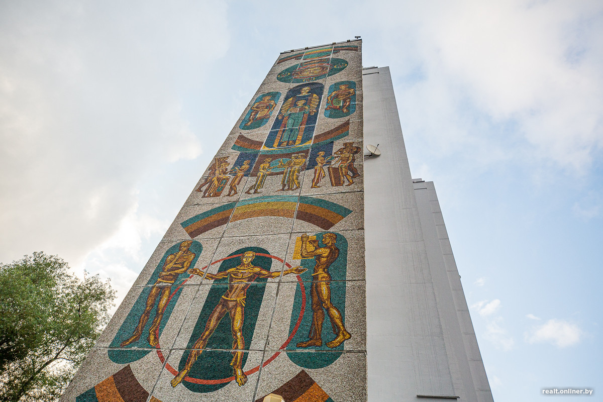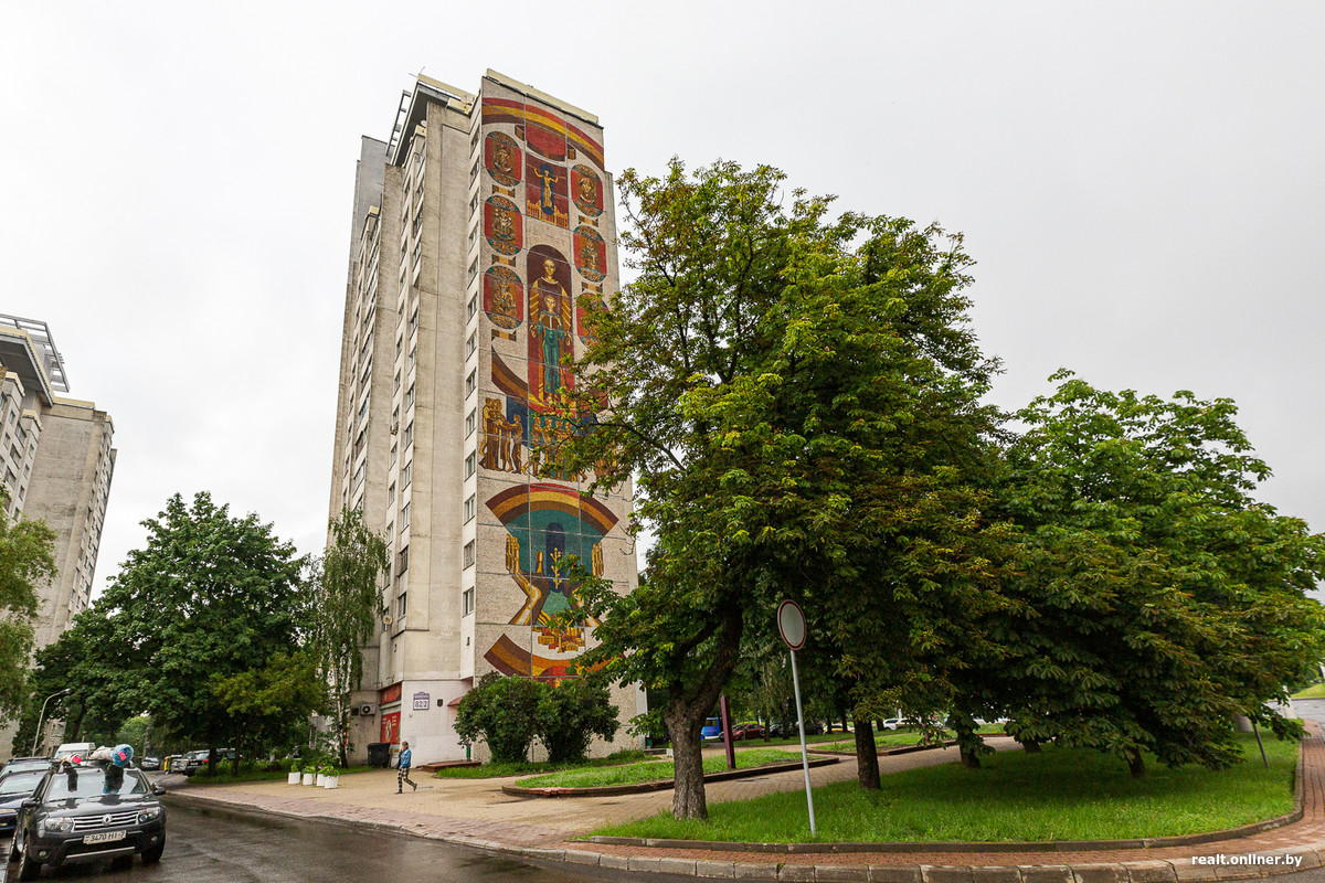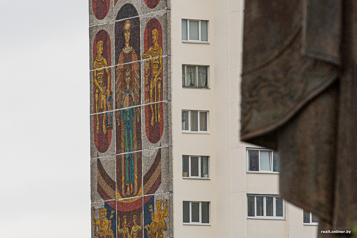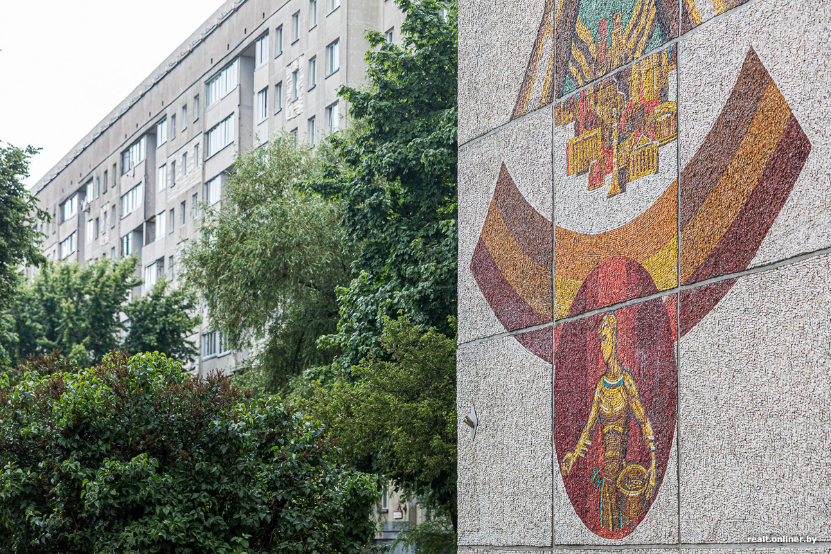 Глухие торцы 16-этажек первой линии декорированы огромными красочными мозаиками, созданными Александром Кищенко, одним из крупнейших белорусских художников-монументалистов. Для пущей красоты и «учитывая важность эстетических задач, которые решает въезд в город», в духе модной в то время темы «синтеза искусств».