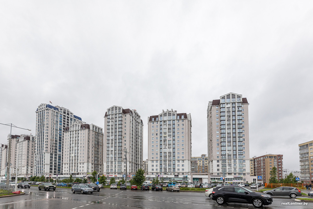 Так выглядит одна из построенных вдоль проспекта Независимости групп зданий. Пара 16-этажек, блок общественных учреждений, протяженный 9-этажный жилой дом со сквером перед ним.