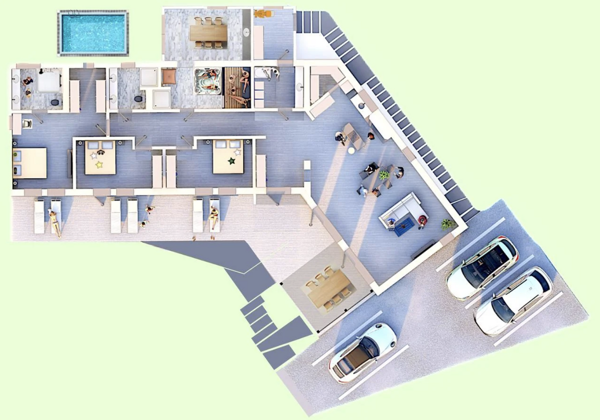 Отмечается, что три спальни размещены подальше от гостиной, чтобы отдыхать в них было комфортно. Во всех комнатах есть выход на террасы.
