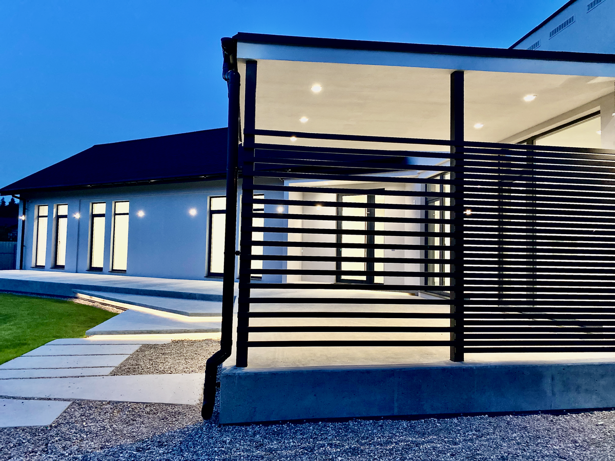 К дому ведут два подхода: главный парадный портал со стеклянной широкой алюминиевой дверью высотой 2,6 метра и технический вход с душевой для домашних питомцев (лапомойка).