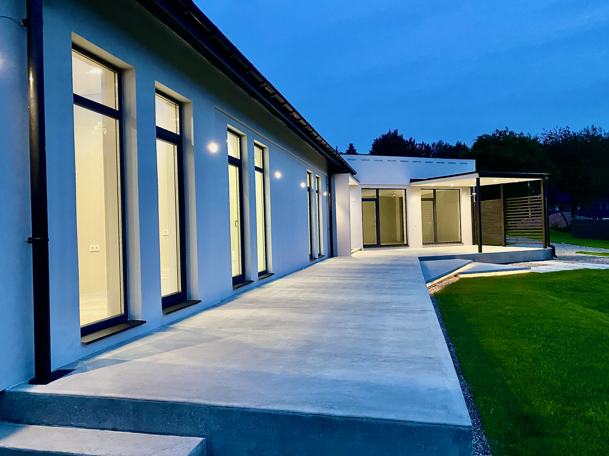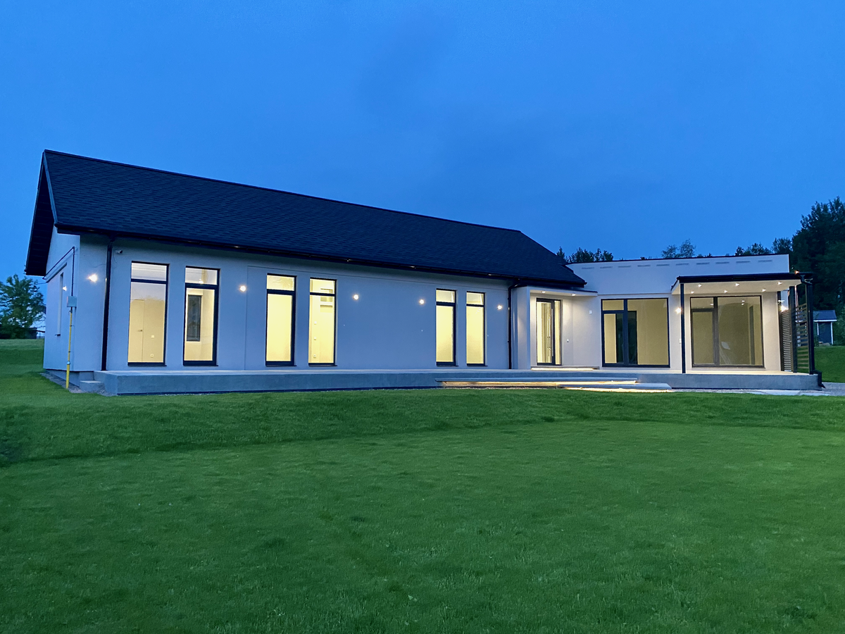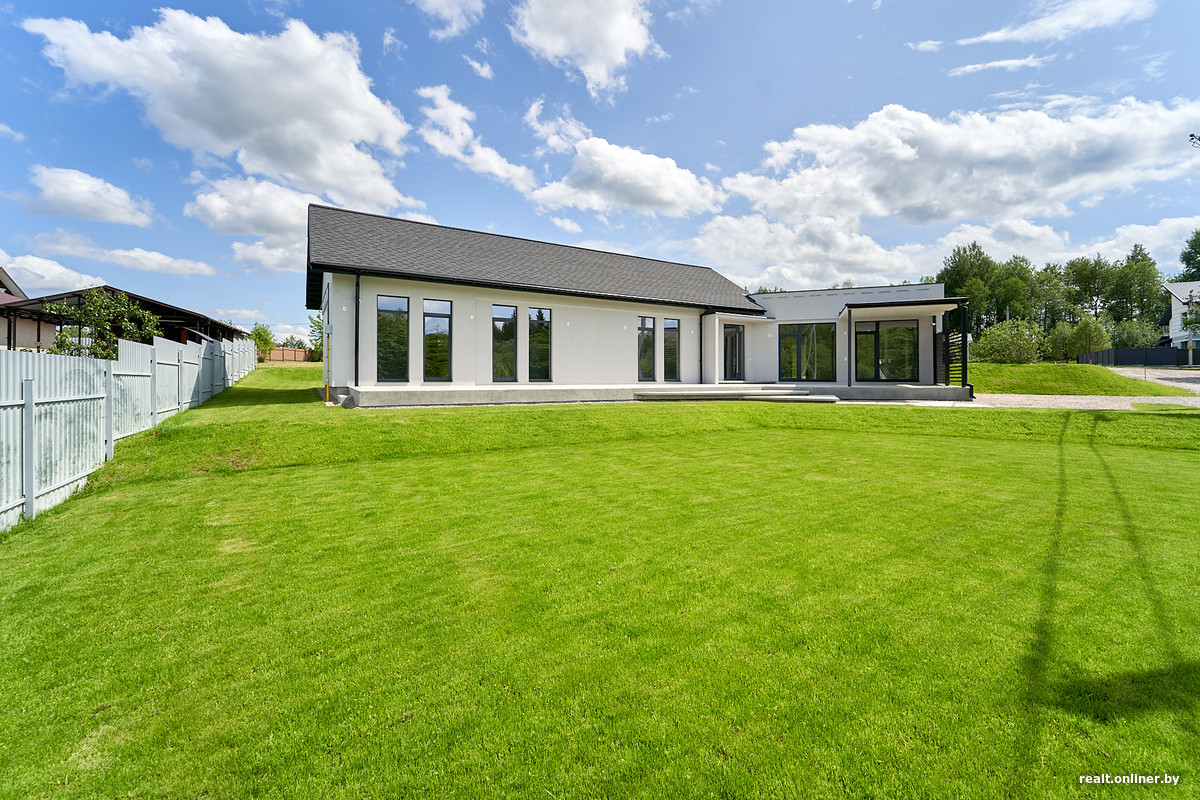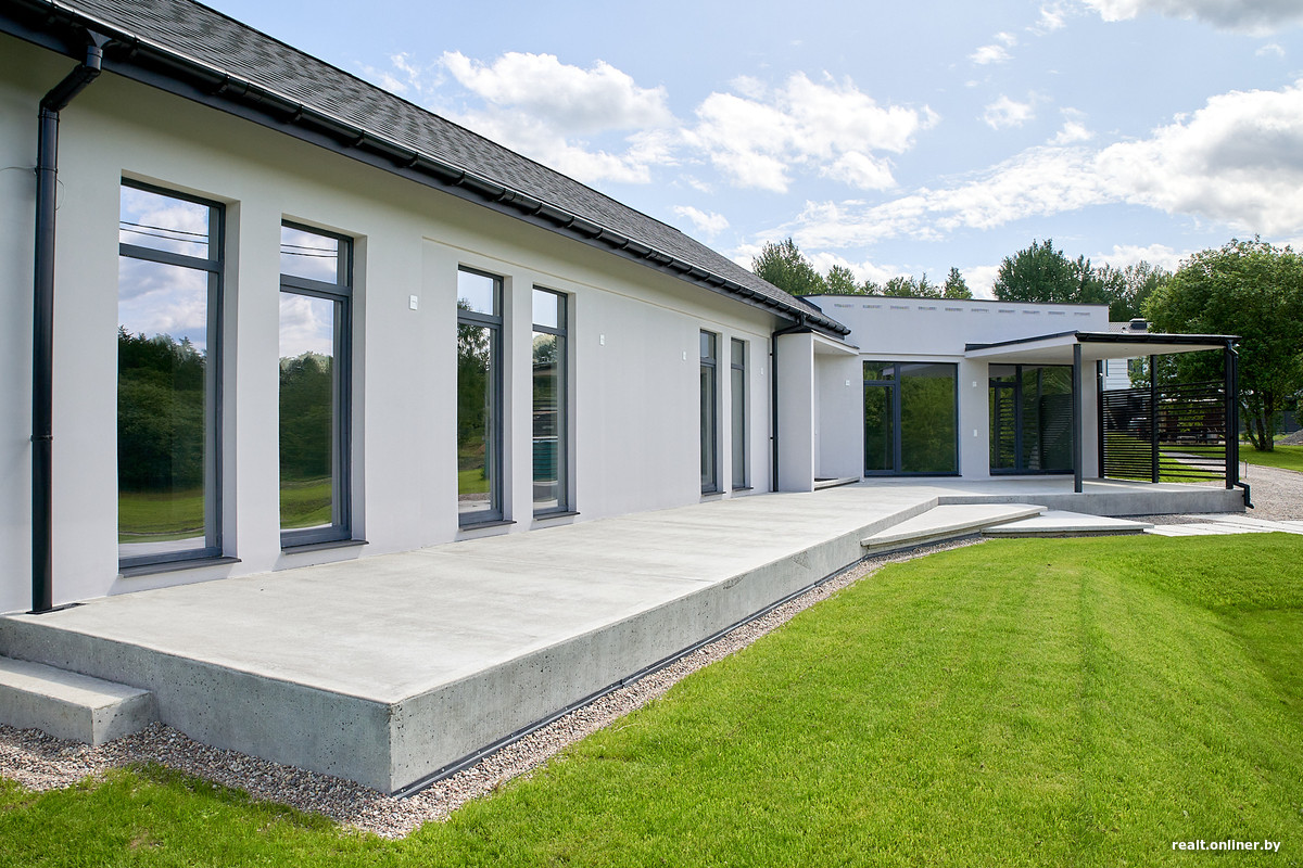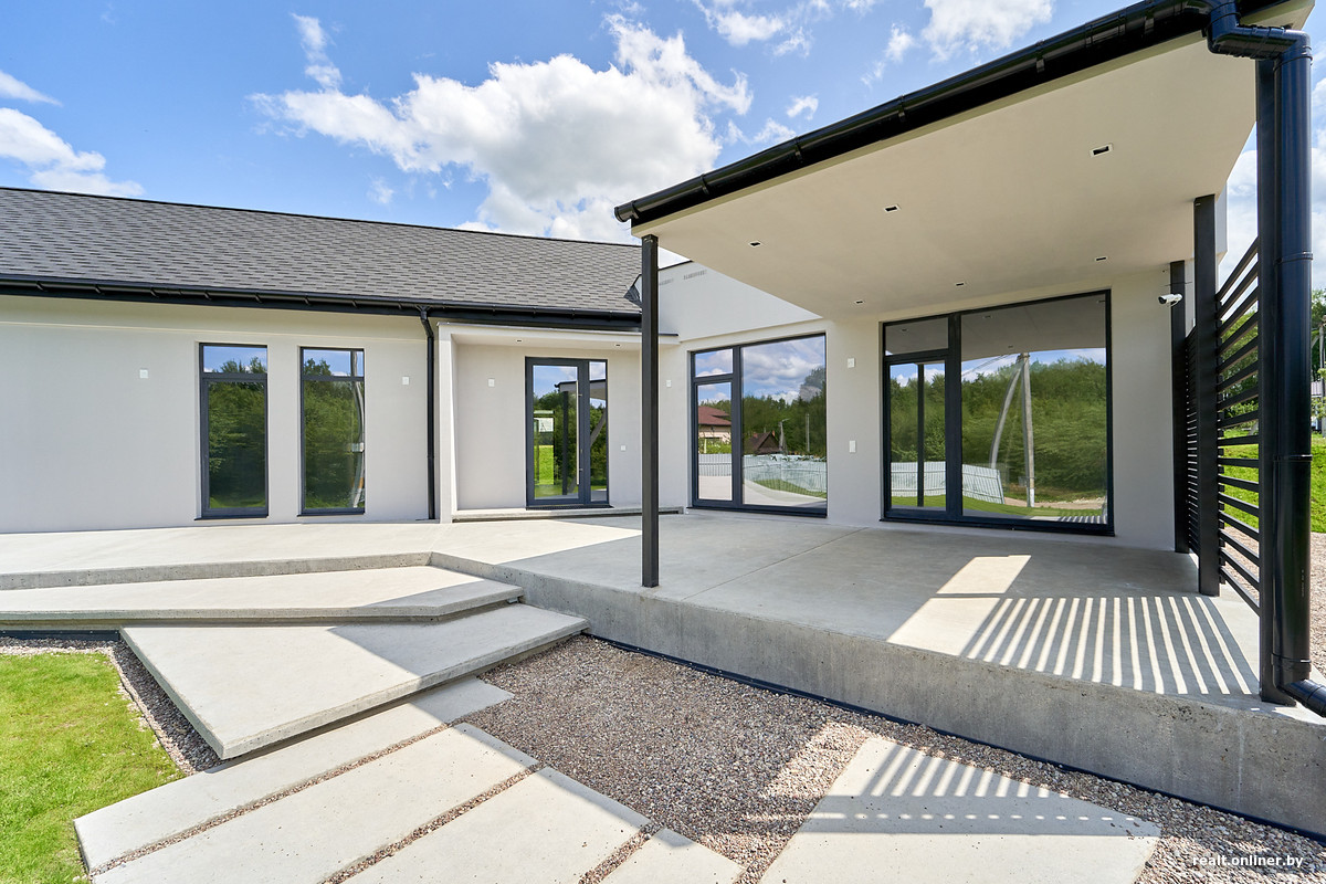 Одноэтажный дом находится в деревне Закаблуки — дорога сюда от Минска занимает 15 минут. Общая площадь строения — 197 кв. м. Архитектором выступила Инесса Цала.