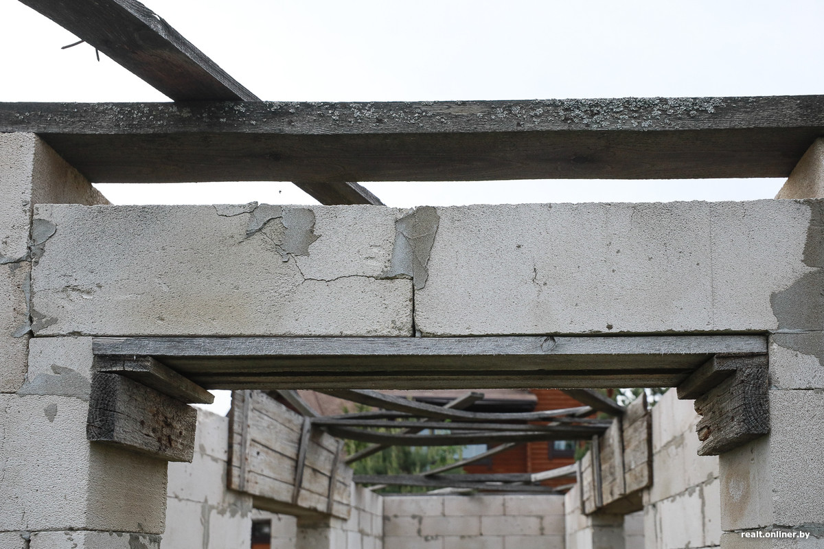 — Постройка совсем небольшая: примерно шесть с половиной на девять метров. Для дома маловато. Может, люди планировали сначала построить баню с комнатой отдыха. А уже потом, когда будут деньги и время, возвести дом для постоянного проживания, — размышляет Андрей. — Но в любом случае коробка на первый взгляд неплохая. Да, некоторые блоки полопались, потрескались, их надо будет заменить. Перебрать я бы советовал и два-три верхних ряда, так как каменная кладка там не очень (заодно новые перемычки получилось бы сделать). Но в остальном вполне пригодная основа для доработки. Безнадежностью тут не пахнет. По крайней мере, такое впечатление складывается по фотографиям. Детальный осмотр, возможно, внесет корректировки.