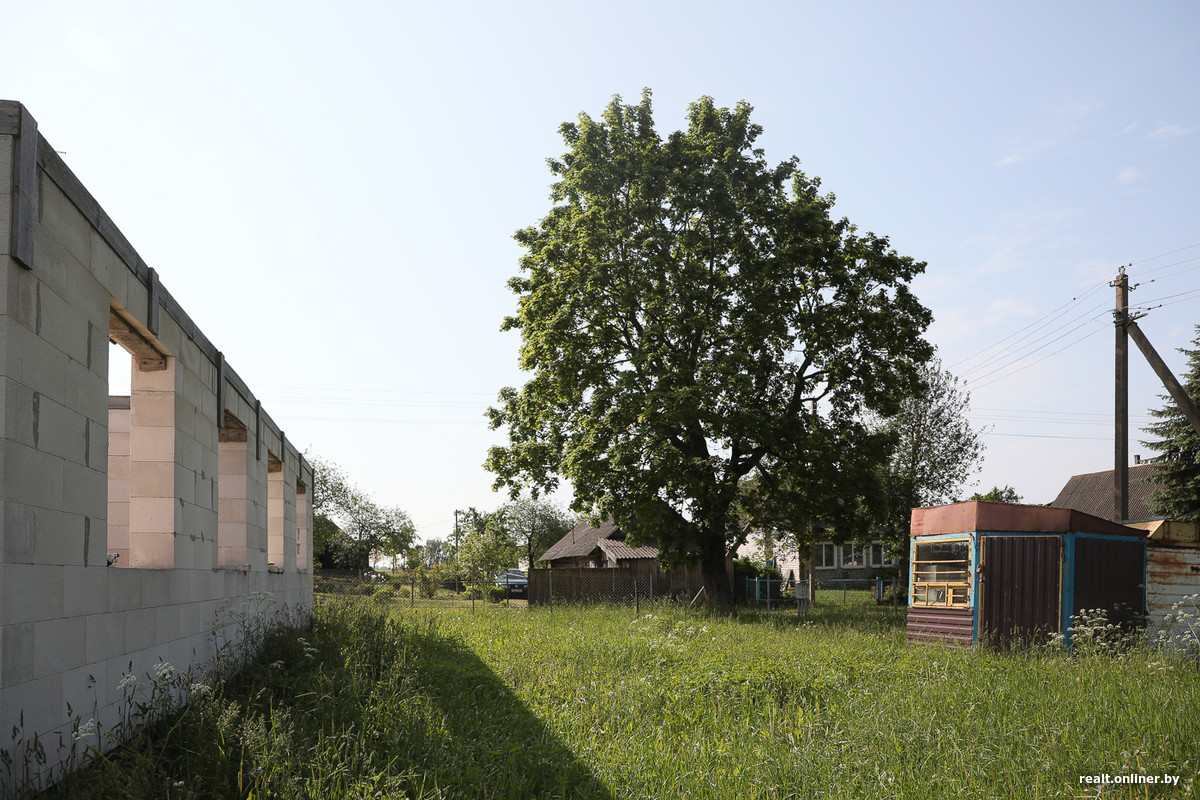 В Паздерках всего одна улица, едем к участку №35. Надел почти квадратной формы, площадью 10 соток, расположен прямо на повороте. И именно здесь нас ждет первая постройка, действительно напоминающая дом. А какое рядом дерево вымахало! Картинка — очей очарованье.