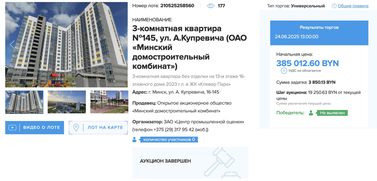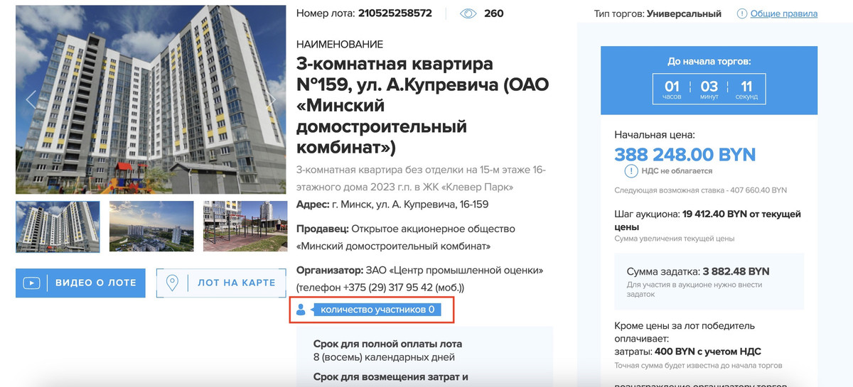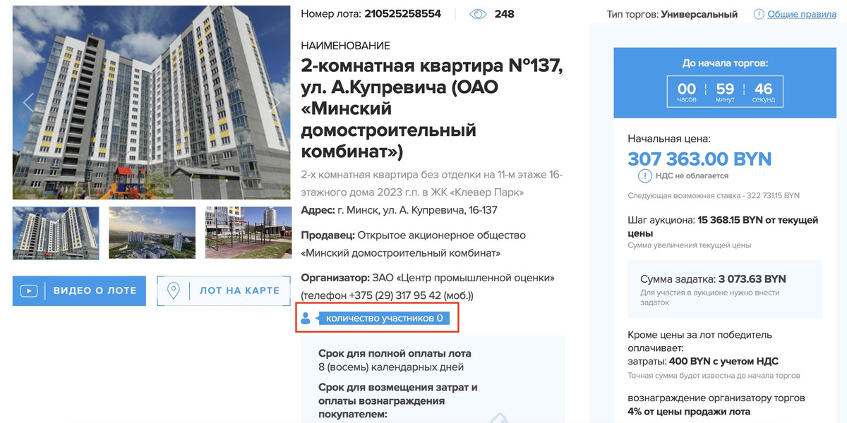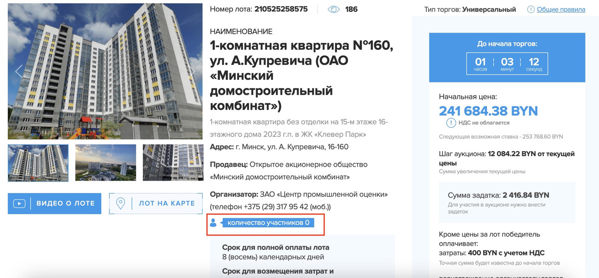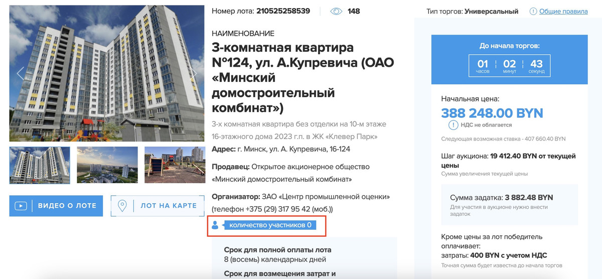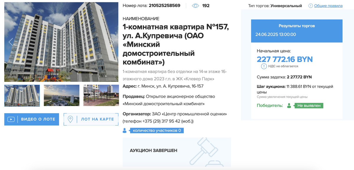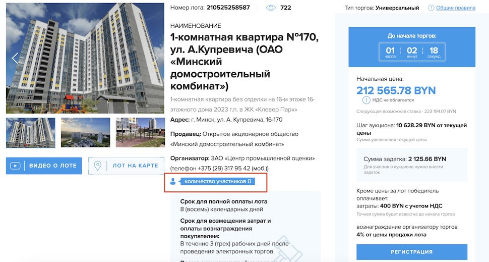 Аукцион был назначен на сегодня, 24 июня. Торги за 46-метровые однушки должны были стартовать с 212 566 рублей, или $71 550 по курсу. Это самый доступный вариант. По условиям шаг аукциона должен был составлять не менее 10 628 рублей. То есть однокомнатная квартира в черновой отделке приближалась по стоимости уже к $75 000 в эквиваленте.