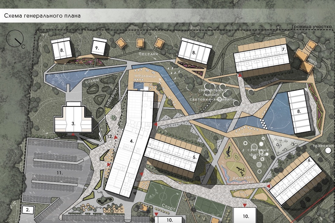 Само собой, будет проведено благоустройство территории, в рамках которого выделят место для кафе. На генплане все это выглядит так: рассмотреть можно уголок для йоги, несколько беседок на краю леса, веревочный городок, лабиринт и даже телескоп.