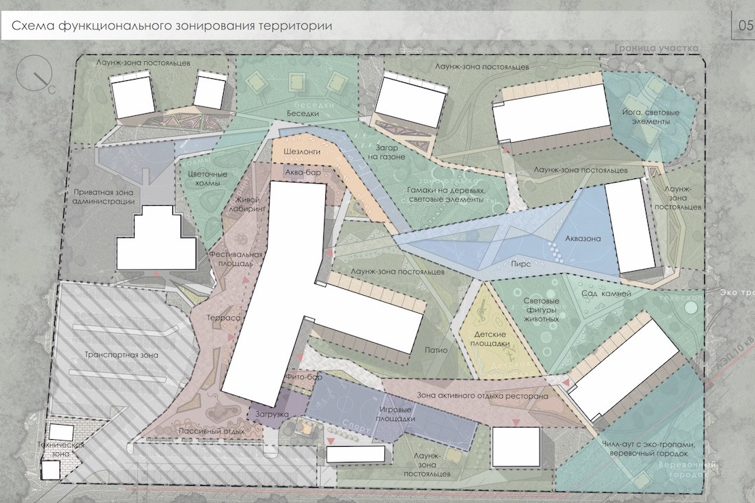 Как видим, общественный корпус будет одноэтажным. Отель, как уже упоминалось, — на шесть уровней. Его разобьют на три отдельно стоящих корпуса. Номера запроектированы двухместные и двухместные с гостиной. Помимо собственно крыши над головой гостиница предоставит отдыхающим ресторан на 128 посадочных мест, два банкетных зала, бассейн, кальянную, кинокомнату, проекционную и помещение для мастер-классов. На мансардном этаже жилья не будет: туда «закинут» зоны VR, детские комнаты, бильярдную и некий универсальный зал.