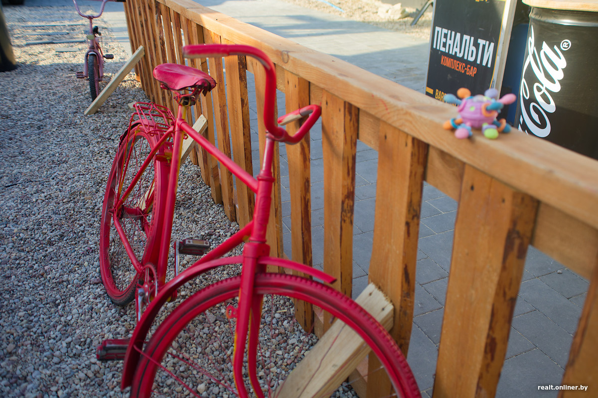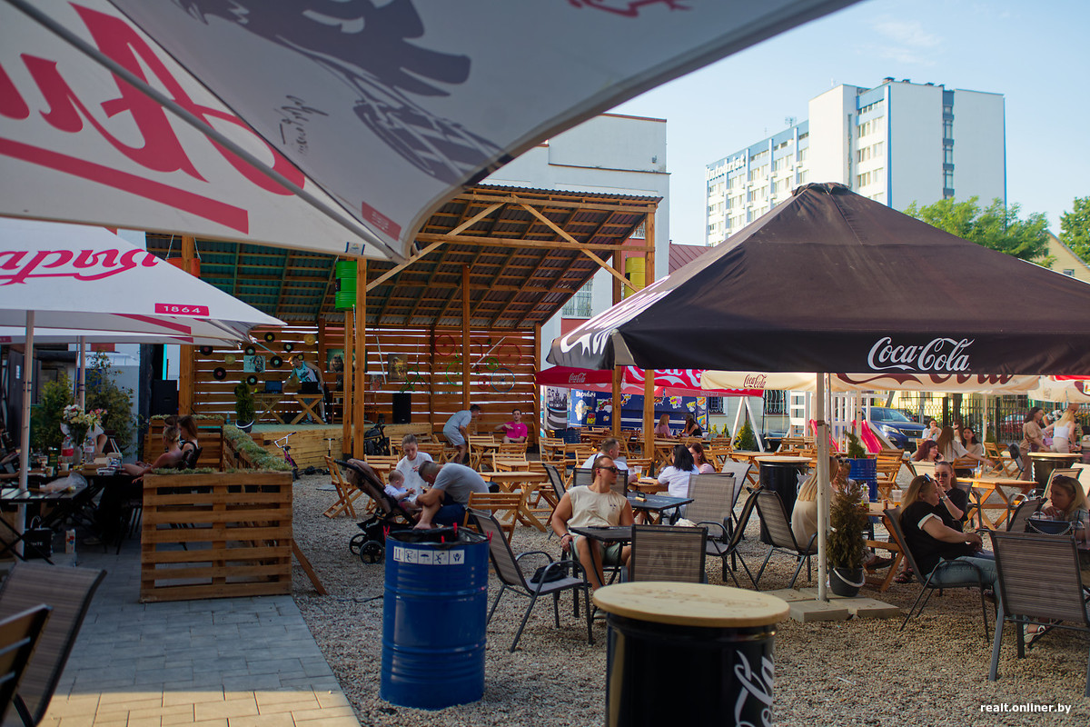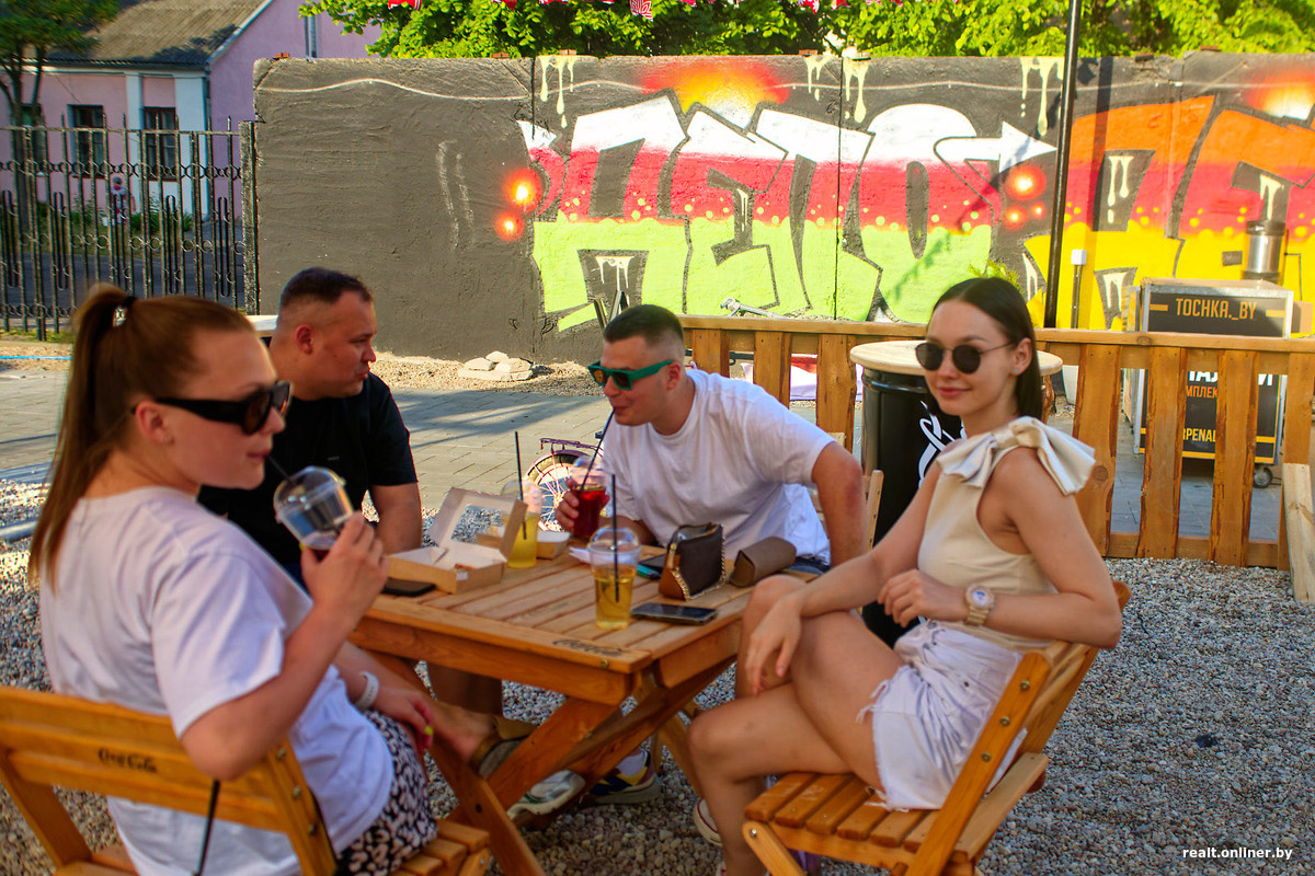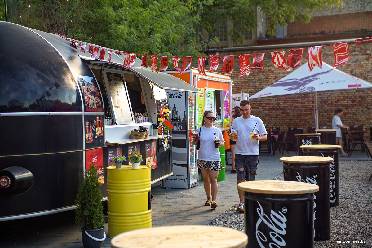 Визуально фуд-корт разделен на зоны: черная, белая и, скажем так, паллетная — для больших компаний. Паллеты расположены на возвышенности, откуда хорошо видна публика — под вечер здесь собираются не менее двух сотен человек. Вместе смотрят фильмы, прямые трансляции спортивных игр, танцуют. «Танцполом» служит белая галька. На шпильках не расслабишься, но владельцам хотелось намекнуть на курортный дух места.
