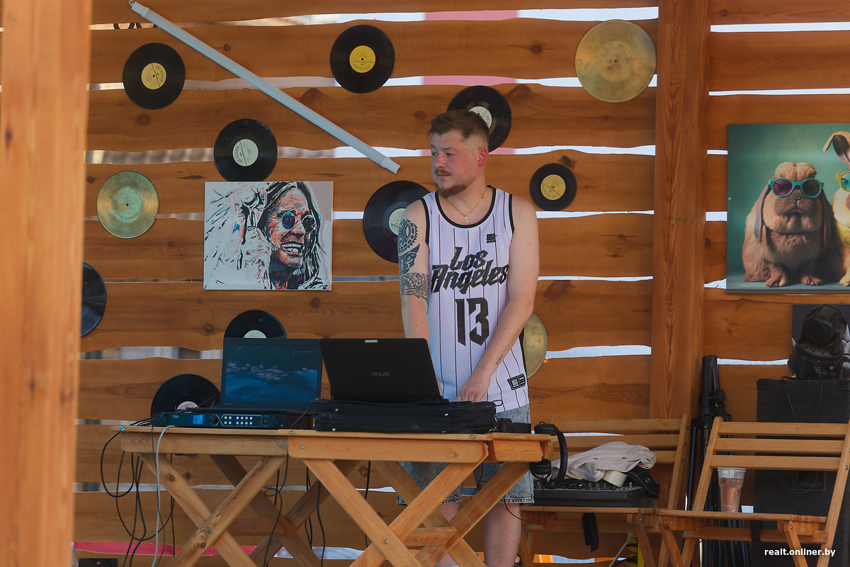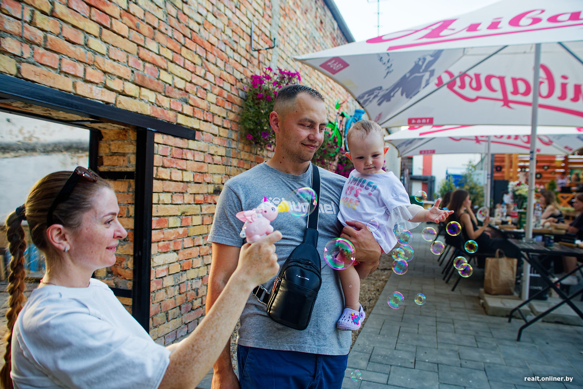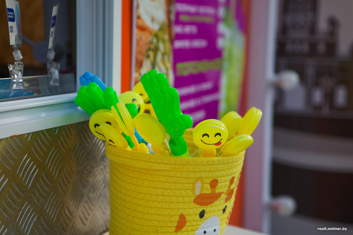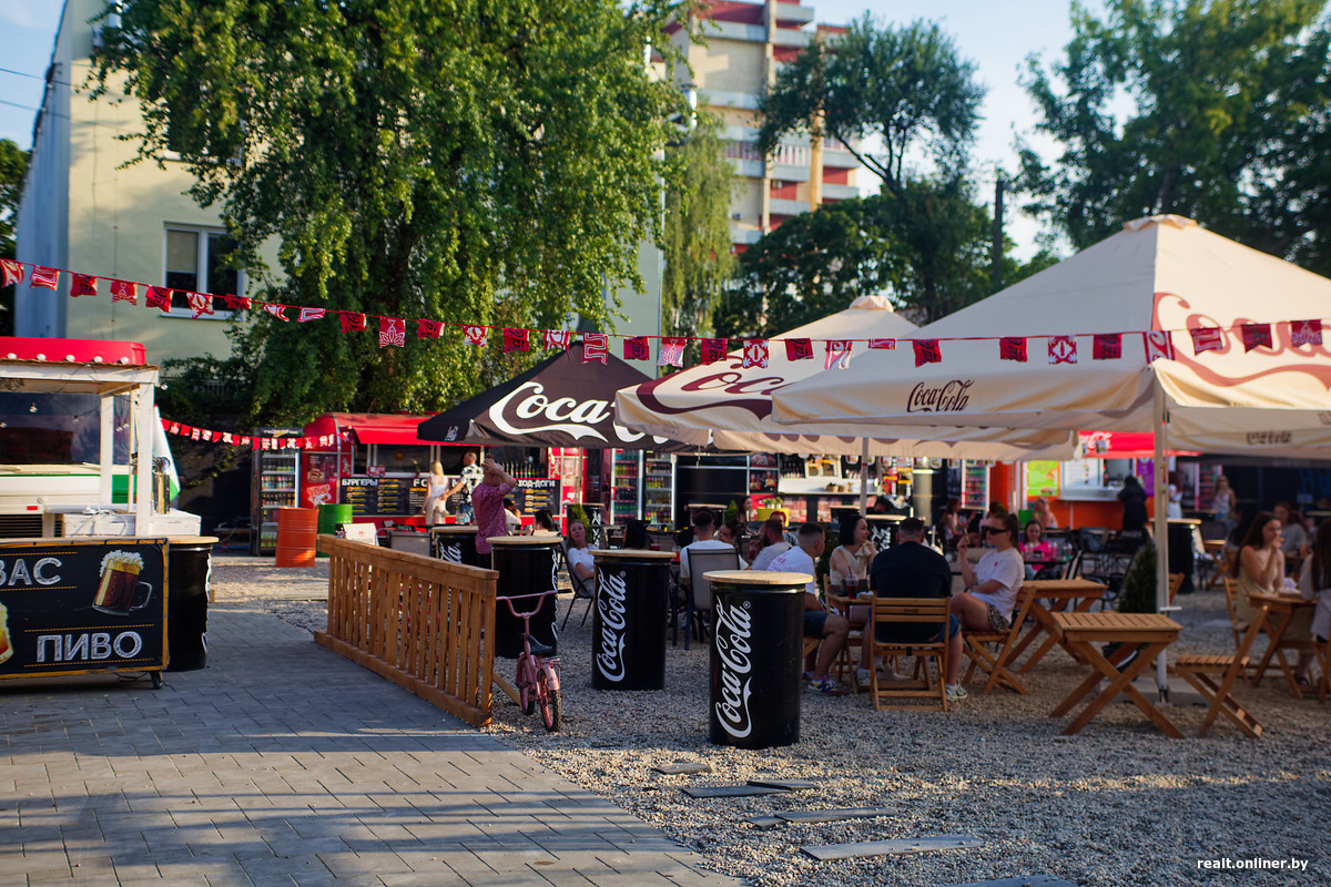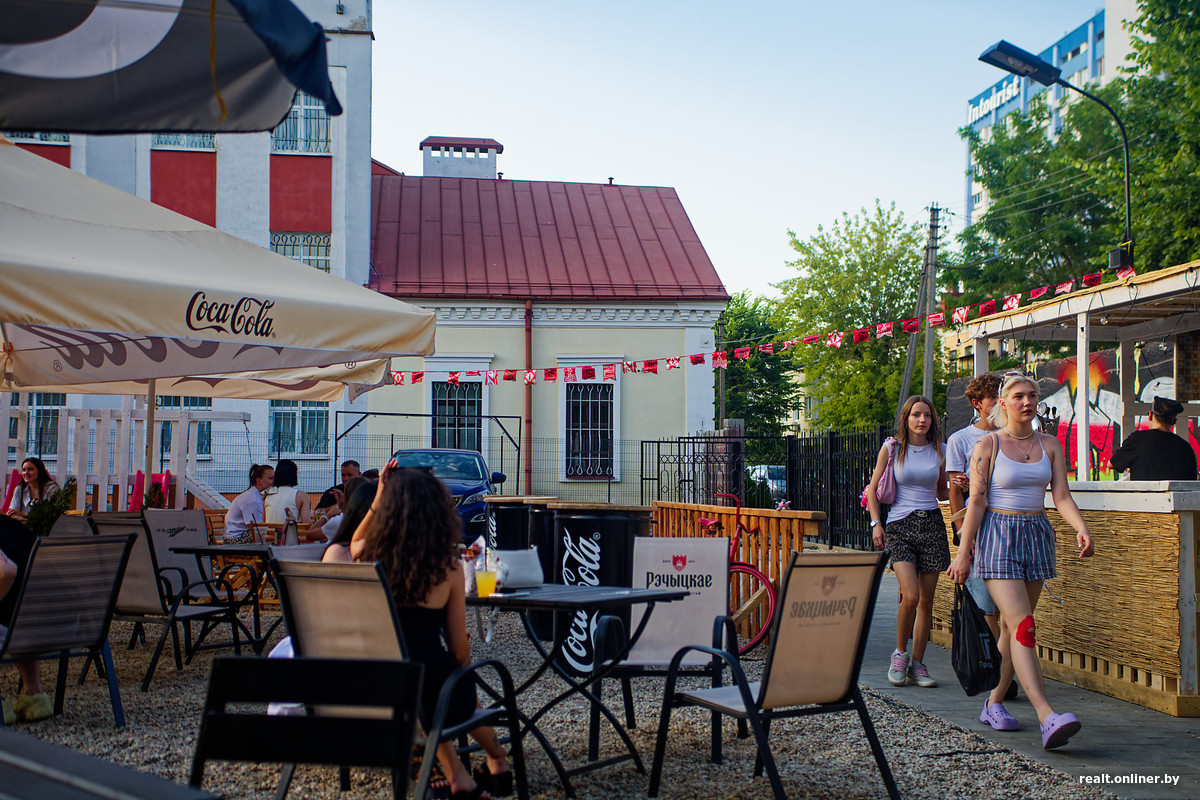 Визуально фуд-корт разделен на зоны: черная, белая и, скажем так, паллетная — для больших компаний. Паллеты расположены на возвышенности, откуда хорошо видна публика — под вечер здесь собираются не менее двух сотен человек. Вместе смотрят фильмы, прямые трансляции спортивных игр, танцуют. «Танцполом» служит белая галька. На шпильках не расслабишься, но владельцам хотелось намекнуть на курортный дух места.