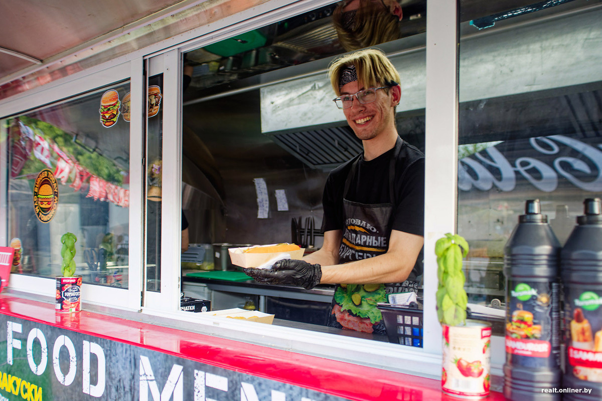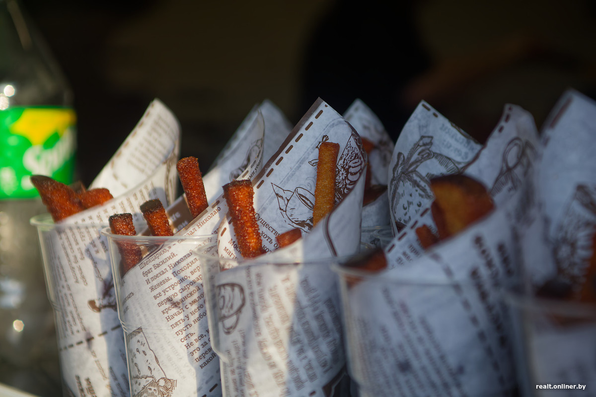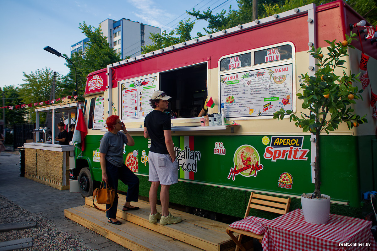 Если войти от синагоги, первый «вагон» — стойка с разливными напитками. За ней зеленый автобус, переделанный под фуд-трак, — итальянская тема: пицца, паста, кофе. «Красный» — это бургеры, хот-доги, наггетсы, луковые кольца… Резкий поворот — и глянцевый «Черный». Команда «Депо» его называет «соленый»: домашние пельмени, шаурма, панини в авторской разработке шефа. Оранжевый вагон — сладкий: блины с начинками, гонконгские вафли, чешские трдельники.