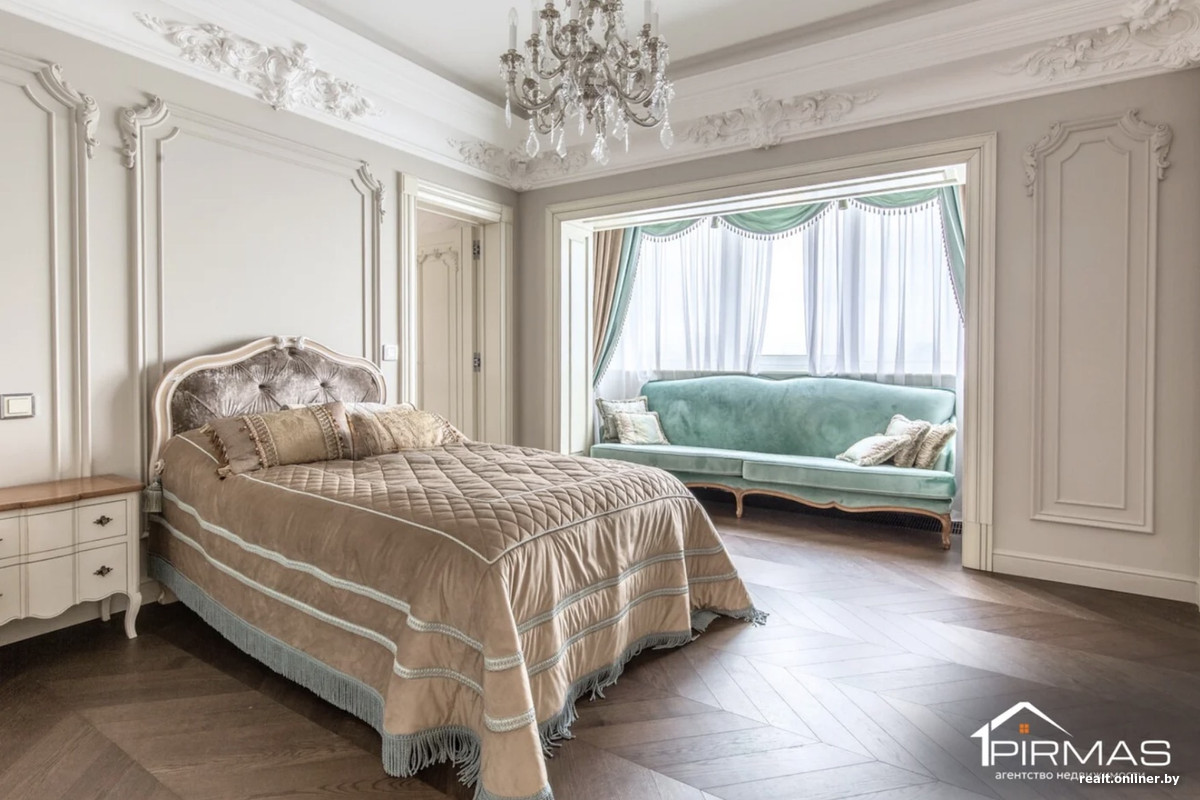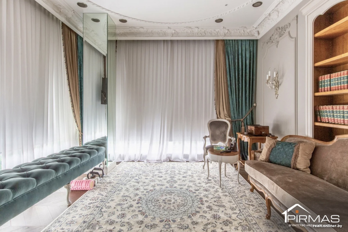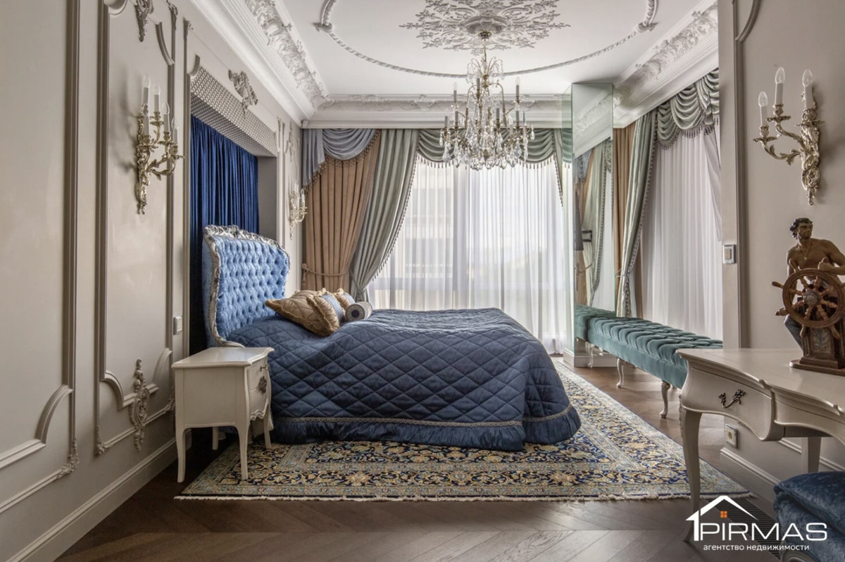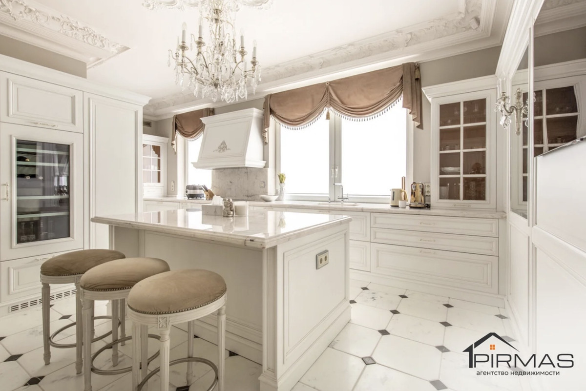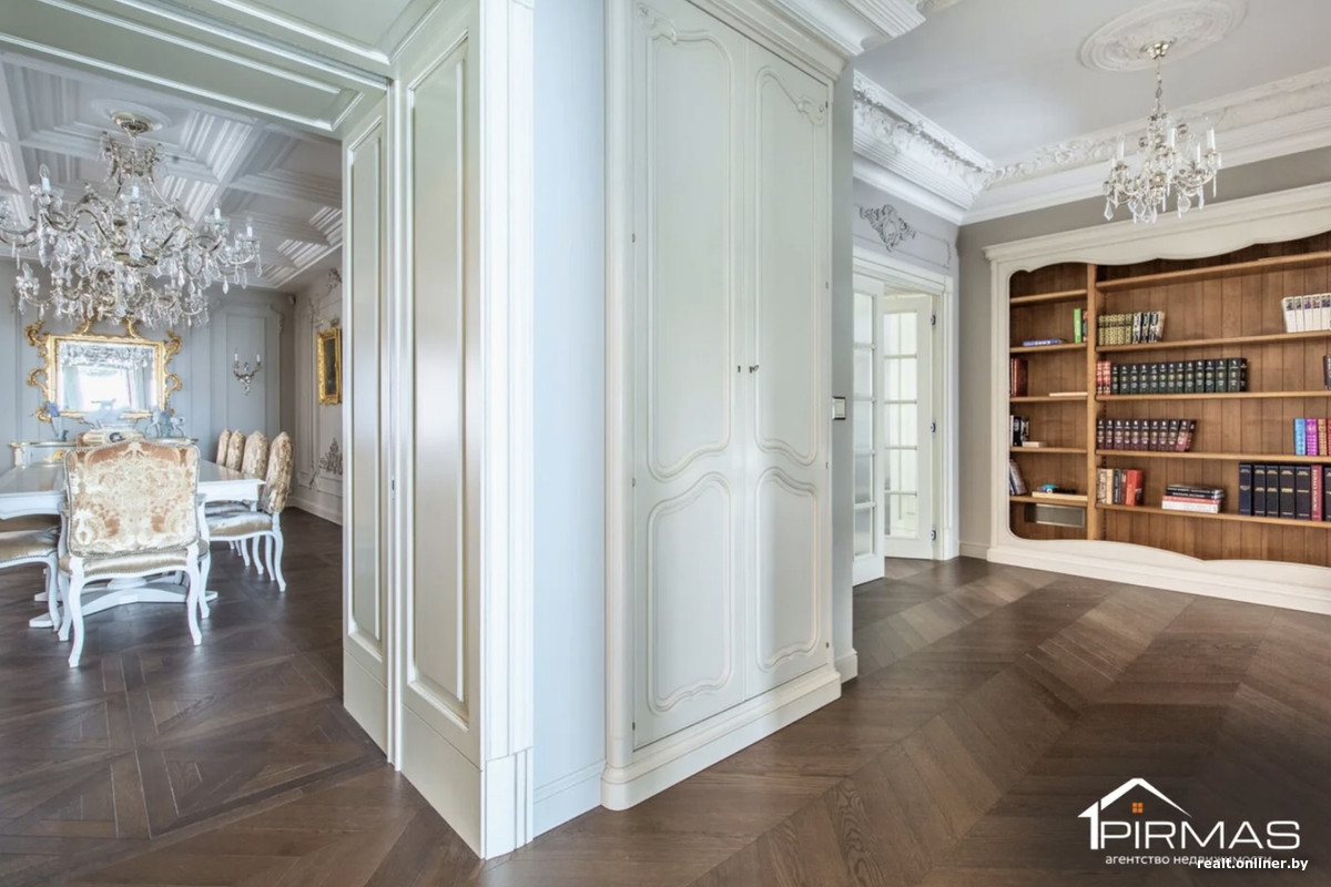 283 «квадрата», потолки 3,3 метра, полный ремонт и даже посуда от Versace — все это квартира на шестом этаже (из восьми). Интерьер — царско-классический. Воплотить его в жизнь и правда стоит очень дорого. Это вам не стены в белый цвет покрасить и на пол ламинат под дерево уложить. Каждая комната как музей.