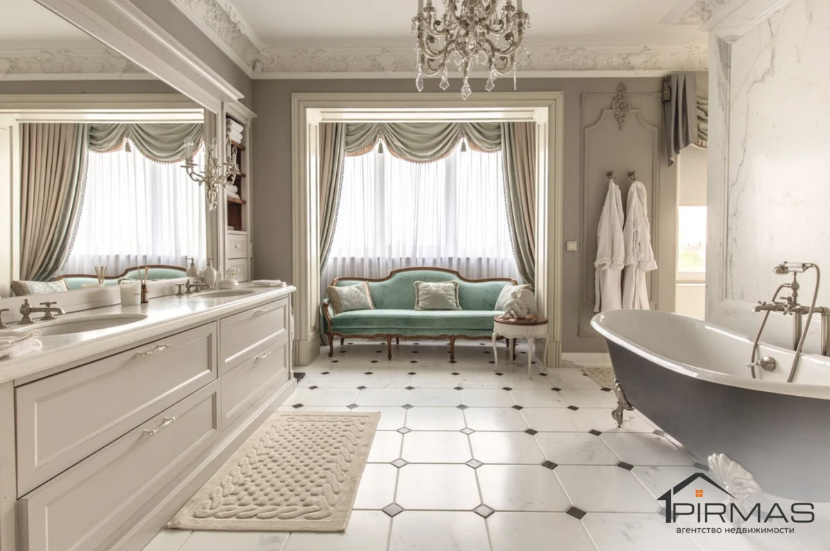 Что касается устройства квартиры, то оно следующее: «Просторный представительский холл при входе. Гостиная, объединенная со столовой зоной. Отдельная кухня. Основная спальня: собственная гардеробная и ванная комната с окном. Гостевая спальня: автономная гардеробная, санузел с душем, умывальником и туалетом. Кабинет с библиотекой. Постирочная с выдвижной кроватью для персонала. Отдельные хозяйственные и технические помещения», — проводит заочную экскурсию агентство.