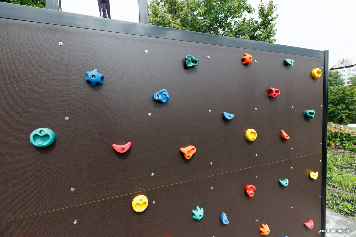 В сквере появилось несколько площадок для занятий спортом и отдыха. Выглядят они довольно современно. Есть стенка для скалолазания.
