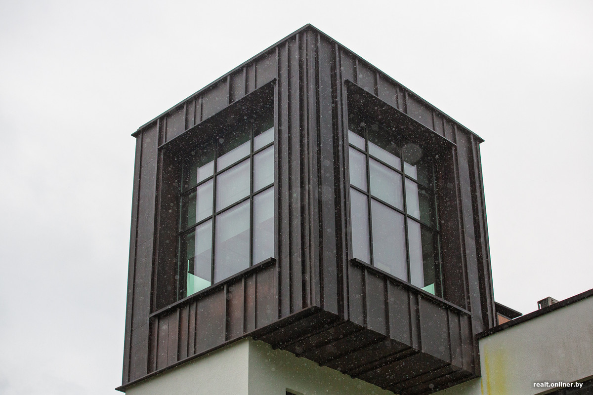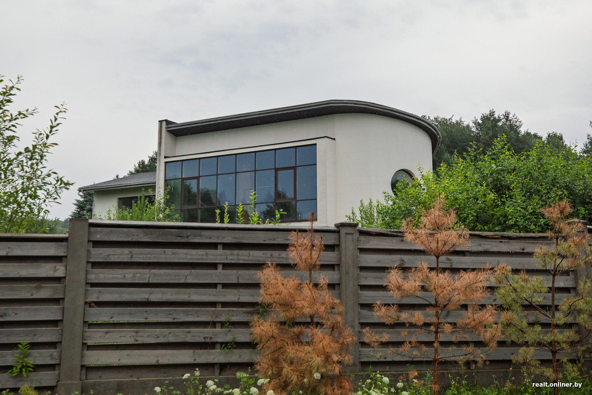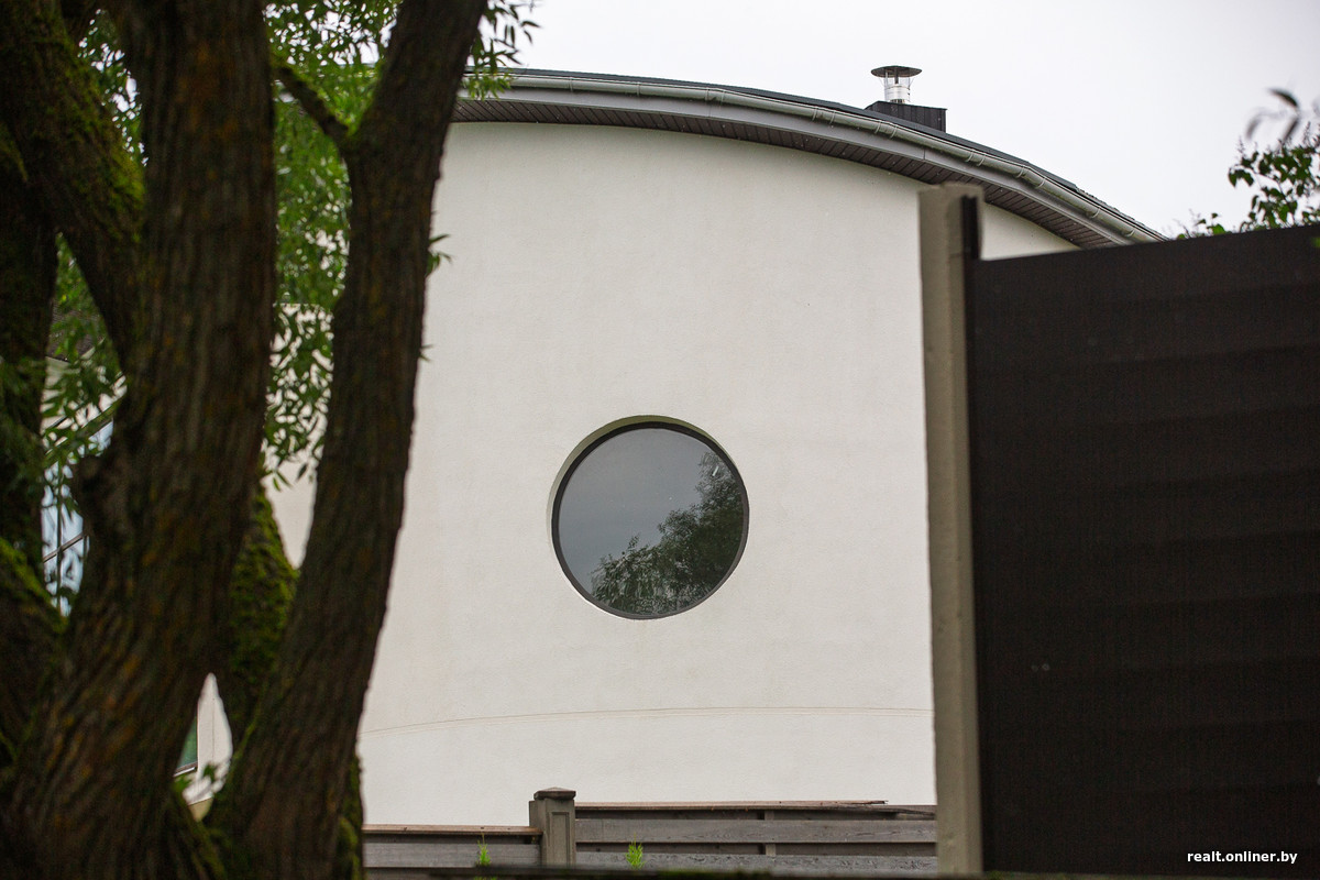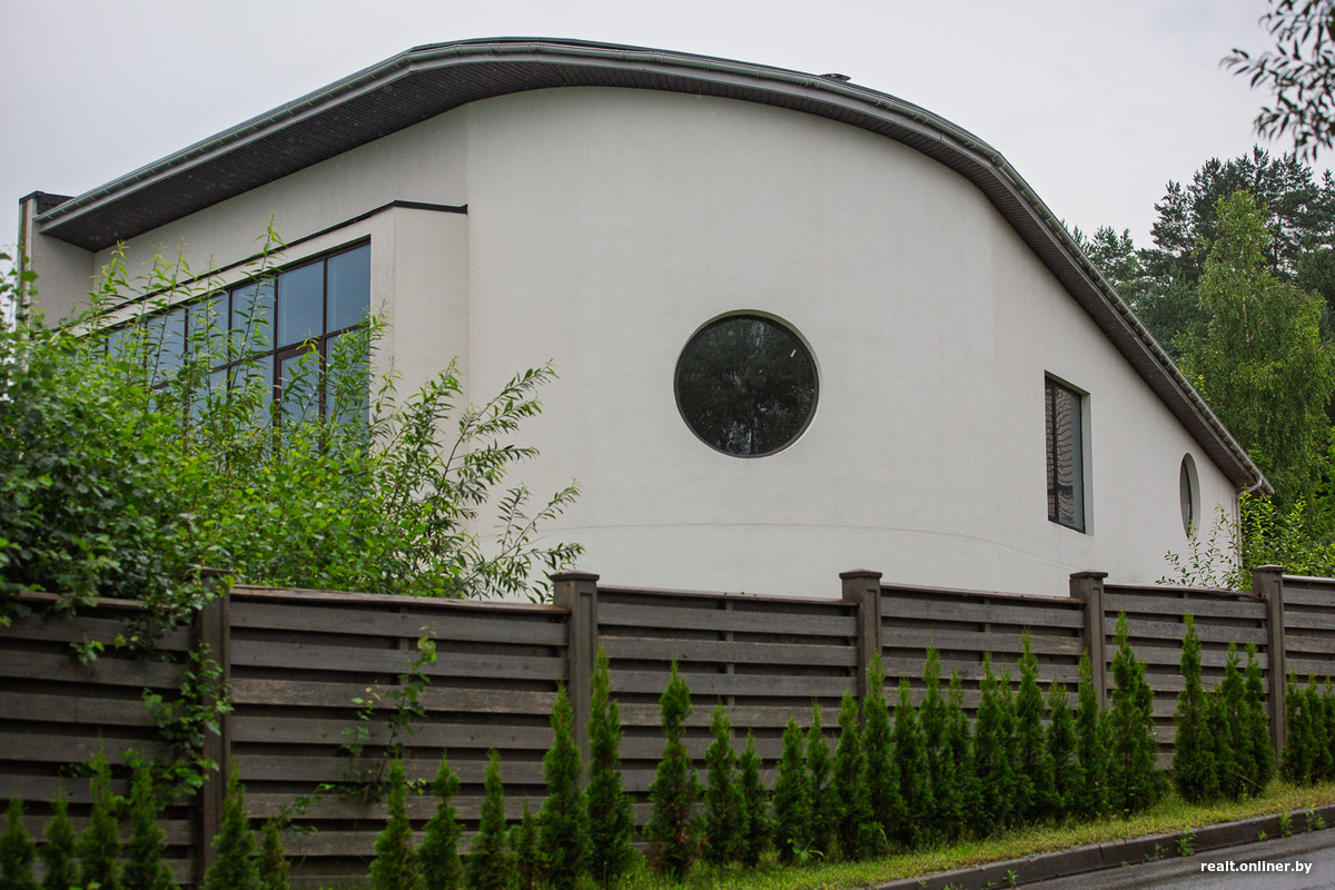 К третьему выпуску, посвященному загородной недвижимости, уже можно сделать вывод — минчане облюбовали стиль модернизм в архитектуре. Аккуратные брутальные коробки появились и продолжают появляться во многих поселках вокруг столицы. Данный экземпляр выделяется среди всей этой геометрии — те самые модернистские коробки здесь решили водрузить на круглую конструкцию. Получилось как минимум необычно. А что скажет архитектор?