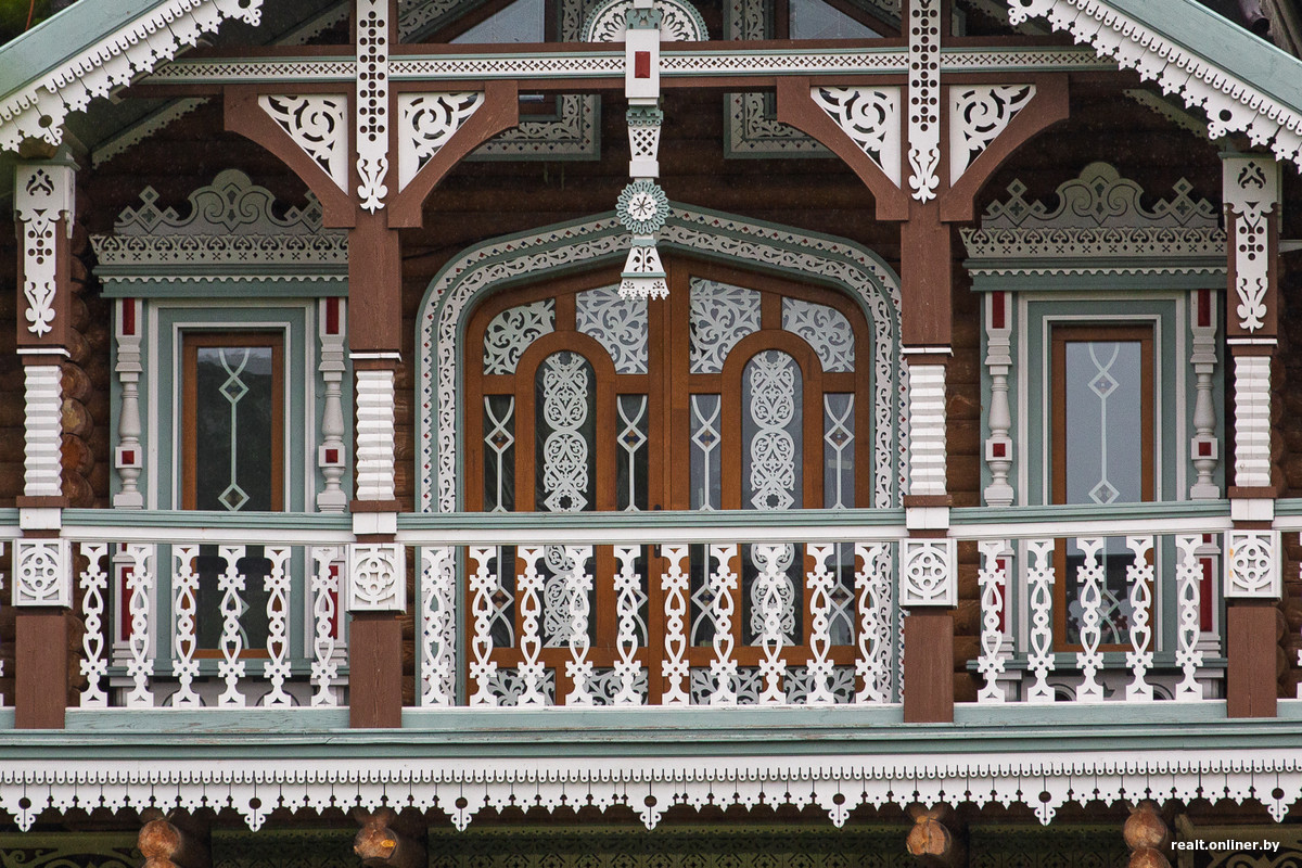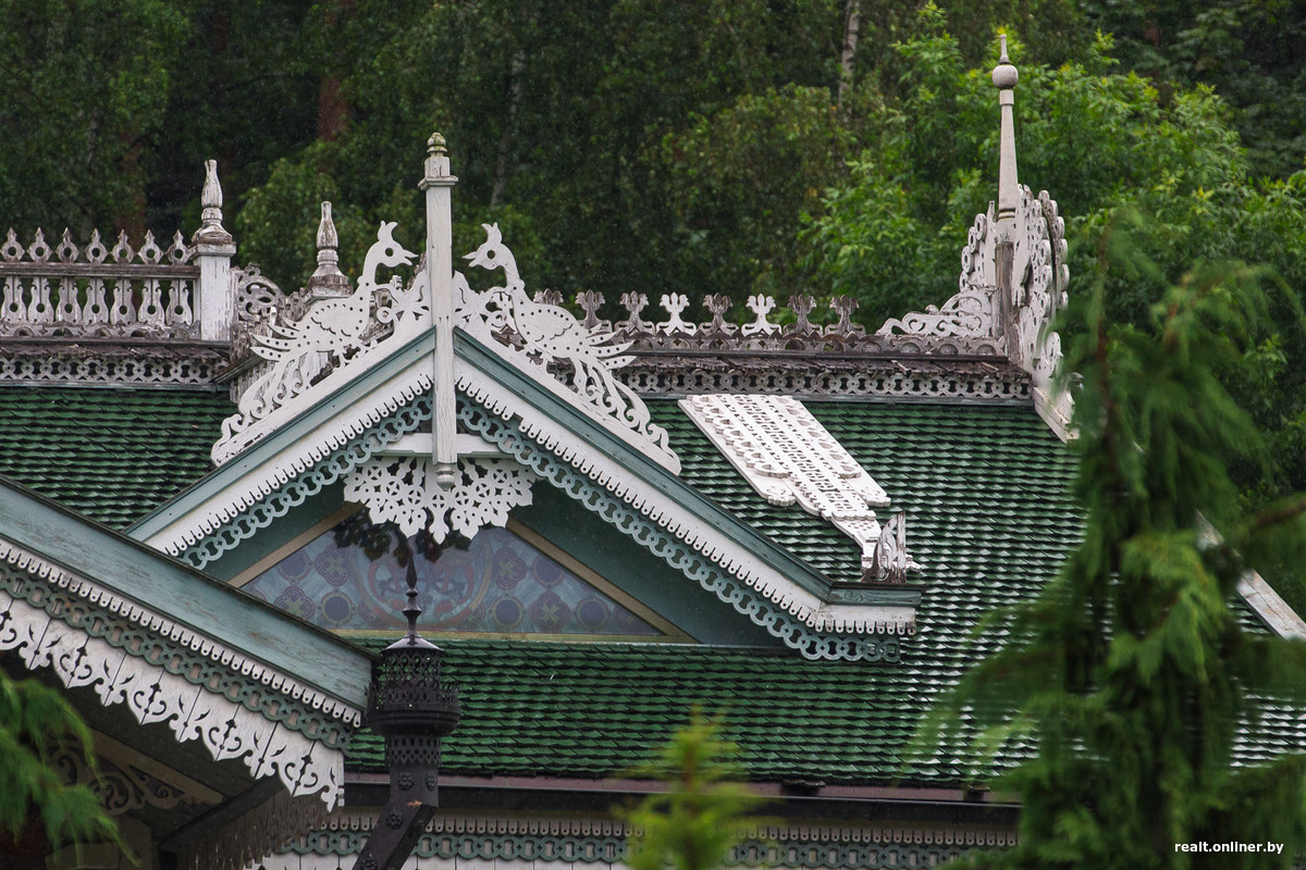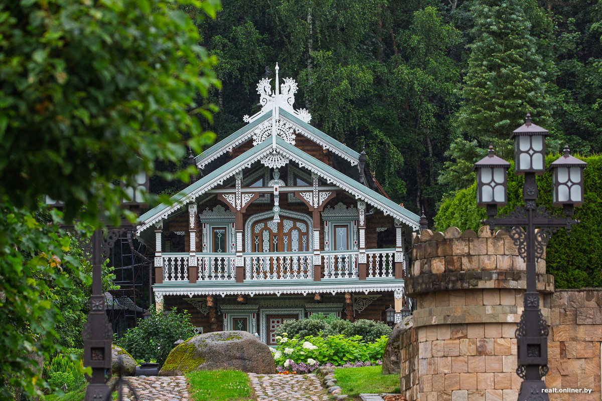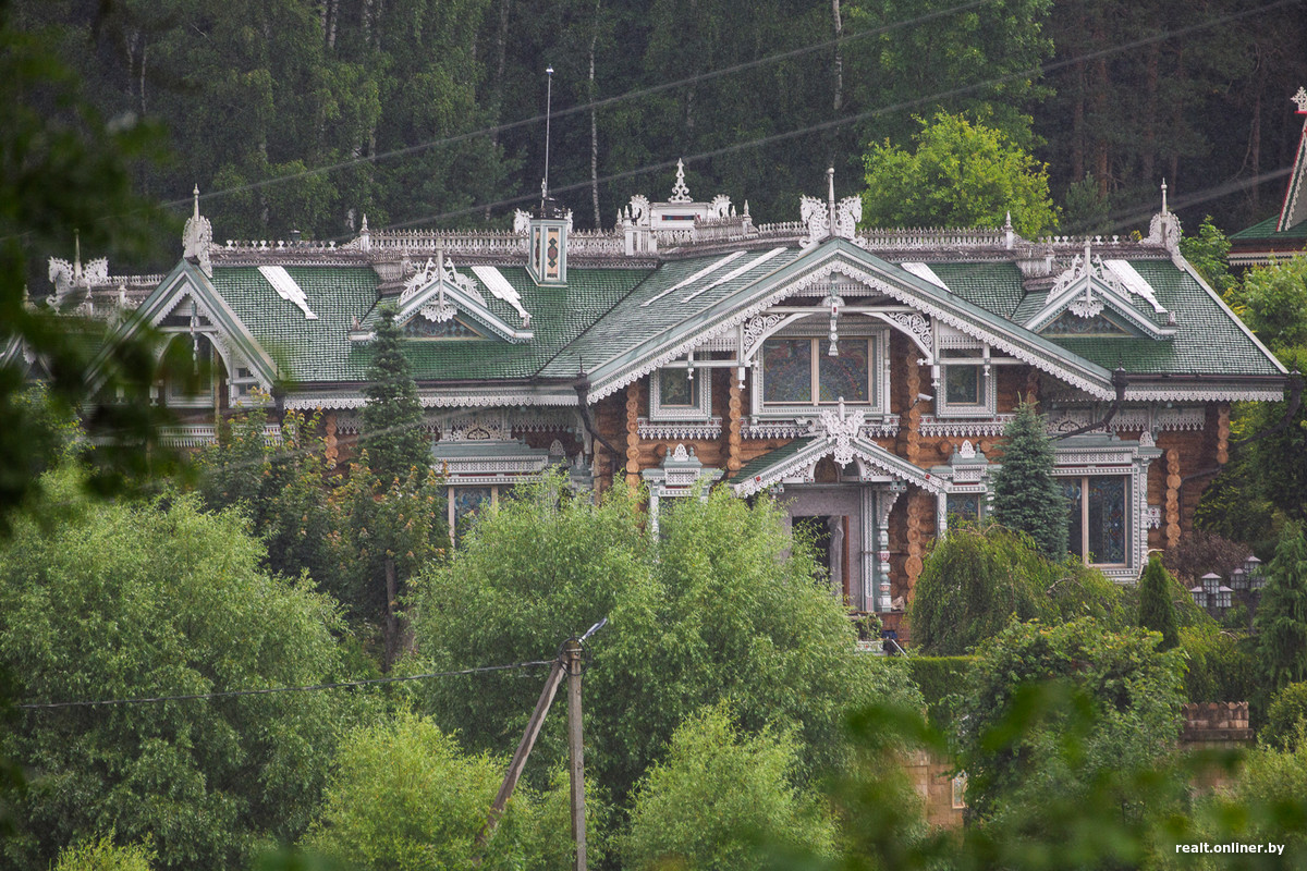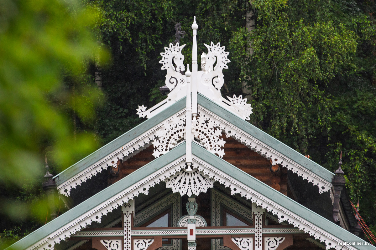Этот особняк является визитной карточкой Раубичей и виден с противоположного берега водохранилища. Сзади возвышаются высокие деревья, спереди стоят аккуратные туи. И в эту зеленую симфонию прекрасно вписывается зеленая крыша с резными элементами и бревенчатые фасады. Сразу вспоминается какая-нибудь русская сказка. Обратите внимание, что сказка продолжается и во дворе дома — с помощью выверенного ландшафтного дизайна.