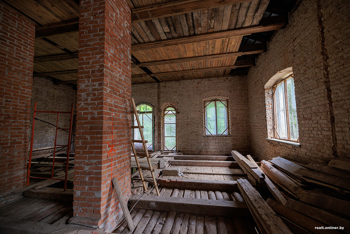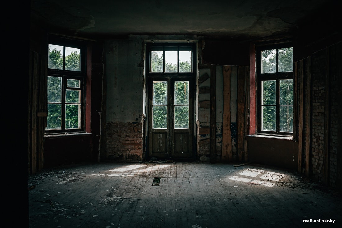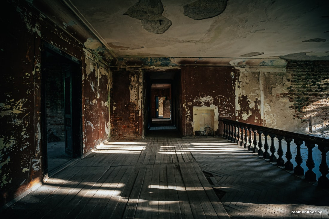 Главное здание потихоньку разрушалось: штукатурка осыпалась, часть интерьеров была утрачена, хотя еще видны фрагменты лепнины, сохранилась оригинальная винтовая лестница и двери. На окнах и потолках осталась советская символика, включая красные звезды.