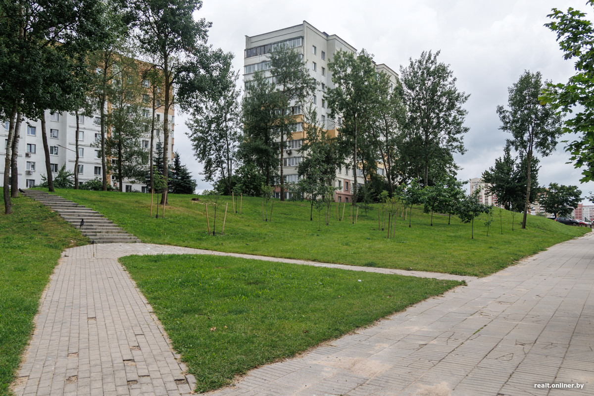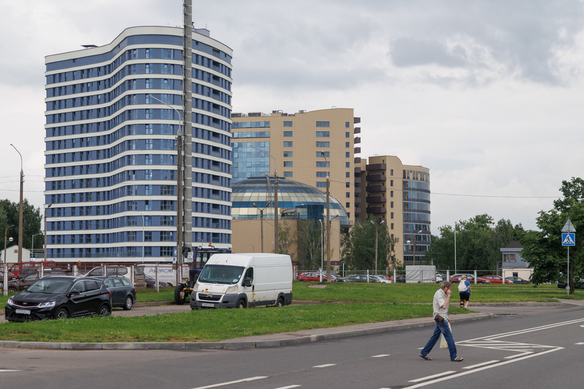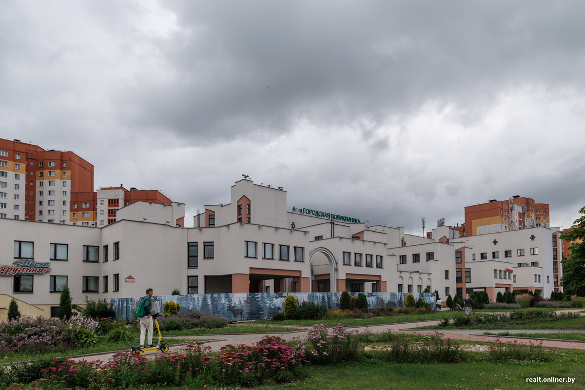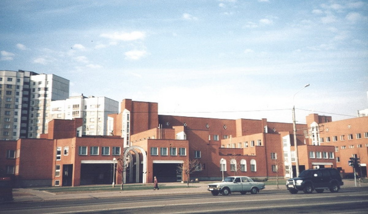 Итак, первый, восточный жилой комплекс у пересечения проспекта Победителей и улицы Тимирязева со Вторым транспортным кольцом, в отличие от двух других, размещен на спокойном, относительно ровном рельефе, что обусловило довольно замкнутую, почти периметральную композицию застройки. Эта застройка должна была акцентироваться на углу индивидуально запроектированным жилым домом переменной этажности из красного кирпича, со встроенными учреждениями обслуживания населения (планировались книжный магазин, отделения связи и «Союзпечати», магазин «Мелодия»). В конечном итоге здание построили только в 1998 году, и не очень понятно, по советскому ли еще проекту или это уже творчество архитекторов эпохи независимости. «Учреждения обслуживания населения», разумеется, открылись совсем иные.