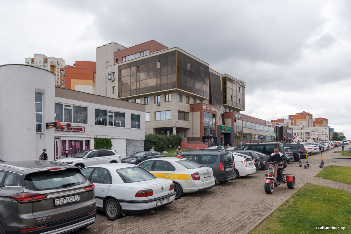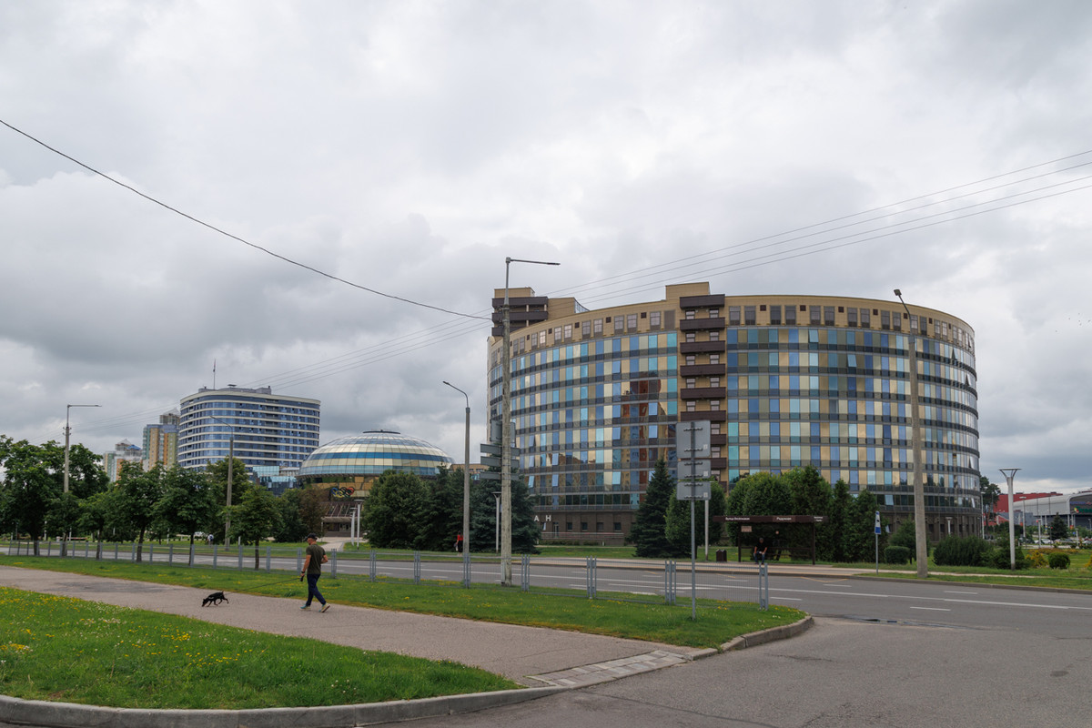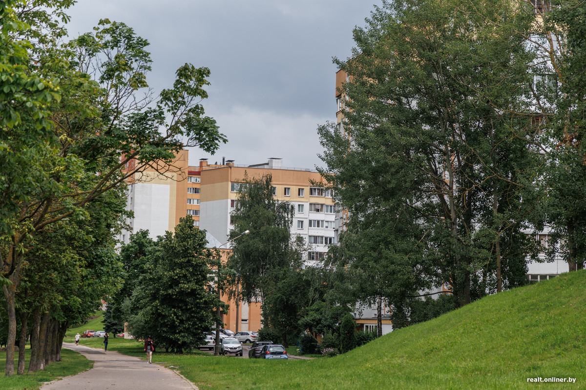 Итак, первый, восточный жилой комплекс у пересечения проспекта Победителей и улицы Тимирязева со Вторым транспортным кольцом, в отличие от двух других, размещен на спокойном, относительно ровном рельефе, что обусловило довольно замкнутую, почти периметральную композицию застройки. Эта застройка должна была акцентироваться на углу индивидуально запроектированным жилым домом переменной этажности из красного кирпича, со встроенными учреждениями обслуживания населения (планировались книжный магазин, отделения связи и «Союзпечати», магазин «Мелодия»). В конечном итоге здание построили только в 1998 году, и не очень понятно, по советскому ли еще проекту или это уже творчество архитекторов эпохи независимости. «Учреждения обслуживания населения», разумеется, открылись совсем иные.
