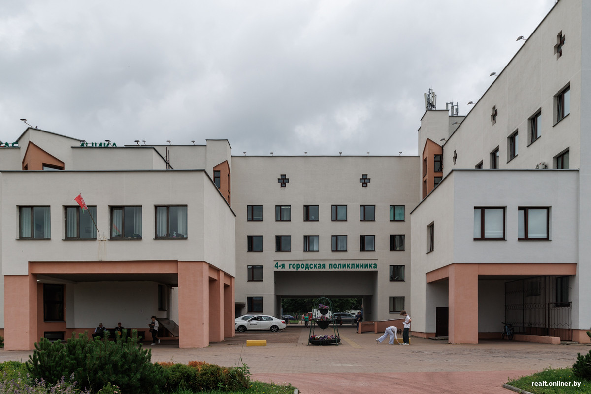 По общественно-торговому центру Веснянки вообще очень хорошо чувствуется постмодернистский перелом, принесенный перестройкой в советскую архитектуру. На снимках ниже — городская поликлиника №4 (арх. В. Крусь), некогда краснокирпичная со стильно контрастирующими отдельными выбеленными элементами.